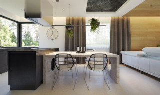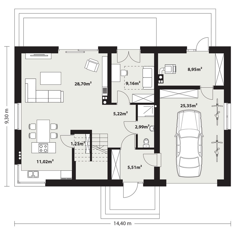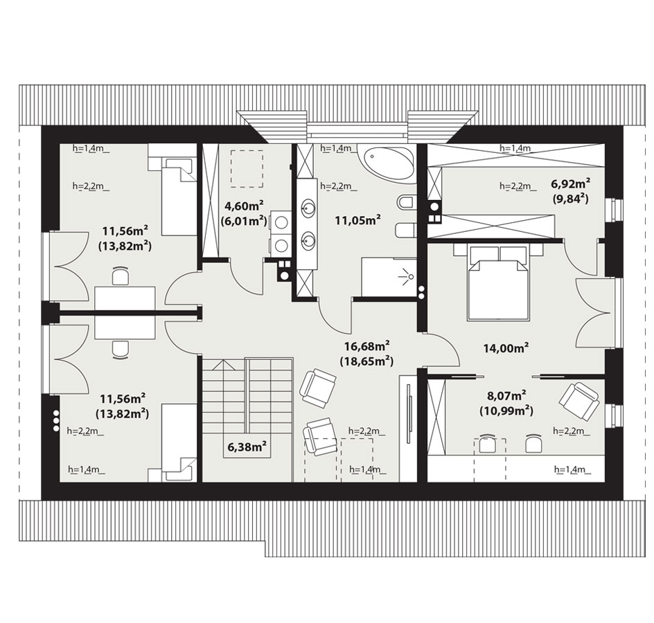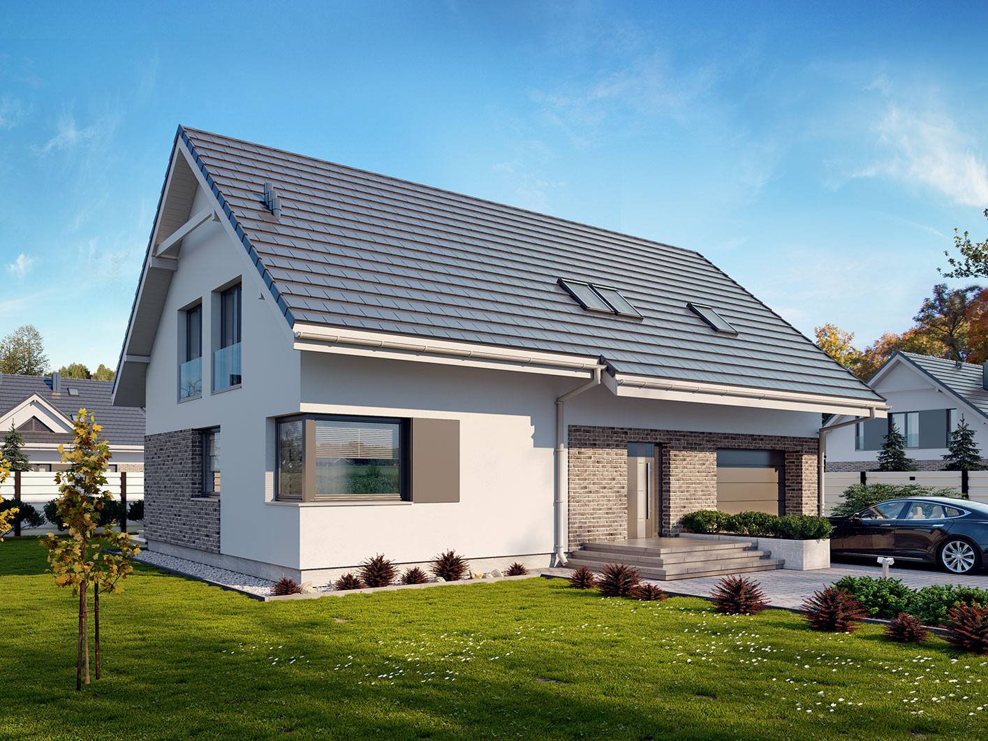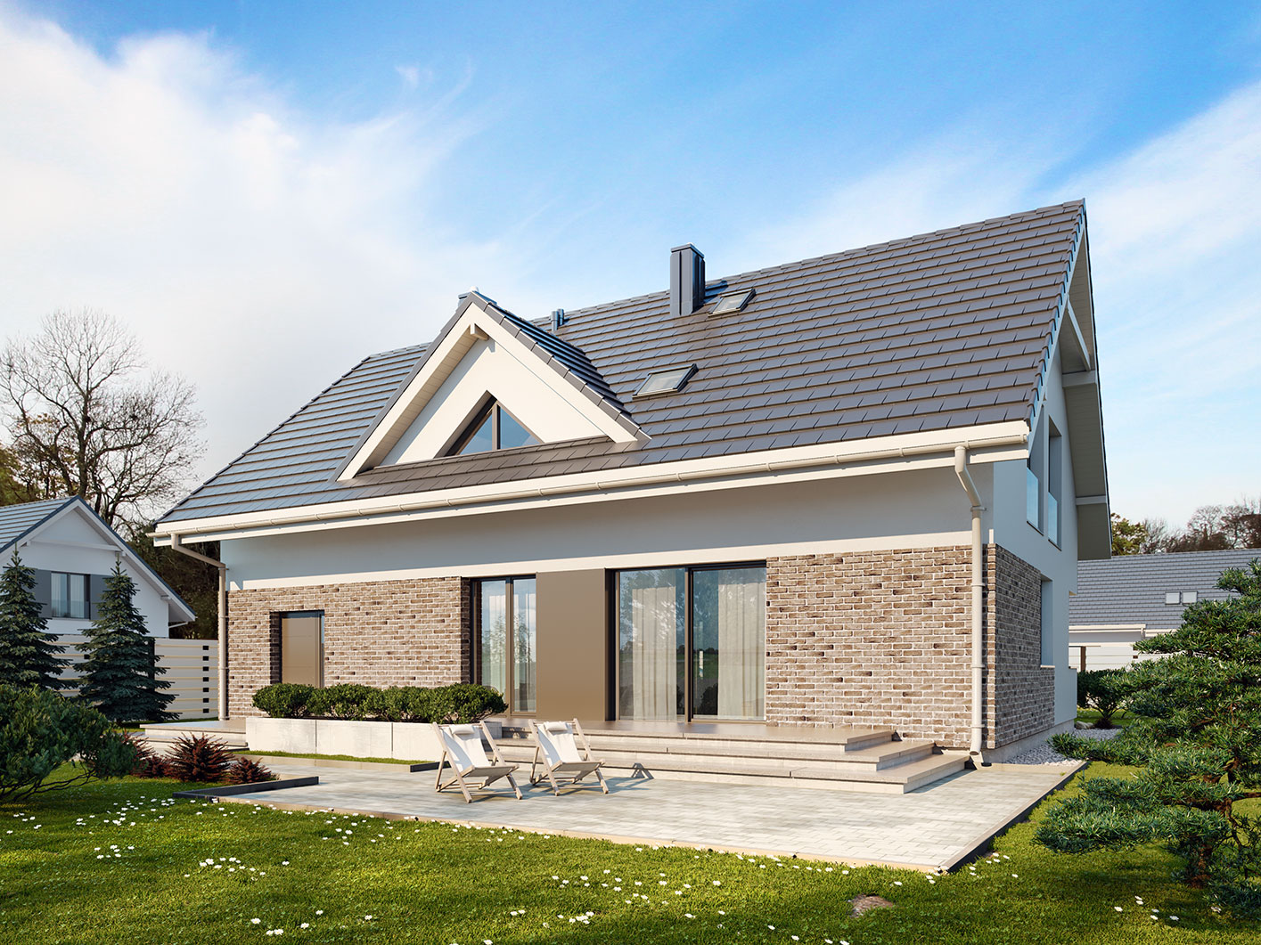 Markus 2 to dom parterowy z użytkowym poddaszem, o klarownym podziale na strefy funkcjonalne. Na parterze po lewej stronie od wejścia znajduje się strefa dzienna: kuchnia, ze spiżarnią pod schodami, jadalnia oraz pokój dzienny z wyjściem na taras. Po prawej stronie od wejścia wydzielono strefę garażową na półtora stanowiska oraz obszerną kotłownię z wyjściem na zewnątrz. W strefie środkowej zaprojektowano dodatkową sypialnię oraz łazienkę ogólnodostępną. Poddasze użytkowe stanowi strefę prywatną obejmującą główną sypialnię z garderobą oraz gabinetem, przestronną łazienkę, dwie sypialnie dziecięce oraz przestrzeń rekreacyjną w holu doświetlonym oknami dachowymi.