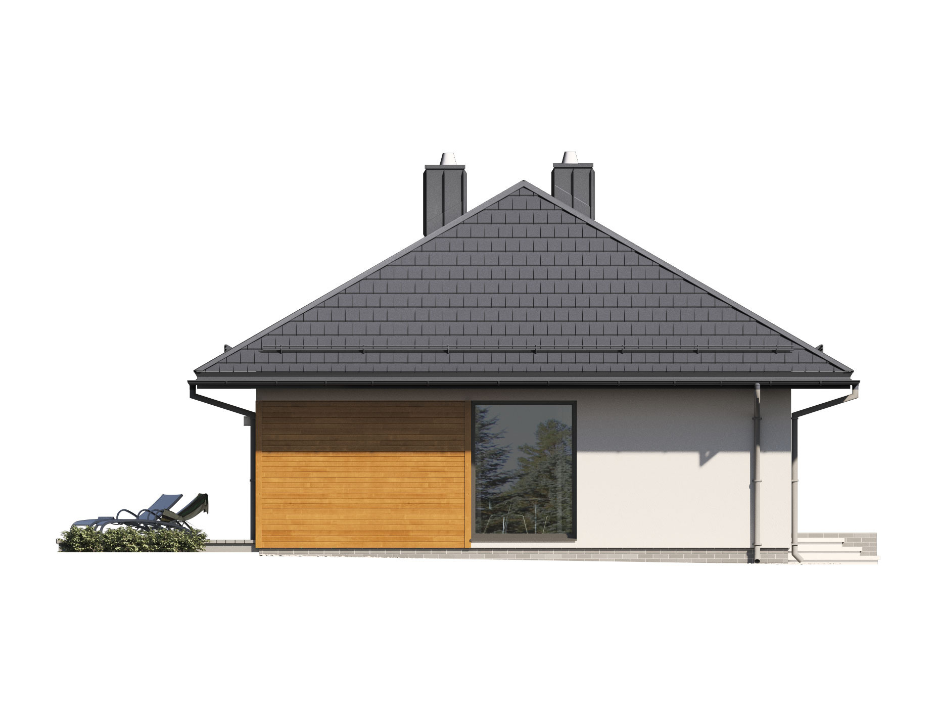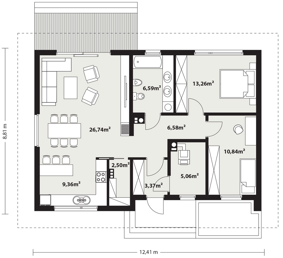 Lori drewniany to projekt parterowego domu jednorodzinnego zapewniającego optymalne potrzeby 3-4-osobowej rodziny. Jest to dom bardzo funkcjonalny z wyraźnym podziałem na strefy. Przestronna część dzienna to proste i klasyczne połączenie salonu, jadalni i kuchni, zaś strefa intymna składa się z 2 sypialni i łazienki. Dom posiada duży taras umożliwiający spędzanie czasu na świeżym powietrzu niezależnie od warunków pogodowych. Wejście do domu jest przez niewielki podcień chroniący przed deszczem i słońcem. Bryła budynku zamknięta jest na rzucie prostokąta, przykrytego kopertowym dachem. Taka forma budynku czyni go prostym w budowie i tanim w eksploatacji.