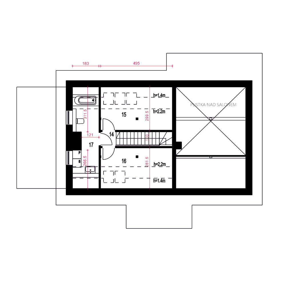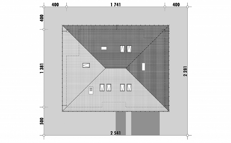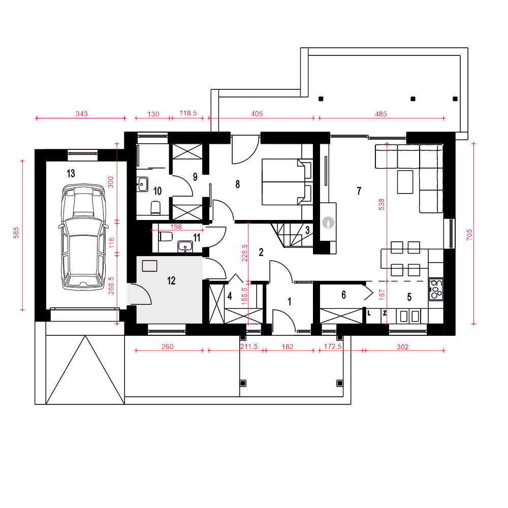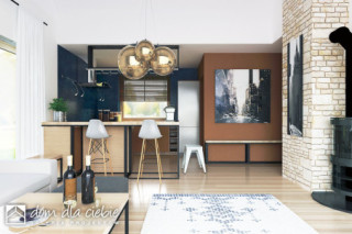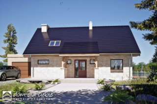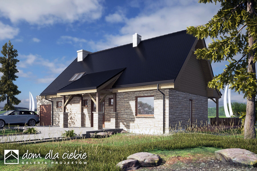 Projekt domu jednorodzinnego z poddaszem użytkowym dla 4 osobowej rodziny oraz garażem. Prosta bryła jest przekryta dwuspadowym dachem o kącie nachylenia 45 stopni. Dzięki nieskomplikowanej bryle dom będzie tani i prosty w budowie i eksploatacji. Charakter budynku podkreślają wykończenia elewacji okładzina kamienna oraz drewniane wykończenia. Salon z jadalnią nie ma sufitu podwieszanego i jest otwarty aż do dachu. W salonie przewidziano kominek. Kuchnia jest otwarta i umeblowana w kształcie litery L . Obok kuchni zaproponowano stół jadalny. W strefie wejściowej zaprojektowano duży hol, do którego prowadzi wiatrołap. Hol rozprowadza do garderoby, pomieszczenia technicznego, WC, pokoju dla dwóch osób oraz na poddasze. Dwuosobowa sypialnia posiada indywidualna przejściową garderobę oraz niewielka łazienkę z natryskiem. Na poddaszu mamy dwie sypialne oraz łazienkę z pralnia i suszarnią. Projekt Ziomek dedykowany jest szczególnie na tereny podmiejskie, do nowej i starej zabudowy