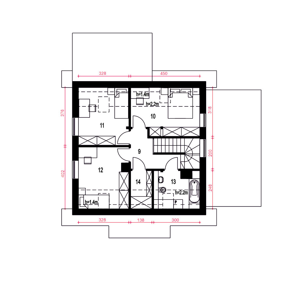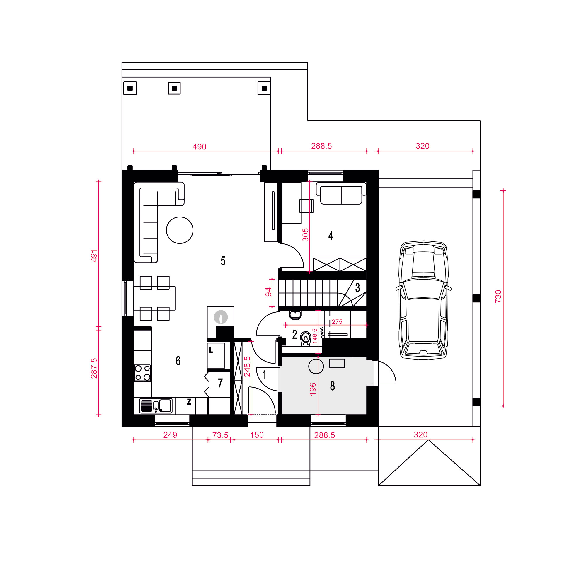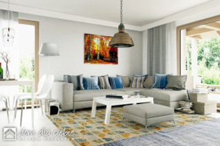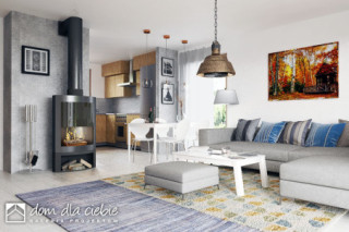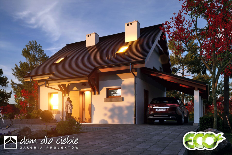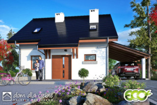 Ekonomiczny, projekt niewielkiego domu jednorodzinnego z dwuspadowym dachem oraz wiatą. Daktyl przewidziany jest dla czteroosobowej rodziny. Główne, zadaszone wejście prowadzi do wiatrołapu. Stąd można dostać się do pomieszczenia technicznego oraz do mieszkalnej części dziennej. Pod częścią biegu schodowego zaprojektowano łazienkę. Z salonem połączony jest pokój gościnny. Kuchnia jest otwarta i posiada spiżarnię. W centralnej części domu zaprojektowano kominek. Obok kuchni przewidziano miejsce na stół. Z salonu wchodzi się schodami na poddasze, gdzie zlokalizowano trzy sypialnie oraz łazienkę z pralką. Daktyl to propozycja ekonomicznego i ekologicznego domu, który doskonale sprawdzi się jako dom całoroczny.