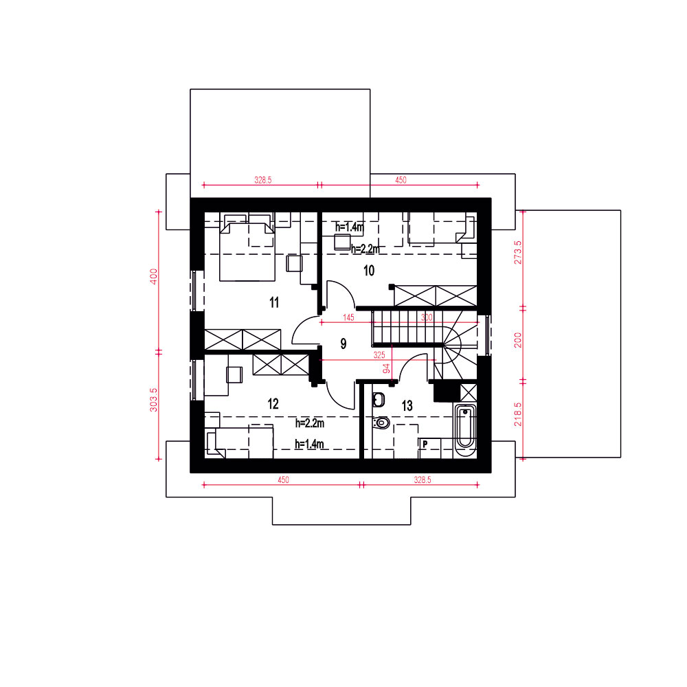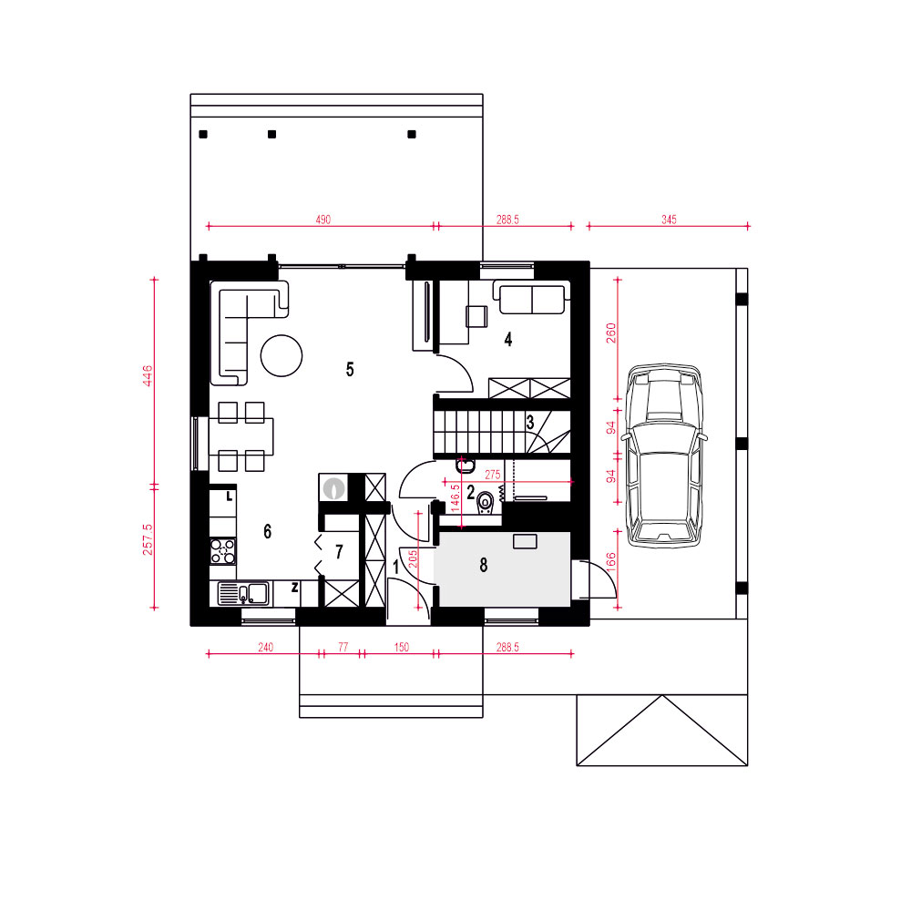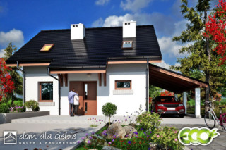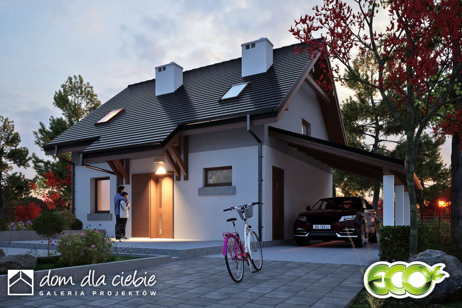 Ekonomiczny, projekt niewielkiego domu jednorodzinnego z dwuspadowym dachem oraz wiatą. Figa przewidziana jest dla czteroosobowej rodziny. Jest to propozycja projektu do 70 m2 powierzchni zabudowy nie licząc zadaszonego tarasu oraz wiaty. Główne, zadaszone wejście prowadzi do wiatrołapu. Stąd można dostać się do pomieszczenia technicznego oraz do mieszkalnej części dziennej. Pod częścią biegu schodowego zaprojektowano łazienkę. Z salonem połączony jest gabinet. Kuchnia jest otwarta i posiada niewielka spiżarnię. W centralnej części domu zaprojektowano kominek. Obok kuchni przewidziano miejsce na stół. Z salonu wchodzi się schodami na poddasze, gdzie zlokalizowano trzy niewielki sypialnie oraz łazienkę z pralką. Figa to propozycja ekonomicznego i ekologicznego domu, który doskonale sprawdzi się jako dom całoroczny.