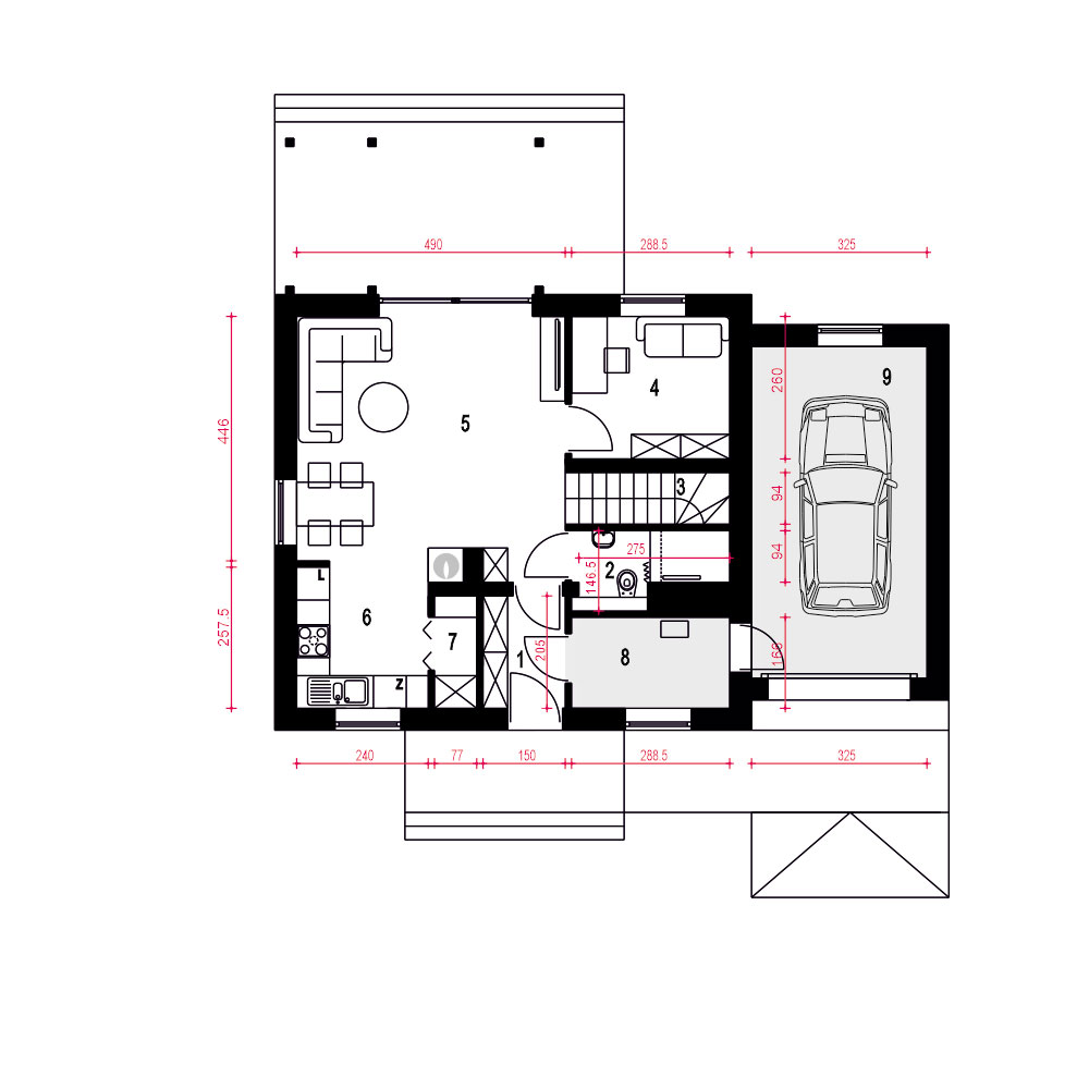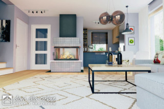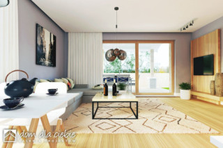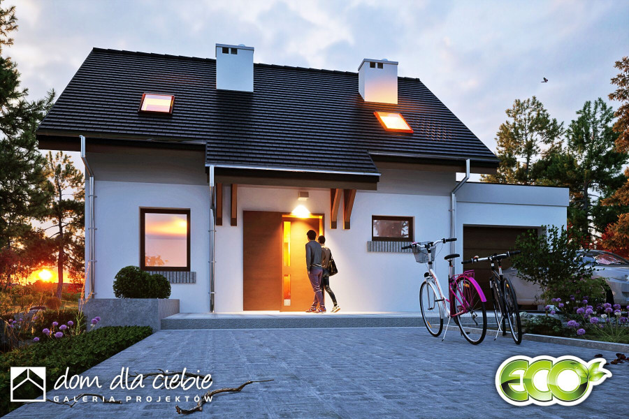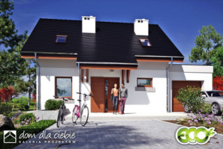 Ekonomiczny, projekt niewielkiego domu jednorodzinnego z dwuspadowym dachem oraz garażem. Figa przewidziana jest dla czteroosobowej rodziny. Główne, zadaszone wejście prowadzi do wiatrołapu. Stąd można dostać się do pomieszczenia technicznego oraz do mieszkalnej części dziennej. Pod częścią biegu schodowego zaprojektowano łazienkę. Z salonem połączony jest gabinet. Kuchnia jest otwarta i posiada spiżarnię. W centralnej części domu zaprojektowano kominek. Obok kuchni przewidziano miejsce na stół. Z salonu wchodzi się schodami na poddasze, gdzie zlokalizowano trzy sypialnie oraz łazienkę z pralką. Figa to propozycja ekonomicznego i ekologicznego domu, który doskonale sprawdzi się jako dom całoroczny.