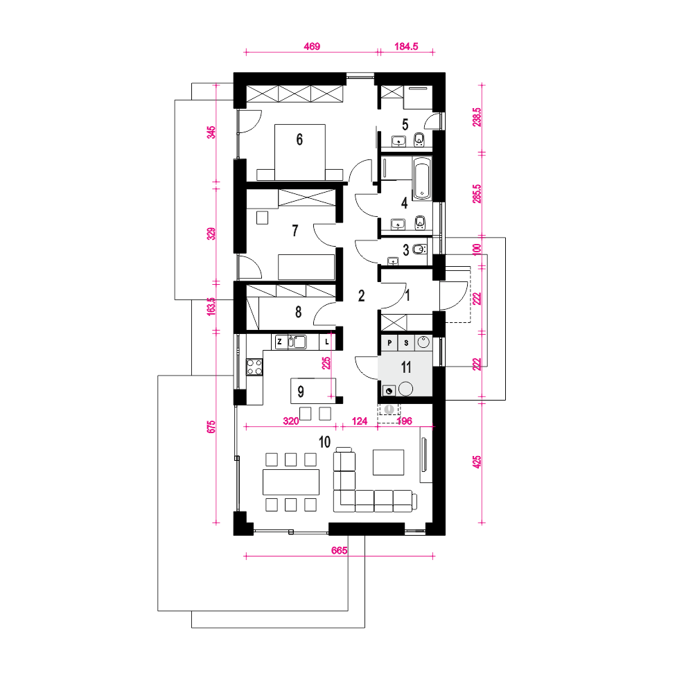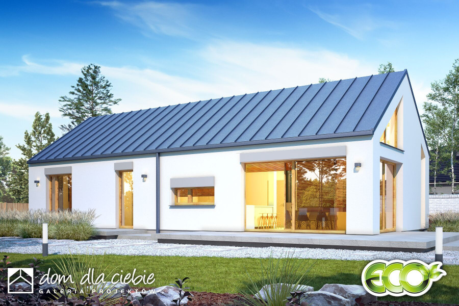 Projekt domu jednorodzinnego Natan IV to nowa mniejsza wersja projektu Natan III, nowoczesnych dom typu stodoła. Dom zaprojektowany jest na planie wydłużonego prostokąta, z prostym dwuspadowym dachem. Jest to propozycja kompaktowego domu parterowego przeznaczonego dla trzy lub czteroosobowej rodziny. Projekt posiada sporych h rozmiarów strefę dzienną z dużą kuchnią, salonem i jadalnią, nad którymi zaprojektowano otwarty strop oraz funkcjonalną strefę nocną z dwiema sypialniami w tym jedna z prywatną łazienką, duża ogólnodostępna łazienka z oknem, toaleta oraz kotłownia z pralnią. Projekt przewiduje nowoczesne rozwiązania instalacyjne: wentylację mechaniczną oraz piec gazowy oraz prostą konstrukcję i bryłę, co z pewnością będzie miało przełożenie w kosztach budowy i odczuwalne w trakcie realizacji.fundamenty: BETONOWE ściany zewnętrzne: PUSTAK CERAM. POROTHERM+STYROPIAN TERMO ORGANIKA ściany wewnętrzne: PUSTAK POROTHERM rodzaj stropu: DRERWNIANY elewacje: TYNK STRUKTURALNY pokrycie dachu: BLACHA