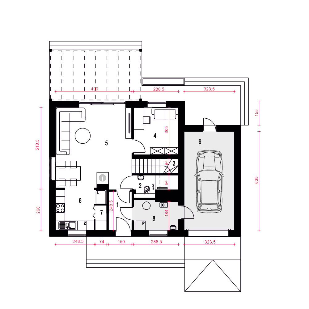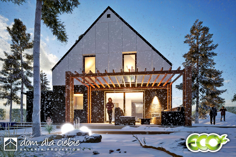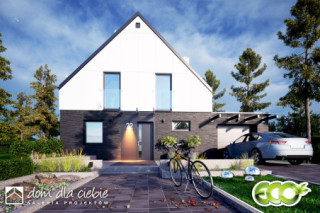 Ekonomiczny, projekt nowoczesnego domu jednorodzinnego z dwuspadowym bezokapowym dachem oraz garażem. Daktyl przewidziany jest dla czteroosobowej rodziny. Główne, zadaszone wejście prowadzi do wiatrołapu. Stąd można dostać się do pomieszczenia technicznego oraz do mieszkalnej części dziennej. Pod częścią biegu schodowego zaprojektowano łazienkę. Z salonem połączony jest pokój gościnny. Kuchnia jest otwarta i posiada spiżarnię. W centralnej części domu zaprojektowano kominek. Obok kuchni przewidziano miejsce na stół. Z salonu wchodzi się schodami na poddasze, gdzie zlokalizowano trzy sypialnie oraz łazienkę z pralką. Daktyl II to propozycja ekonomicznego i ekologicznego domu, który doskonale sprawdzi się jako dom całoroczny.fundamenty: BETONOWE ściany zewnętrzne: POROTHERM+STYROPIAN TERMO ORGANIKA ściany wewnętrzne: POROTHERM rodzaj stropu: TERIVA elewacje: TYNK STRUKTURALNY pokrycie dachu: DACHÓWKA CERAMICZNA