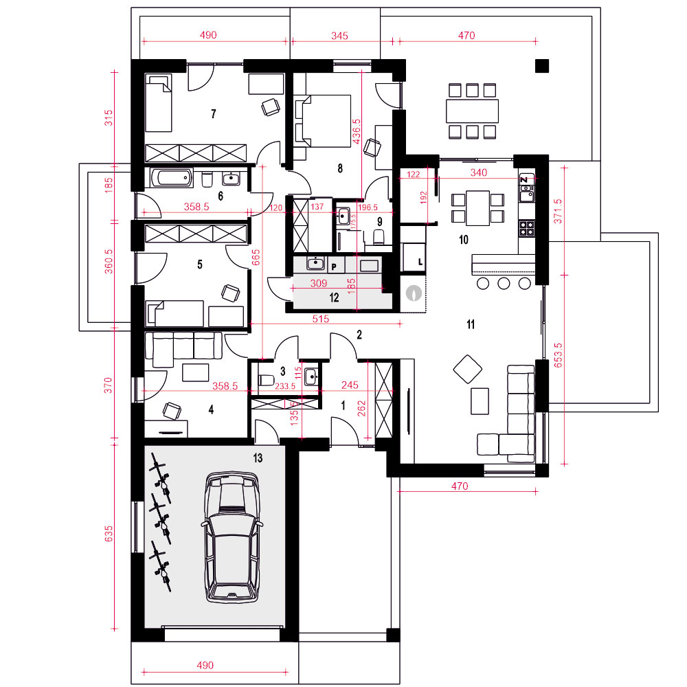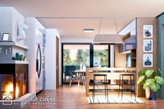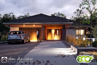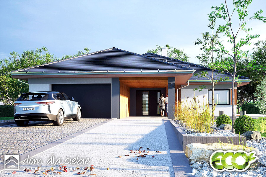 Aura to propozycja domu dedykowanego 4-5 osobowej rodzinie. Prosta bryła budynku przewidziana na planie kwadratu z dobudowanym garażem została przekryta wielospadowym dachem. Nowoczesna stylistyka elewacji stawia na naturalne barwy i materiały. Funkcja domu to 3 pokoje sypialne w tym jedna dwuosobowa z osobną łazienką i garderobą a także wspólna łazienka dla pozostałych mieszkańców. Dodatkowy pokój przewidziany jest jako gabinet, pomieszczenie do pracy zdalnej, dodatkowa sypialnia lub pokój gościnny. Aura kryje w swej bryle również salon z jadalnią i otwartą kuchnią ze spiżarnią. W strefie wejściowej z najdziemy dodatkową garderobę i wc. Ze stanowiącego serce domu salonu dostaniemy się na taras. Dom nadaje się na działki z wjazdem od strony południowej.fundamenty: BETONOWE ściany zewnętrzne: POROTHERM+STYROPIAN TERMO ORGANIKA rodzaj stropu: TERIVA I elewacje: TYNK STRUKTURALNY pokrycie dachu: DACHÓWKA CEM. lub CER.