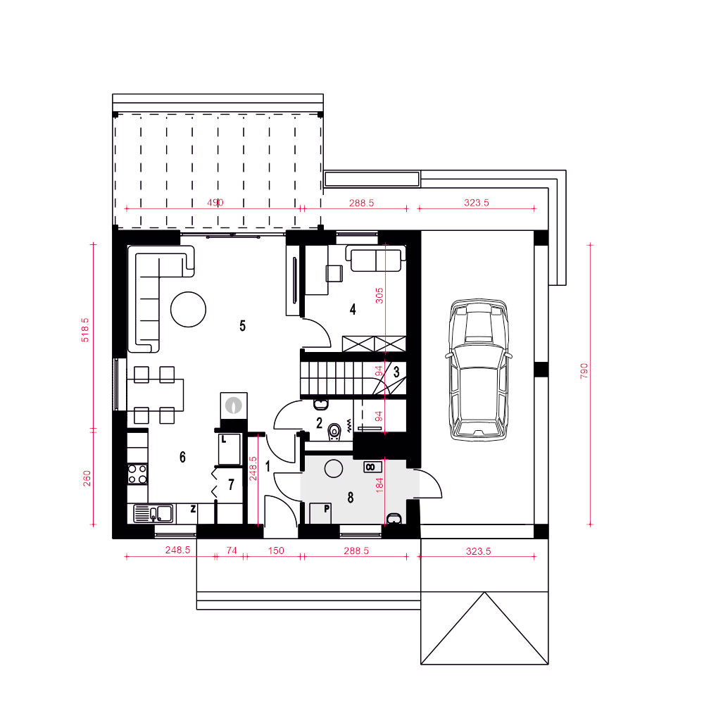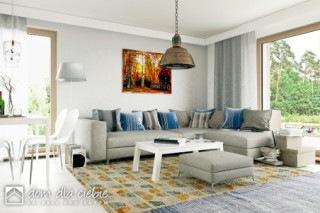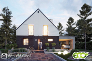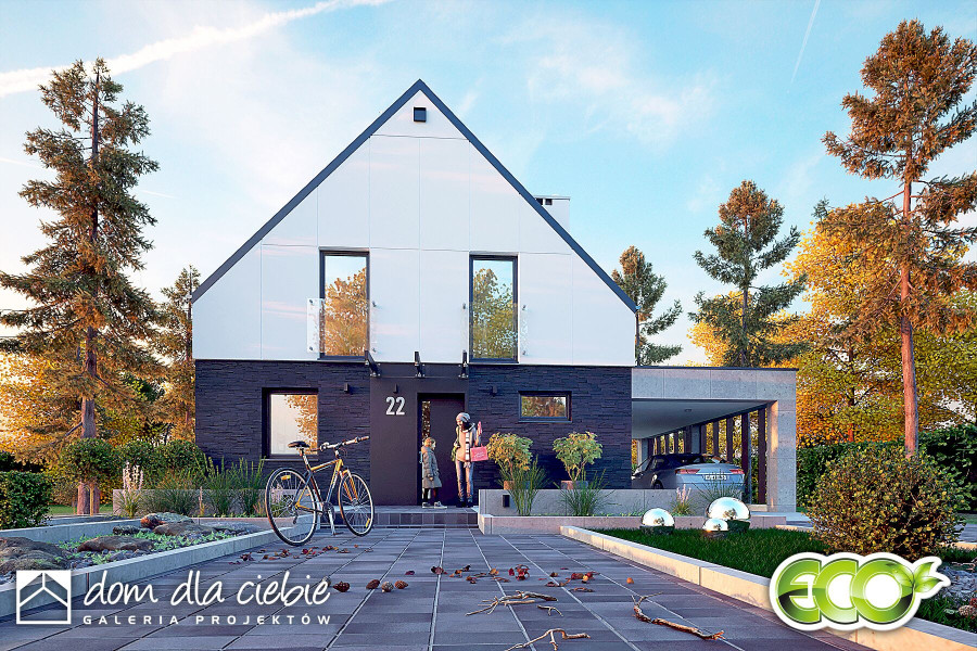 Ekonomiczny, projekt nowoczesnego domu jednorodzinnego z dwuspadowym bezokapowym dachem oraz wiatą. Daktyl II przewidziany jest dla czteroosobowej rodziny. Główne, zadaszone wejście prowadzi do wiatrołapu. Stąd można dostać się do pomieszczenia technicznego oraz do mieszkalnej części dziennej. Pod częścią biegu schodowego zaprojektowano łazienkę. Z salonem połączony jest pokój gościnny. Kuchnia jest otwarta i posiada spiżarnię. W centralnej części domu zaprojektowano kominek. Obok kuchni przewidziano miejsce na stół. Z salonu wchodzi się schodami na poddasze, gdzie zlokalizowano trzy sypialnie oraz łazienkę z pralką. Daktyl II to propozycja ekonomicznego i ekologicznego domu, który doskonale sprawdzi się jako dom całoroczny.