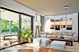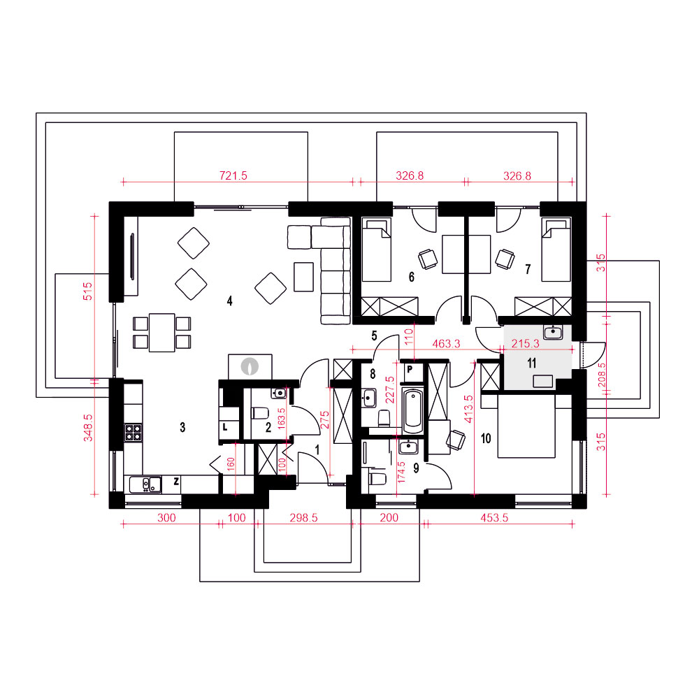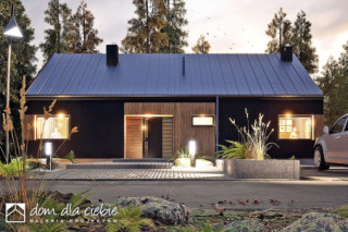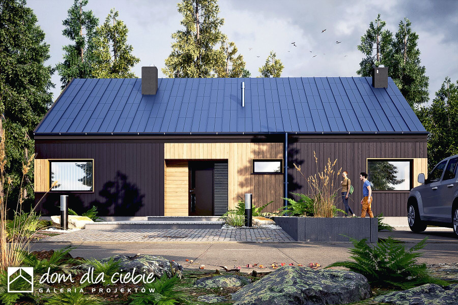 Projekt Mamba to propozycja małego parterowego domu jednorodzinnego w nowoczesnym stylu. Przeznaczony jest dla 4-osobowej rodziny. Dom został opracowany w tradycyjnej technologii murowanej ze stropem oraz klasycznej więźbie dachowej. Prostokątna bryła domu przekryta jest dachem dwuspadowym o kącie nachylenia 35 stopni. Projekt zawiera część wspólną tj. salon z kominkiem, kuchnię ze spiżarnią oraz jadalnię. Korytarz prowadzi do części indywidualnej, gdzie mamy dwie pojedyncze identyczne sypialnie pojedyncze, podwójną sypialnię z indywidualna łazienką oraz miejscami na wbudowane szafy, wspólną łazienkę oraz pomieszczenie techniczne z piecem CO. Mamba to mały, ale wygodny i przemyślany projekt dla współczesnej rodziny - świetna inwestycja na przyszłość. Klimatyczna ciemna elewacja, modna i elegancka będzie się doskonale komponować w zieleni.fundamenty: BETONOWE ściany zewnętrzne: POROTHERM+STYROPIAN TERMO ORGANIKA ściany wewnętrzne: POROTHERM rodzaj stropu: TERIVA elewacje: TYNK STRUKTURALNY, DWERNIANA, DREWNOPODOBNA pokrycie dachu: DACHÓWKA CERAMICZNA