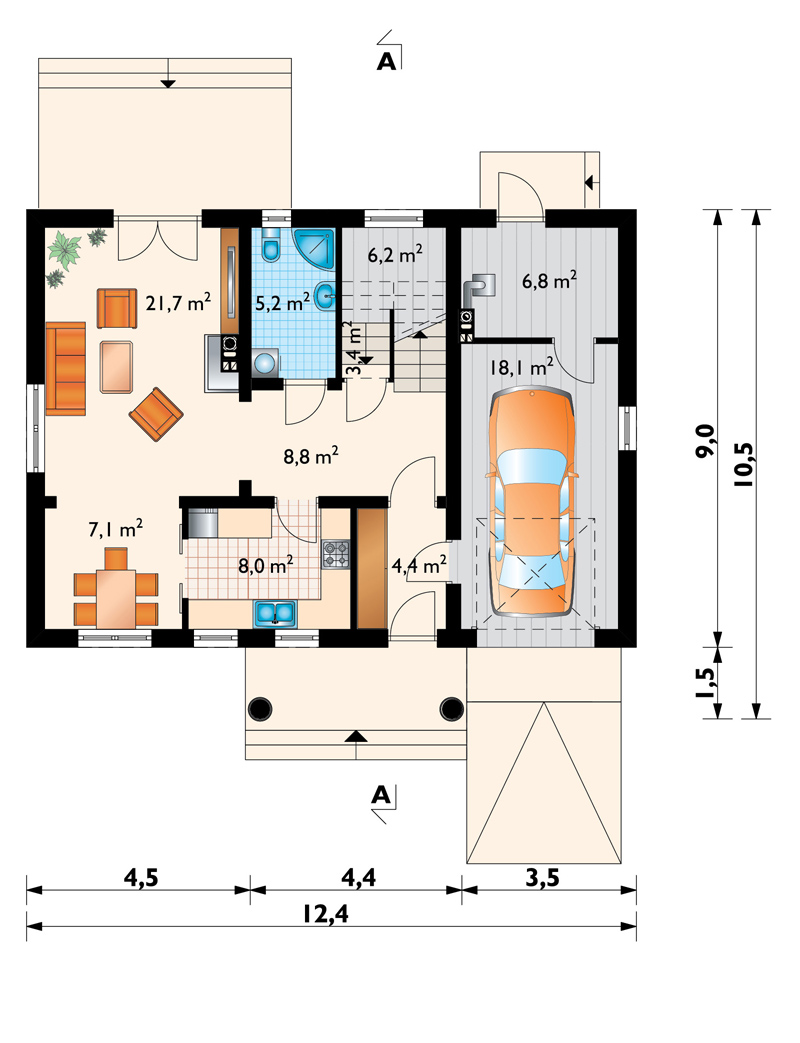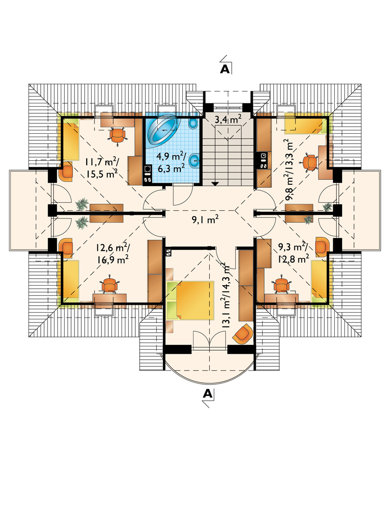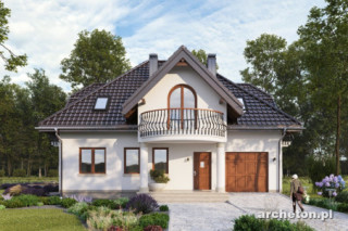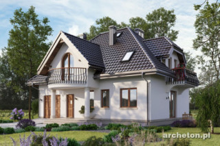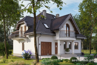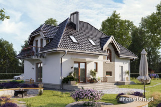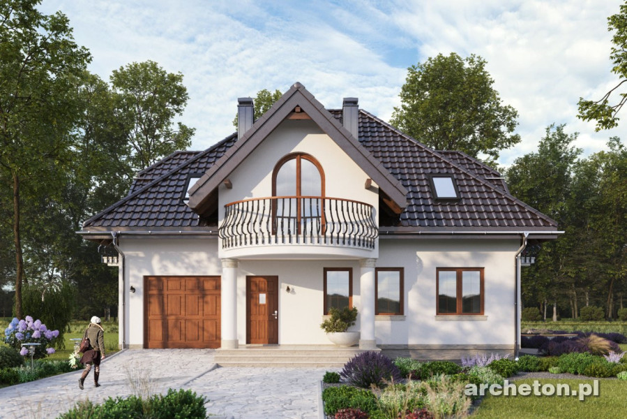 W projekcie domu Ślężan zastosowano rzadko spotykaną konstrukcję dachu czterospadowego, bardzo stromą, z krótką kalenicą równoległą do drogi dojazdowej. Bryłę rozrysowano na planie zwartego prostokąta o złotych proporcjach. Mieści się w niej dwupoziomowe mieszkanie oraz garaż z kotłownią dostępny z sieni. Jest to jedyne takie rozwiązanie z zakresu powierzchni użytkowej 120-130 m2, także ze względu na bardzo dekoracyjny, nieco historyzujący charakter architektury. Frontowy, symetrycznie umieszczony w elewacji podcień na kolumnach niesie wysuniętą lukarnę z owalnym balkonem. Prowadzi on przez sień połączoną z garażem, a dalej z dużą kotłownią, do sporego holu, z którego dostępna jest część dzienna oraz schody na poddasze. Salon i kuchnia są oddzielone ścianami nośnymi ale konstrukcja pozwala dowolnie, indywidualnie ustalić stopień otwarcia przestrzeni. Wszystkie pięć sypialni na poddaszu to pokoje doświetlone oknami dachowymi oraz drzwiami balkonów w lukarnach dachu. Pomieszczenia w projekcie domu Ślężan nie są duże ale ustawne i zapewniają wygodę sześciorgu mieszkańcom.