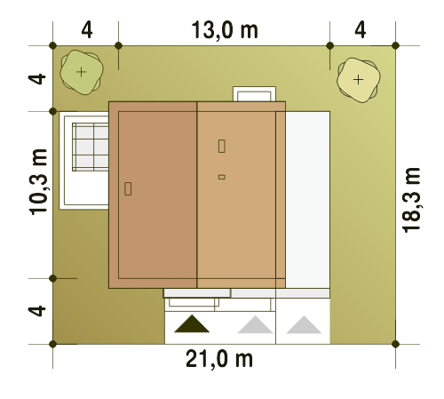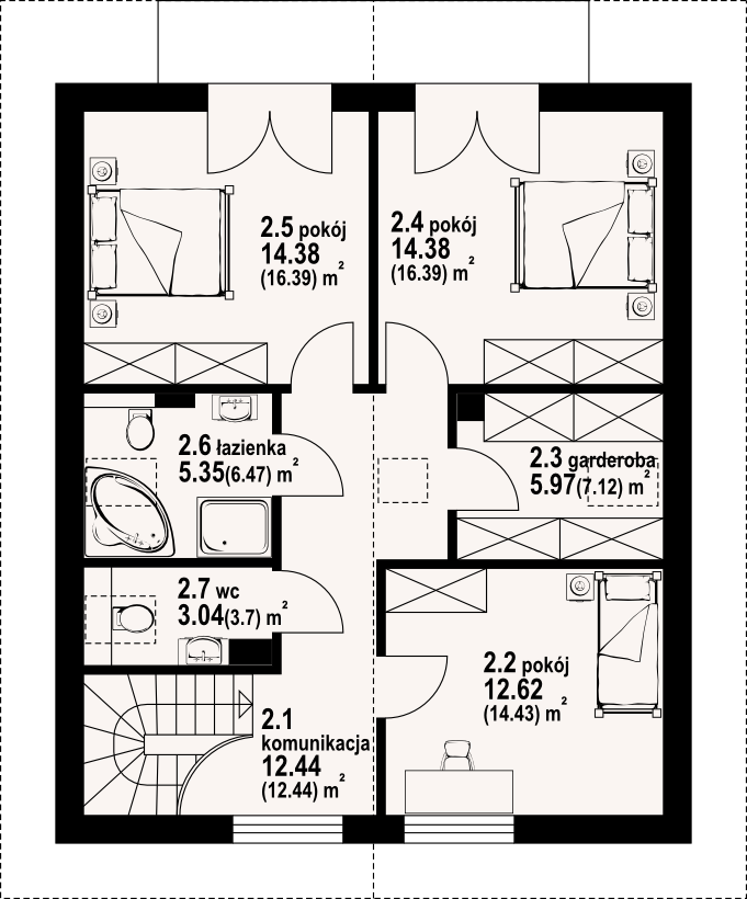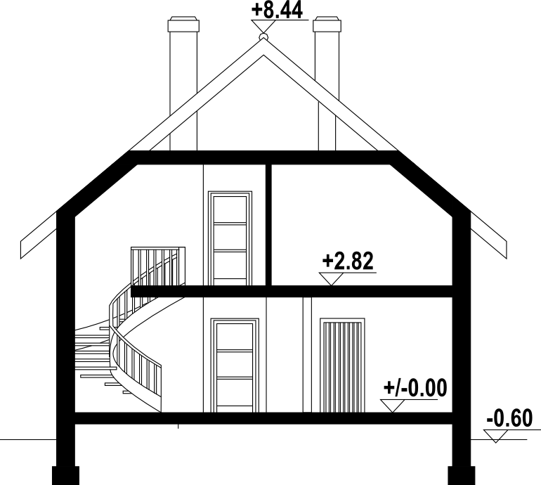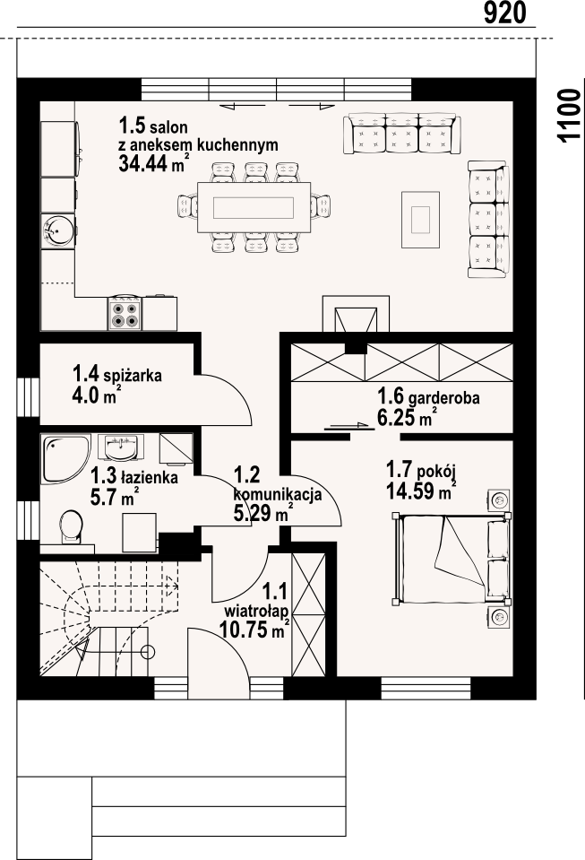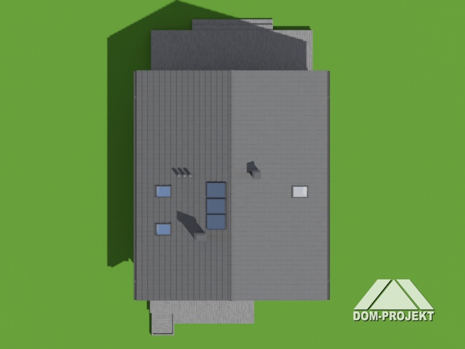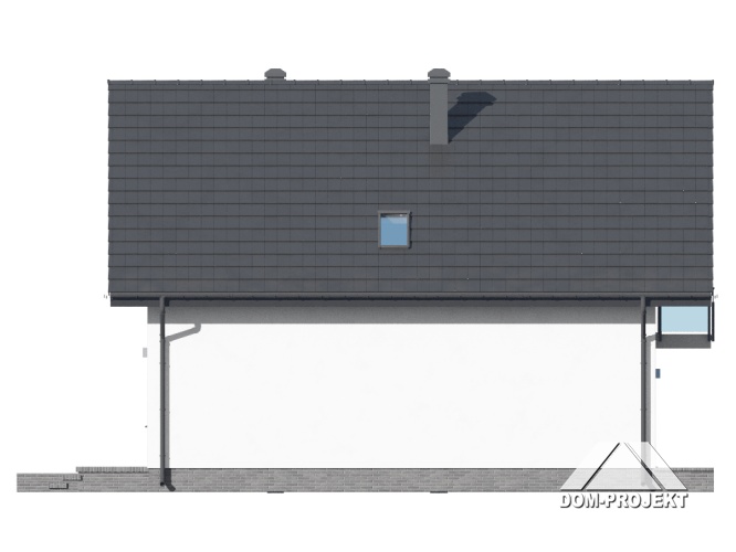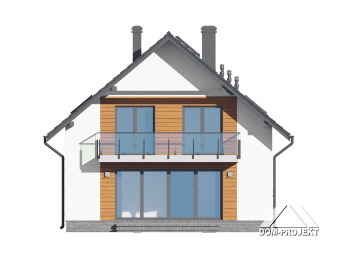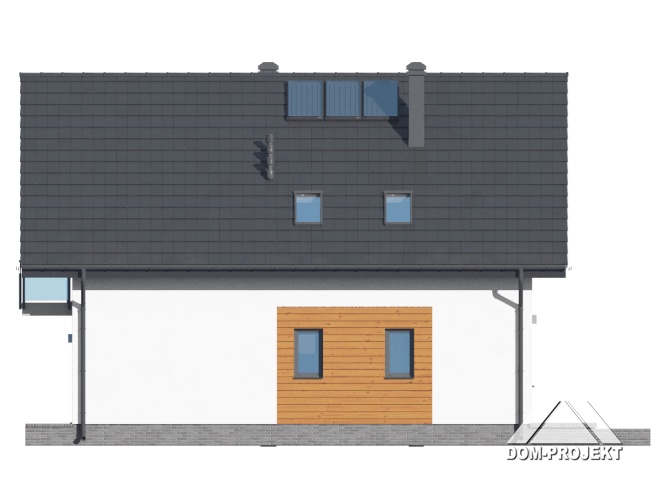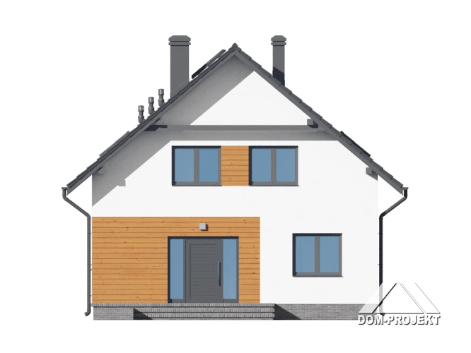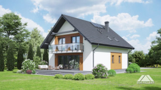 Dom z poddaszem użytkowym. Duży salon z aneksem kuchennym, kominkiem i wyjściem na taras. Pokój, garderoba, spiżarka, łazienka, komunikacja i wiatrołap. Na poddaszu trzy pokoje, łazienka, wc, garderoba, komunikacja i balkon. Zwarta bryła budynku i dach dwuspadowy sprzyjają szybkiej i taniej budowie i niskim kosztom eksploatacji.