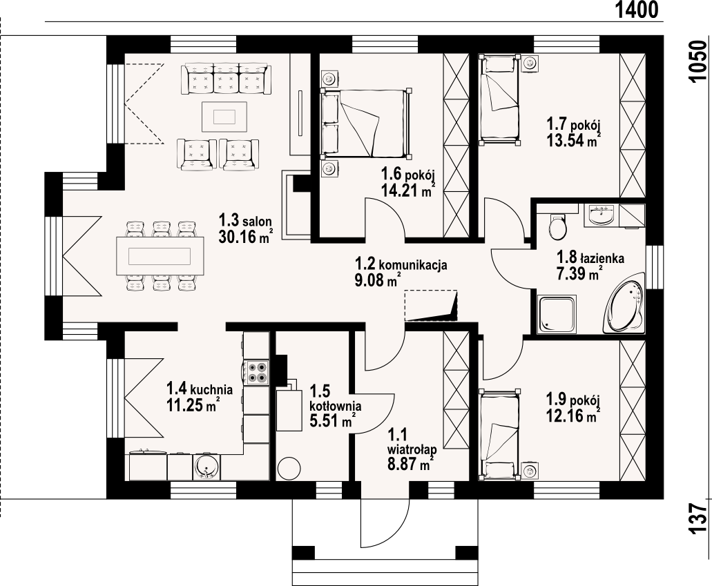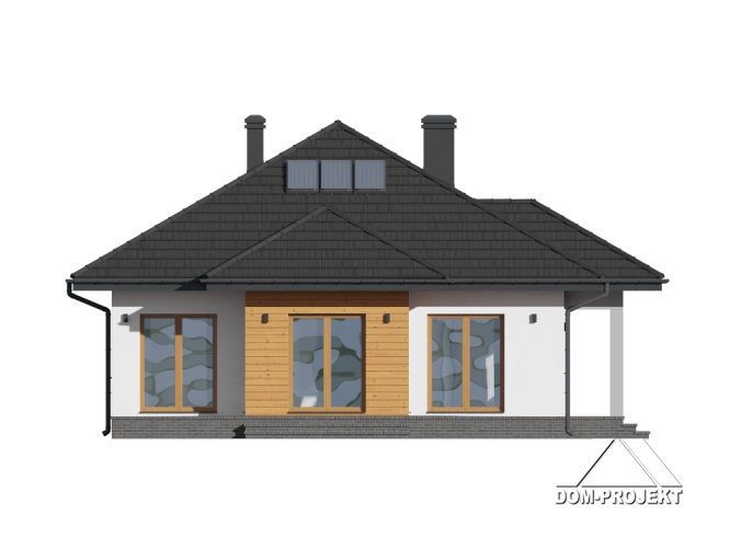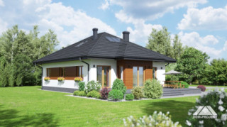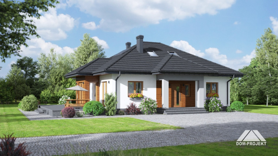 Dom parterowy. Salon z kominkiem, wyjściami na taras i przejściem do wygodnie umeblowanej kuchni. Trzy pokoje, łazienka, kotłownia, wiatrołap i komunikacja. Poddasze nieużytkowe. Wyjście na poddasze schodami strychowymi rozkładanymi.