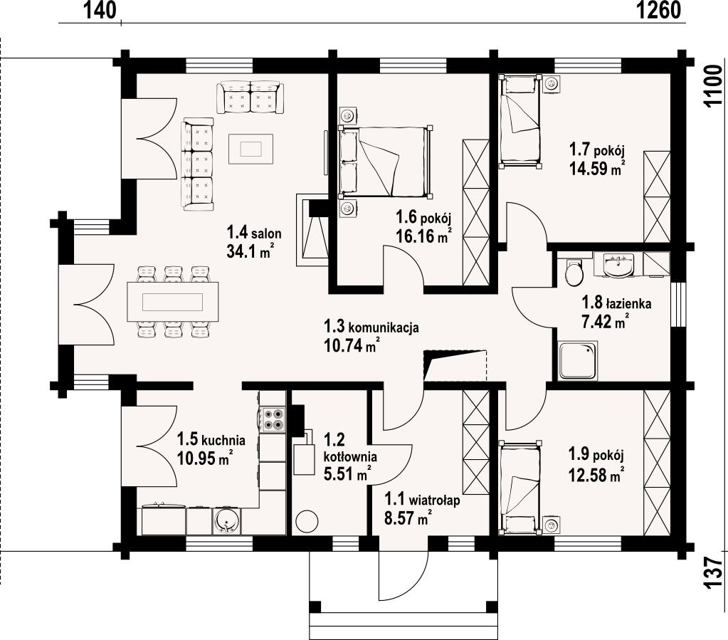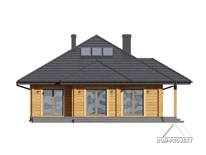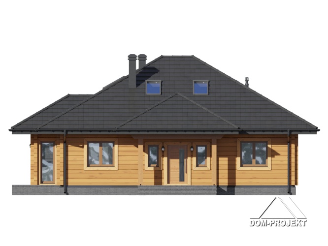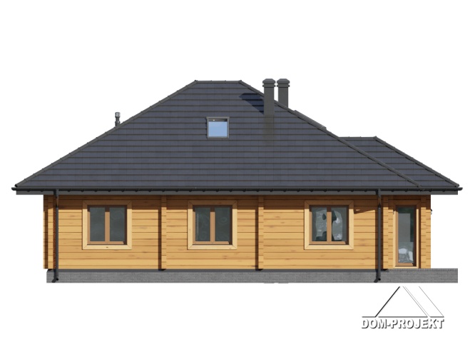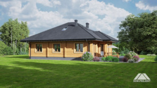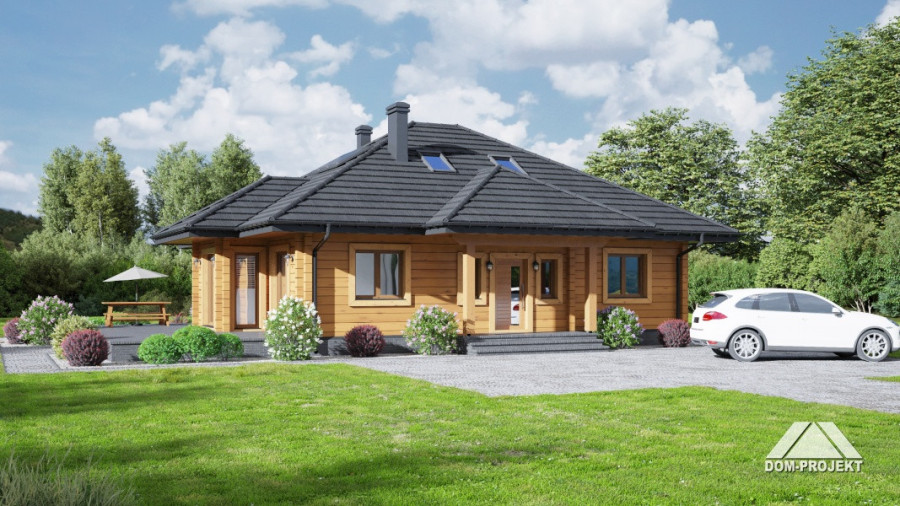 Dom z bali. Parterowy. Duży salon z kominkiem, wyjściami na taras i przejściem do wygodnie umeblowanej kuchni. Trzy pokoje, łazienka, kotłownia, wiatrołap i komunikacja. Wyjście na poddasze nieużytkowe schodami strychowymi rozkładanymi.