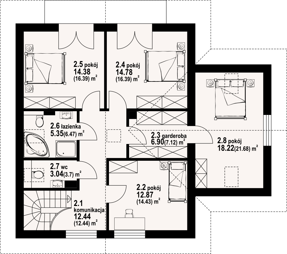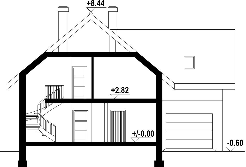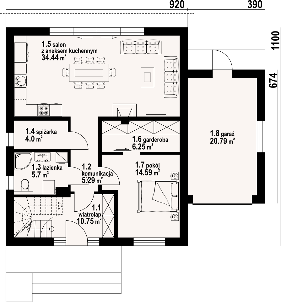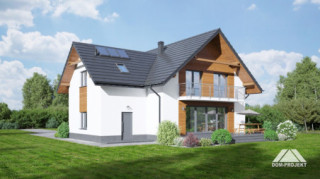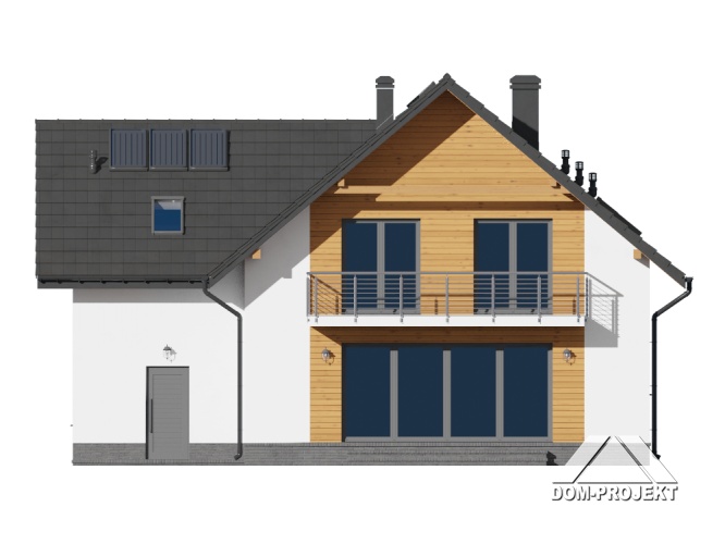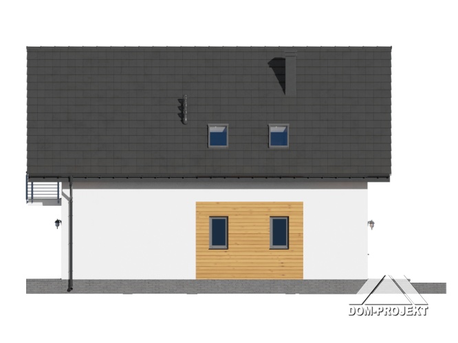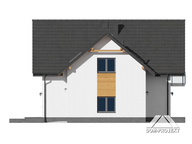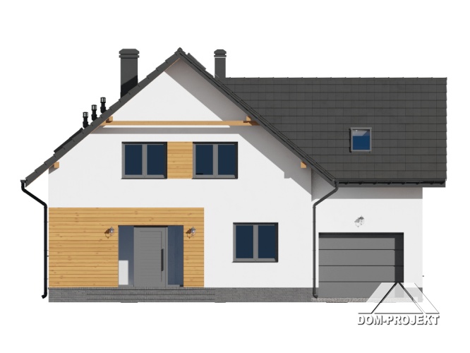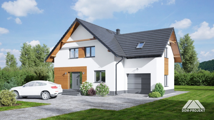 Dom z poddaszem użytkowym. Duży salon z aneksem kuchennym, kominkiem i wyjściem na taras. Pokój, garderoba, spiżarka, łazienka, komunikacja, wiatrołap oraz garaż. Na poddaszu cztery pokoje, łazienka, wc, garderoba, komunikacja i balkon.