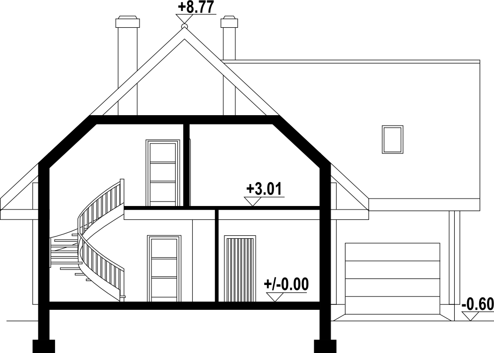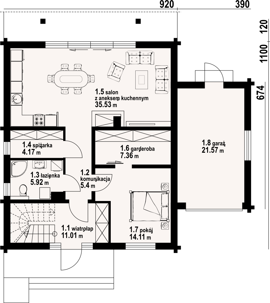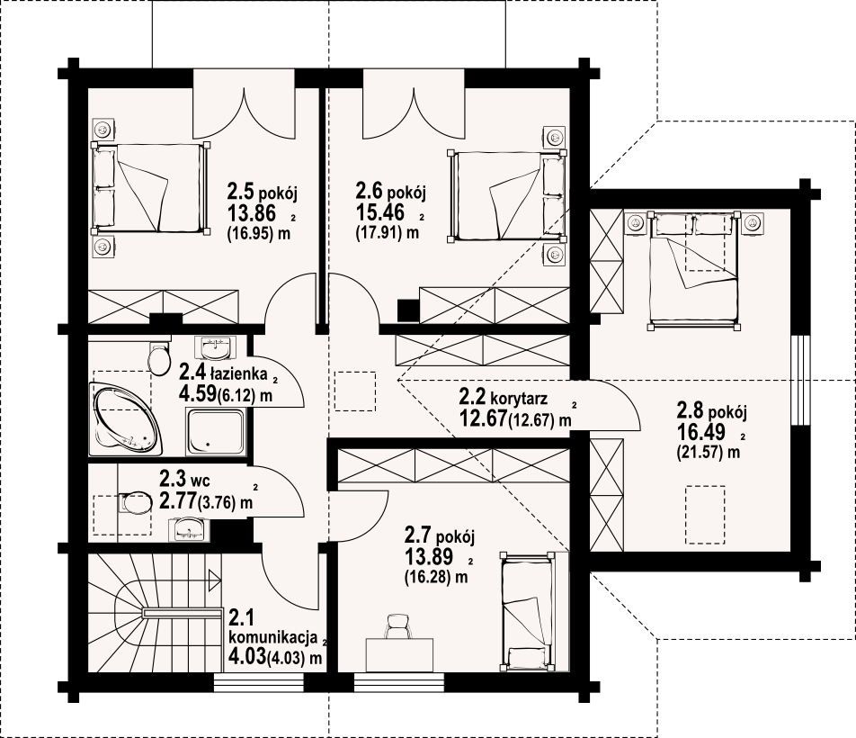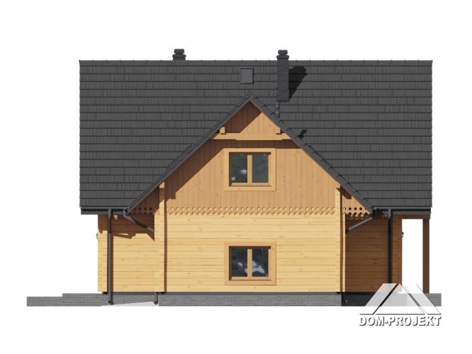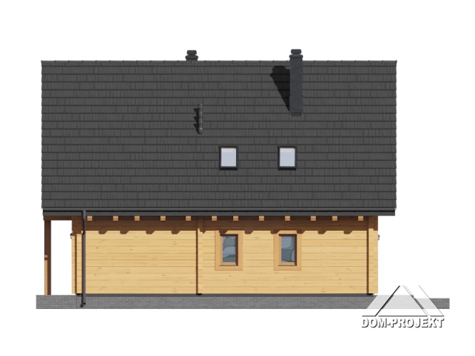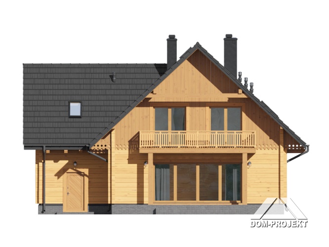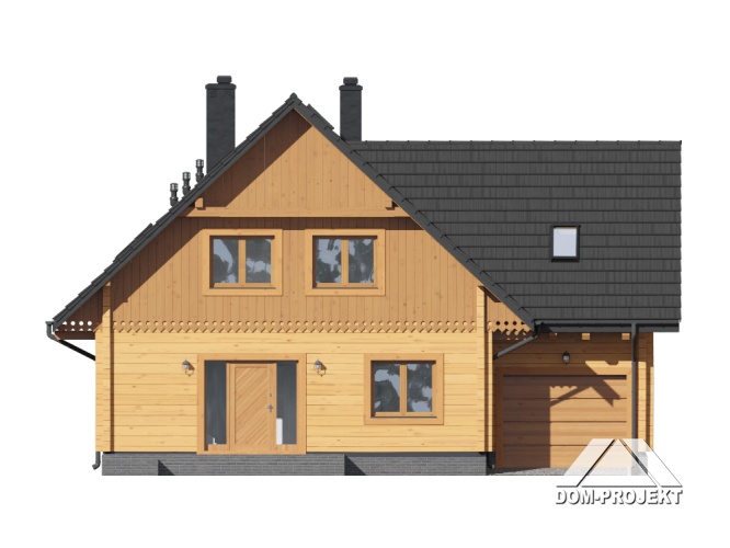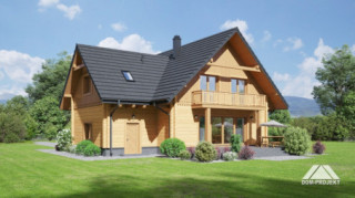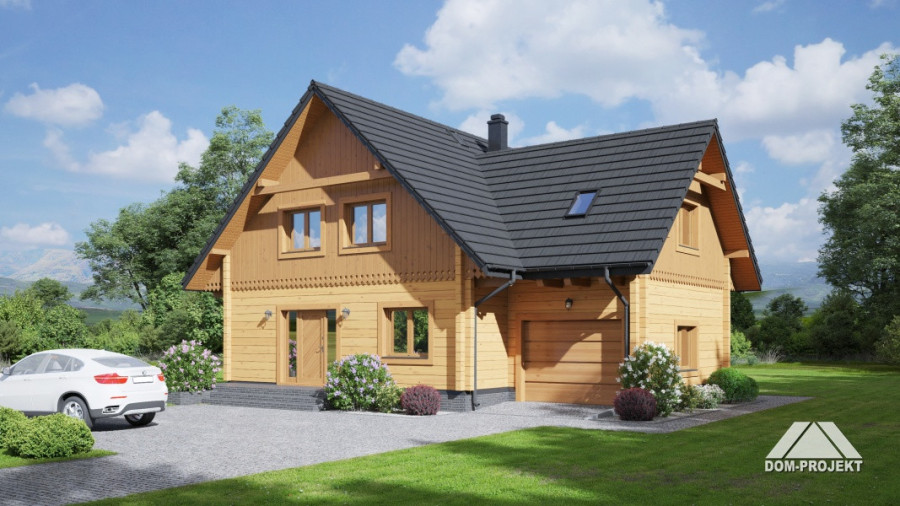 Dom z bali. Duży salon z aneksem kuchennym, kominkiem i wyjściem na taras. Pokój, garderoba, spiżarka, łazienka, komunikacja, wiatrołap i garaż. Na poddaszu cztery pokoje, łazienka, wc, garderoba, komunikacja i balkon. Zwarta bryła budynku i dach dwuspadowy sprzyjają szybkiej i taniej budowie i niskim kosztom eksploatacji.
