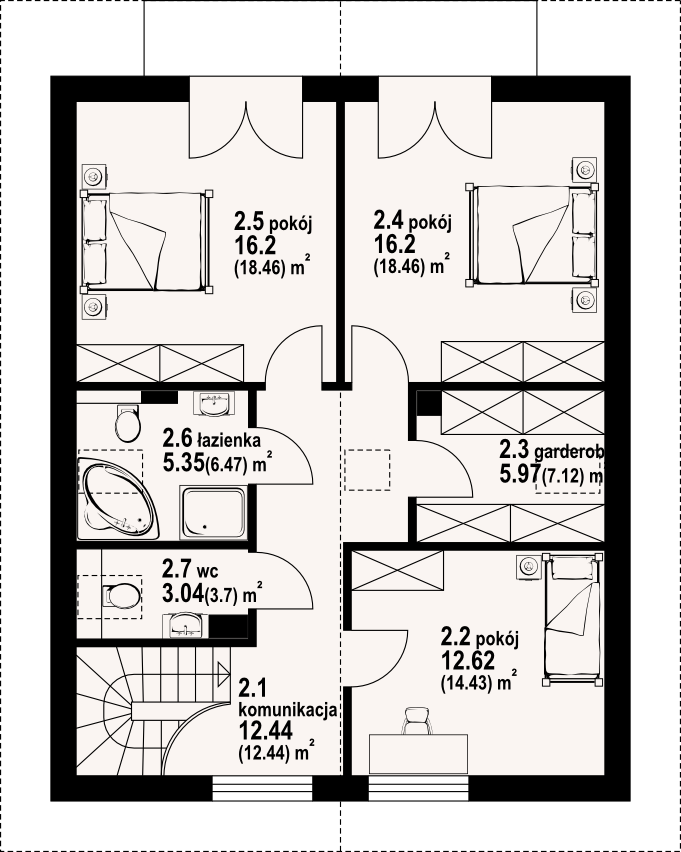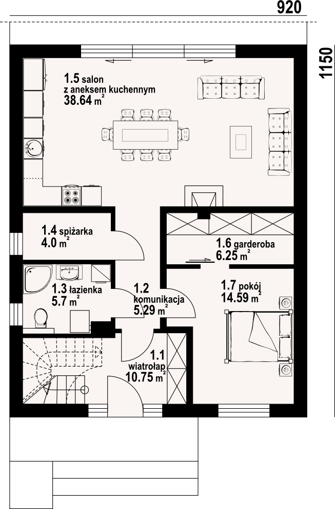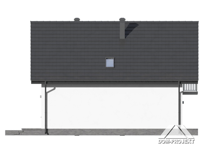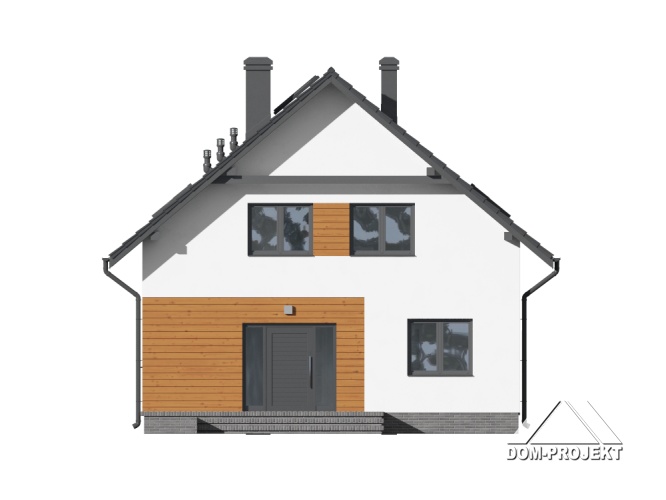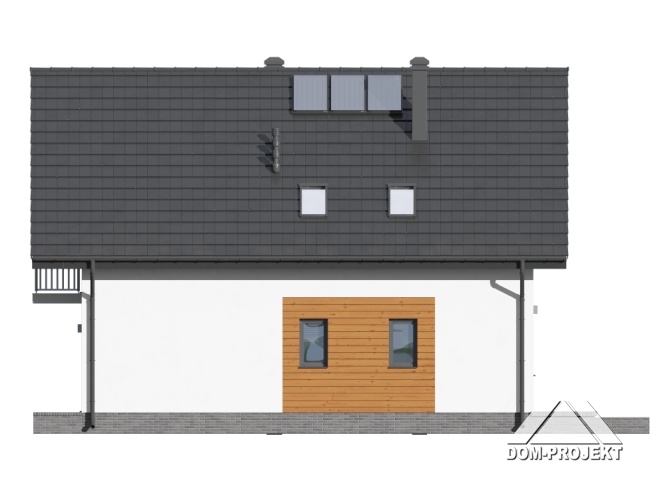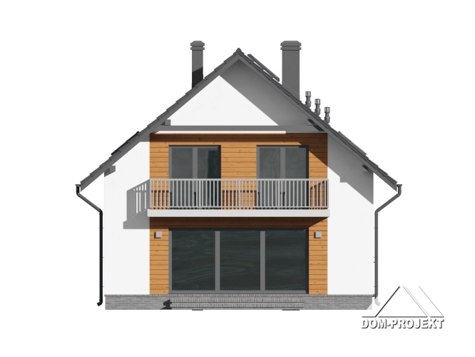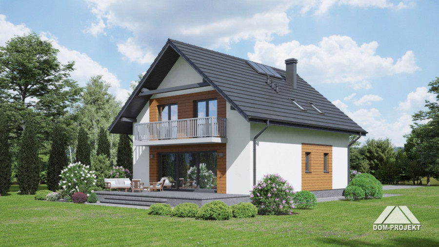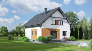 Dom z poddaszem użytkowym. Na parterze duży salon z aneksem kuchennym, kominkiem i wyjściem na taras. Pokój z garderobą, łazienka, spiżarka, wiatrołap, komunikacja. Na poddaszu trzy wygodne pokoje, łazienka, wc, garderoba, komunikacja. Dwa pokoje mają balkon. Zwarta bryła budynku i dach dwuspadowy sprzyjają szybkiej i taniej budowie i niskim kosztom eksploatacji.