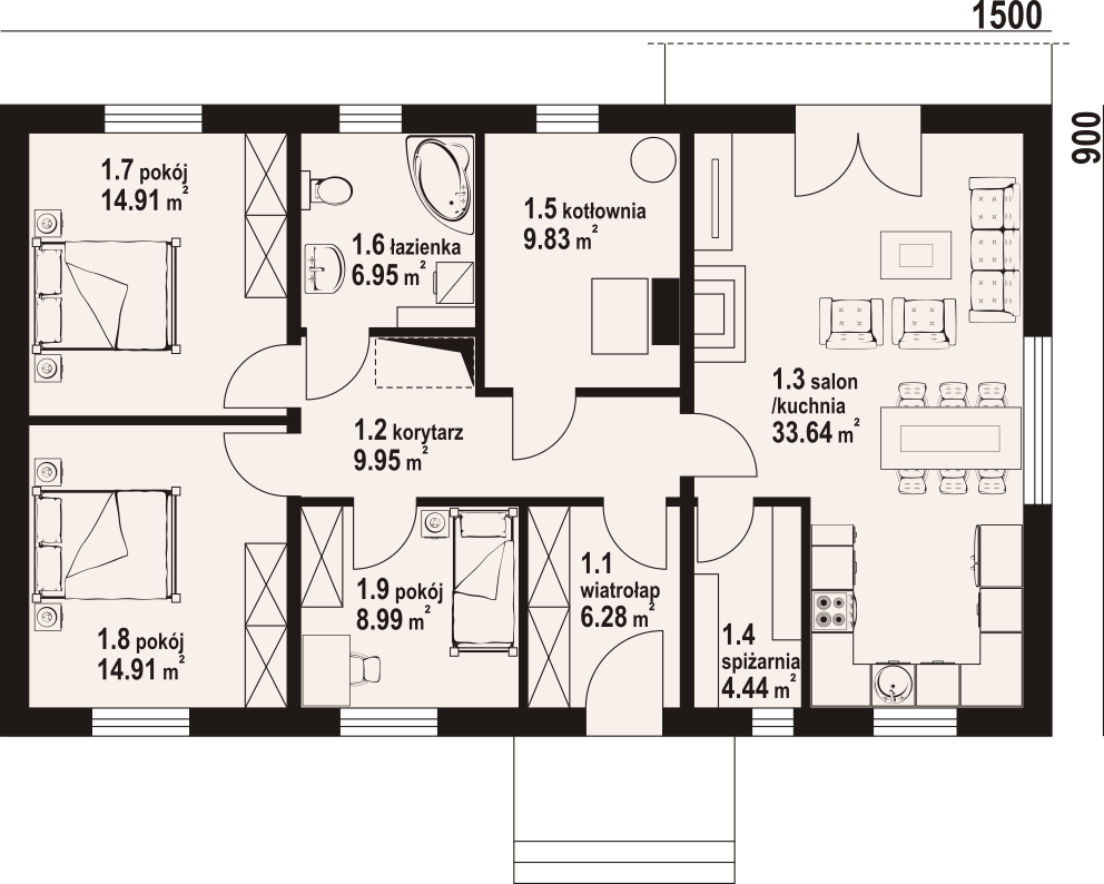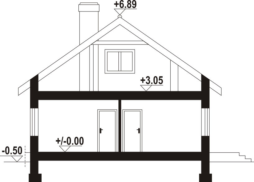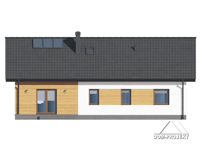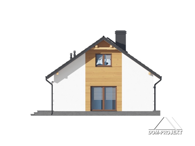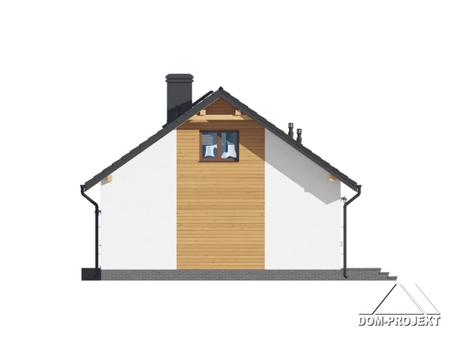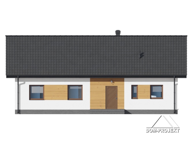 Dom parterowy. Duży salon z kuchnią, kominkiem i wyjściem na taras. Trzy pokoje, łazienka, spiżarka, wiatrołap, korytarz i kotłownia. Wejście na strych nieużytkowy schodami strychowymi rozkładanymi z korytarza. Zwarta bryła budynku oraz dach dwuspadowy sprzyjają szybkiej i taniej budowie oraz niskim kosztom eksploatacji.