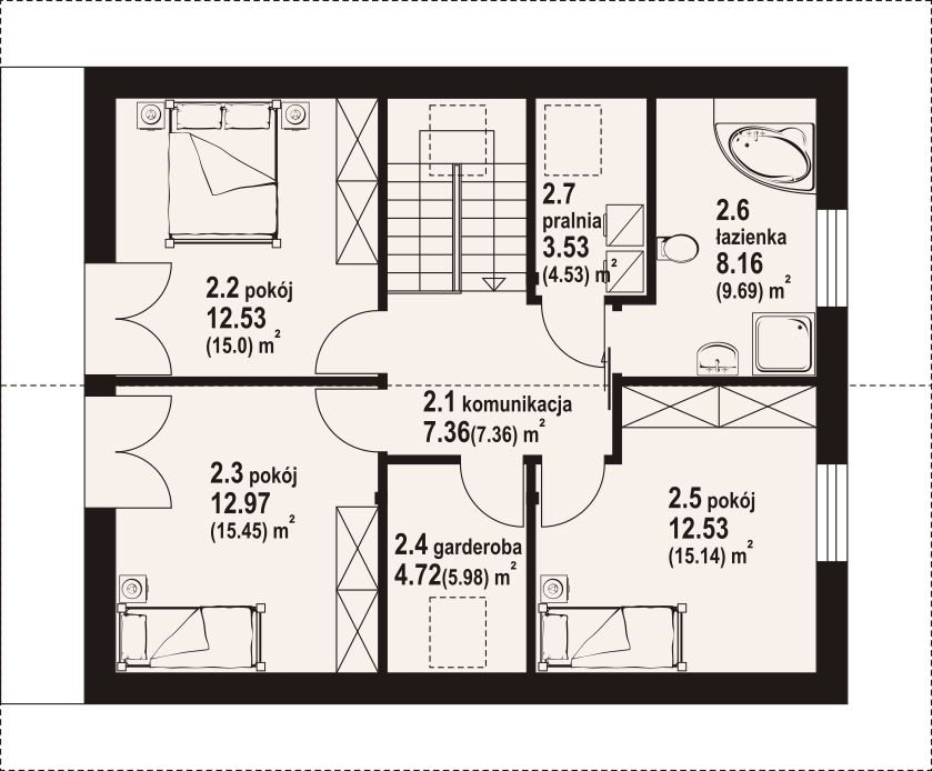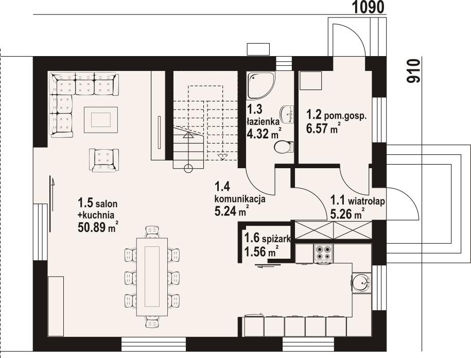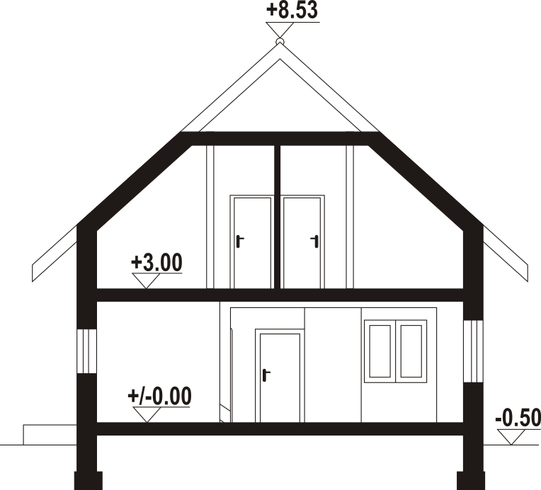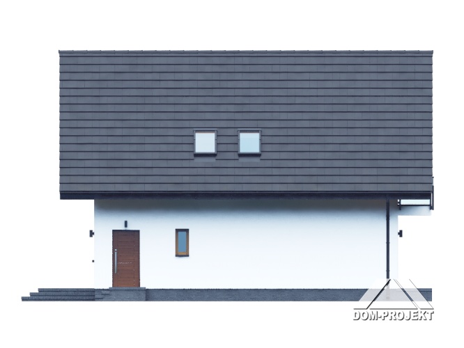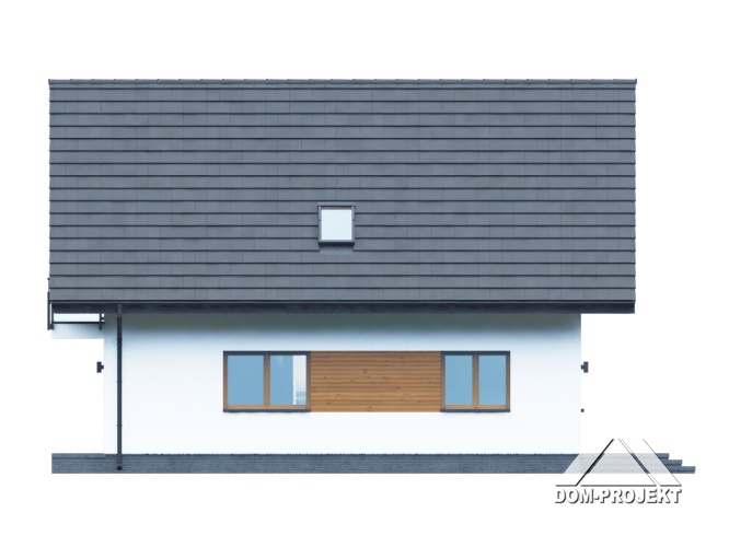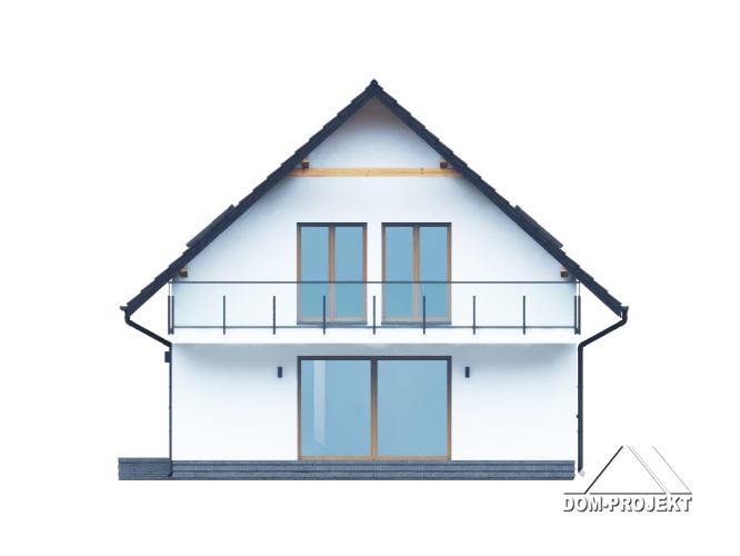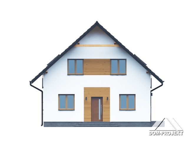 Dom z poddaszem mieszkalnym. Na parterze duży salon z wyjściem na taras. Kuchnia, spiżarka, komunikacja, wiatrołap, łazienka, pomieszczenie gospodarcze. Na poddaszu trzy pokoje, łazienka, garderoba, komunikacja, pralnia. Balkon dostępny z dwu pokoi. Zwarta bryła budynku oraz dach dwuspadowy sprzyjają szybkiej i taniej budowie oraz niskim kosztom eksploatacji.