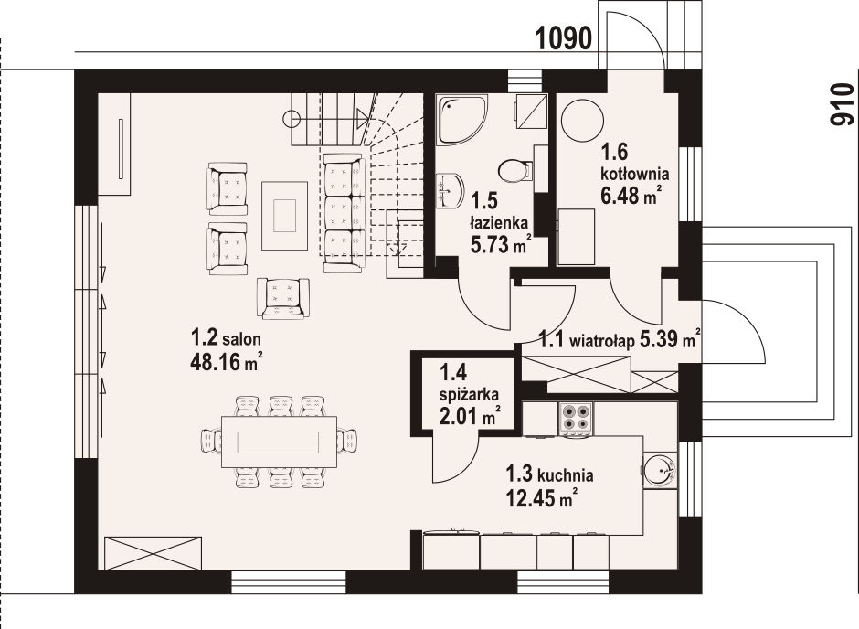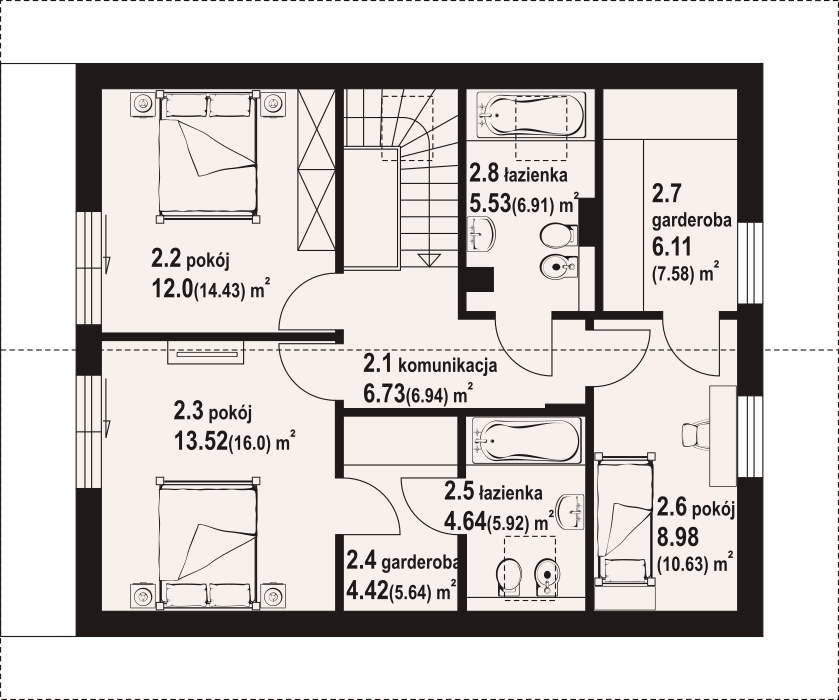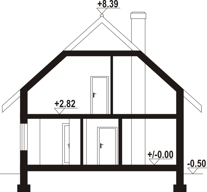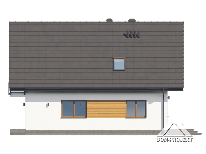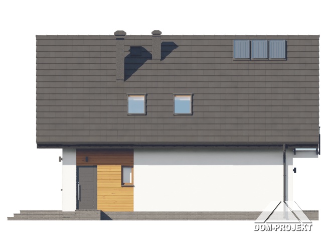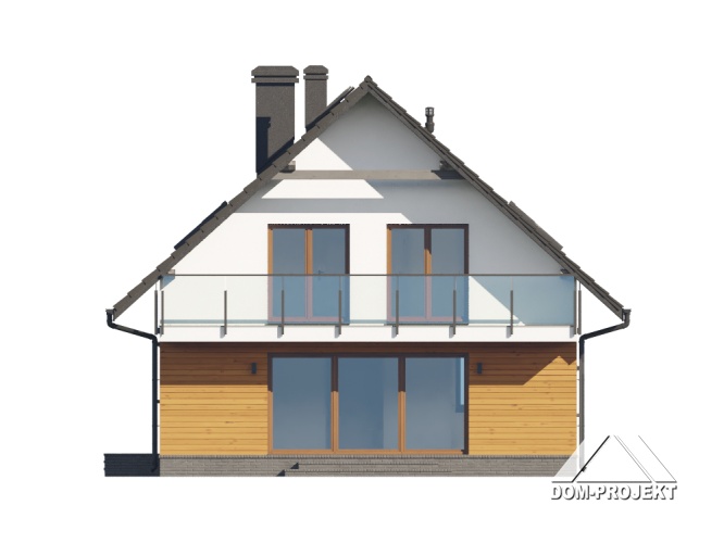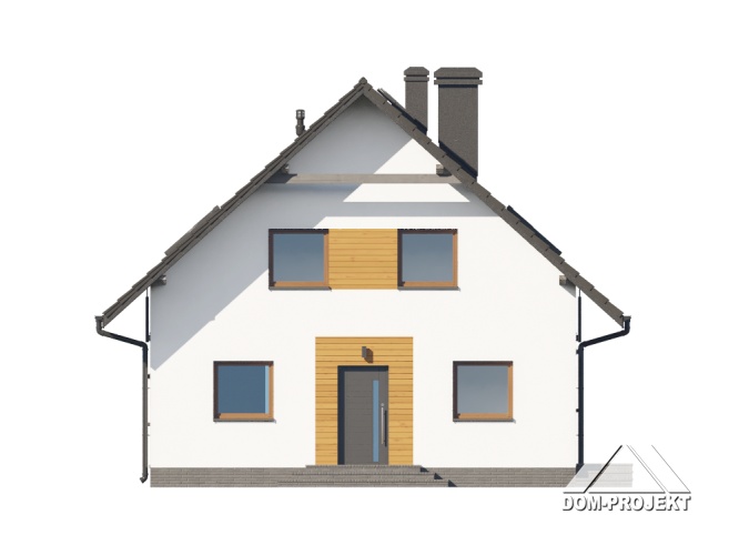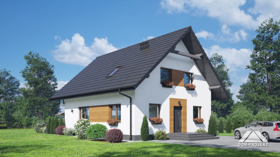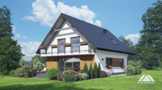 Dom z poddaszem użytkowym. Na parterze duży salon z kominkiem, wyjściem na taras oraz schodami na poddasze. Kuchnia, spiżarka, łazienka, kotłownia, wiatrołap. Na poddaszu trzy pokoje, dwa z nich z własną garderobą, dwie łazienki, komunikacja. Balkon dostępny z dwóch pokoi. Zwarta bryła budynku oraz dach dwuspadowy sprzyjają szybkiej i taniej budowie oraz niskim kosztom eksploatacji.