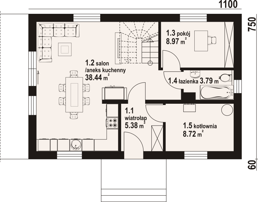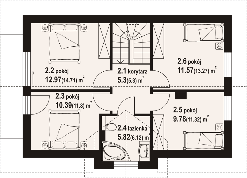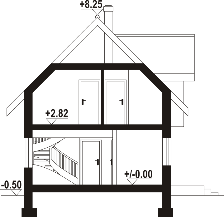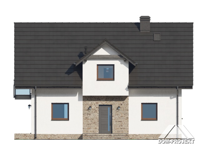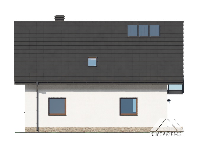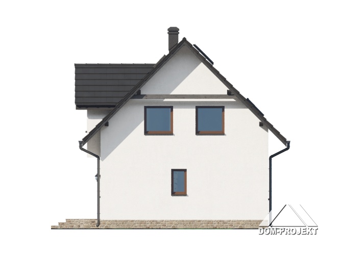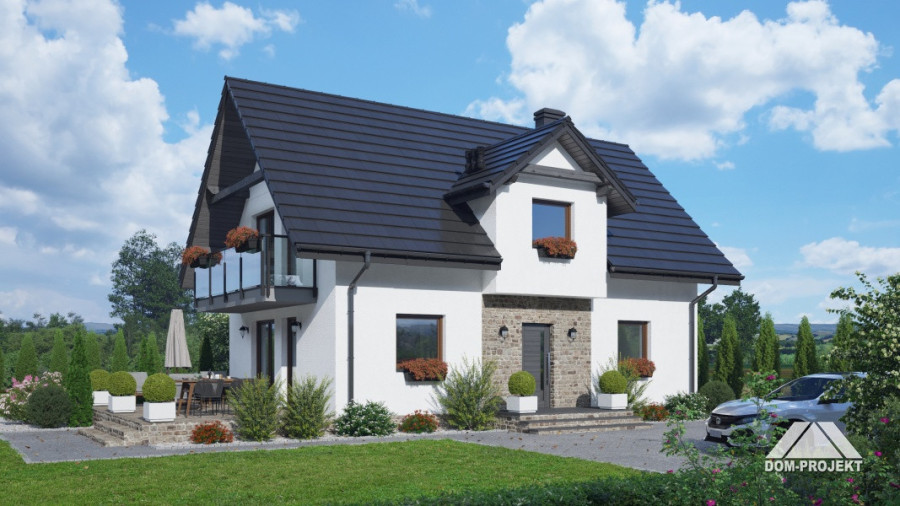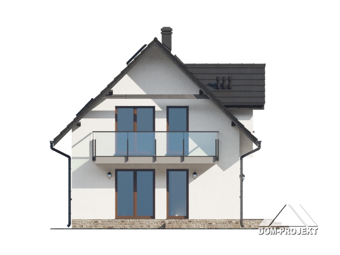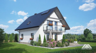 Dom z poddaszem użytkowym. Na parterze salon z aneksem kuchennym, wyjściem na taras i schodami na poddasze. Pokój, łazienka, kotłownia, wiatrołap. Na poddaszu cztery pokoje, łazienka, korytarz oraz balkon dostępny z dwóch pokoi. Zwarta bryła budynku oraz dach dwuspadowy sprzyjają szybkiej i taniej budowie oraz niskim kosztom eksploatacji.