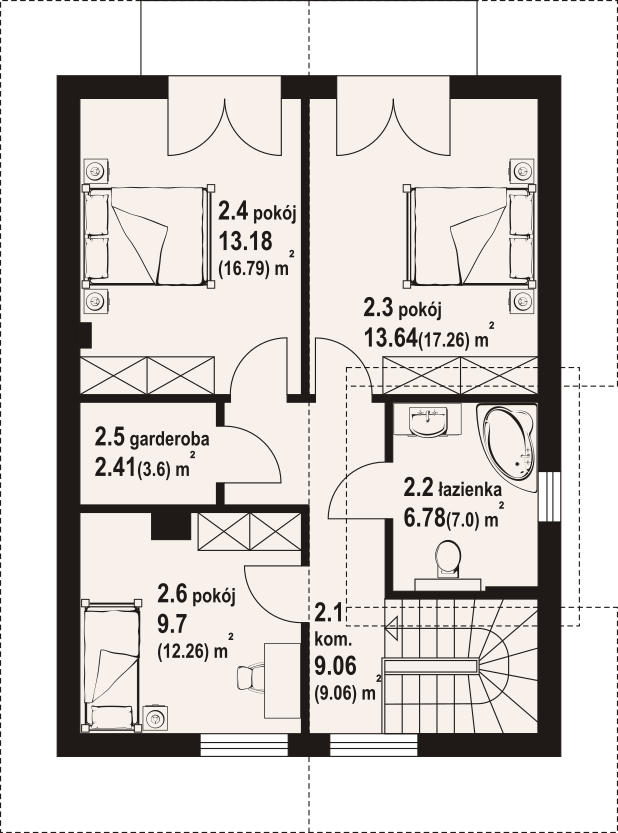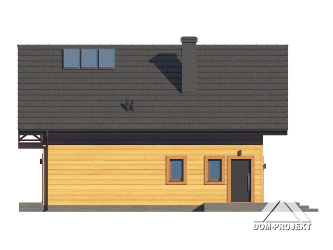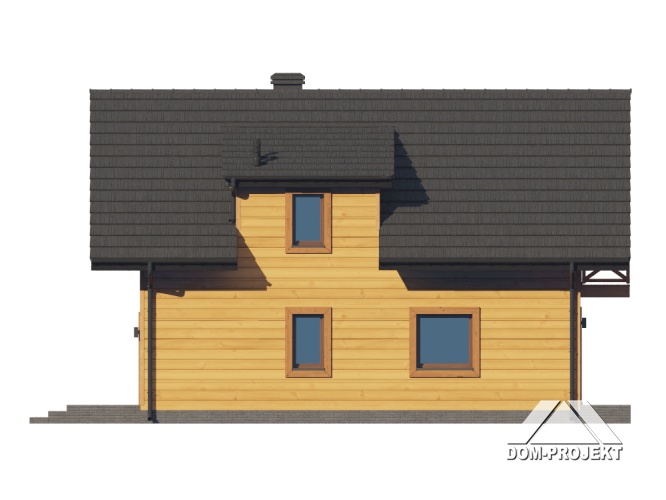 Dom z poddaszem użytkowym. Na parterze salon z aneksem kuchennym oraz wyjściem na taras. Łazienka, kotłownia, spiżarka, komunikacja oraz wiatrołap. Na poddaszu trzy pokoje, łazienka, garderoba, komunikacja oraz balkon dostępny z dwóch pokoi. Zwarta bryła budynku oraz dach dwuspadowy sprzyjają szybkiej i taniej budowie oraz niskim kosztom eksploatacji.