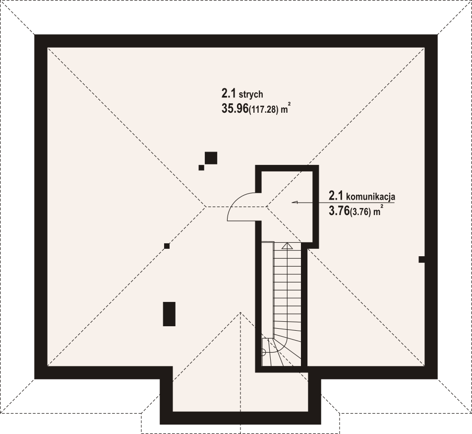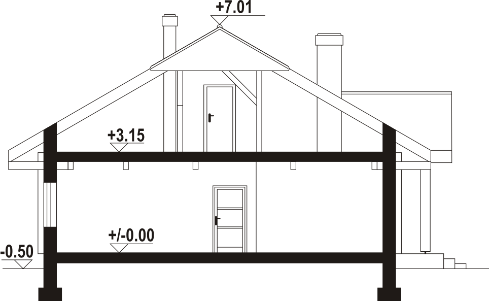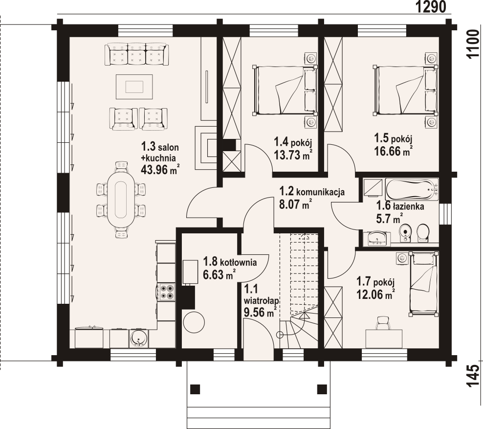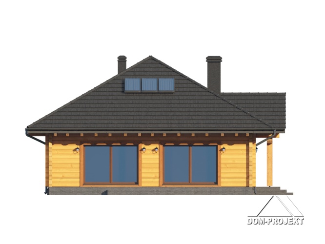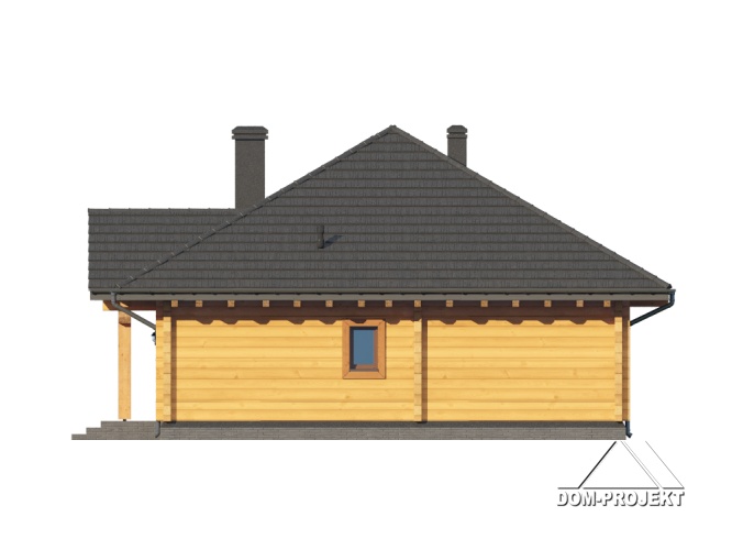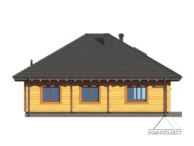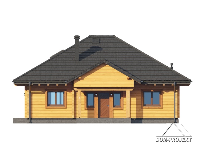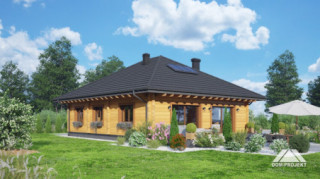 Dom z bali drewnianych. Parterowy. Salon z kuchnią, kominkiem oraz wyjściem na taras. Trzy pokoje, łazienka, komunikacja, kotłownia, wiatrołap. Schody na poddasze z wiatrołapu. Na poddaszu strych.