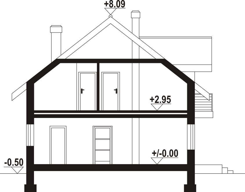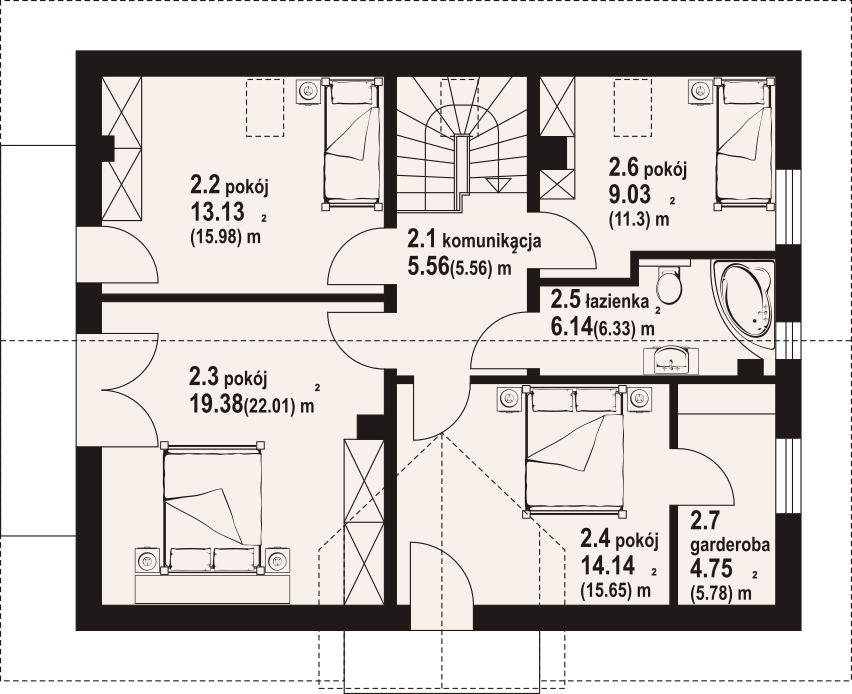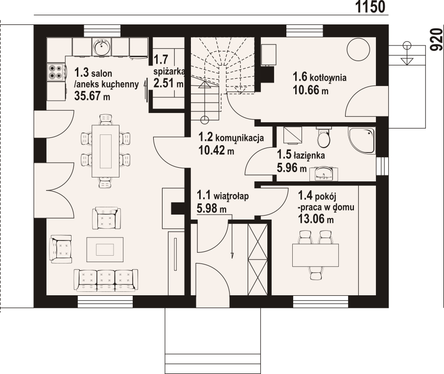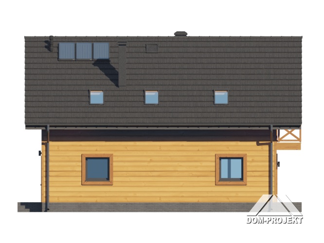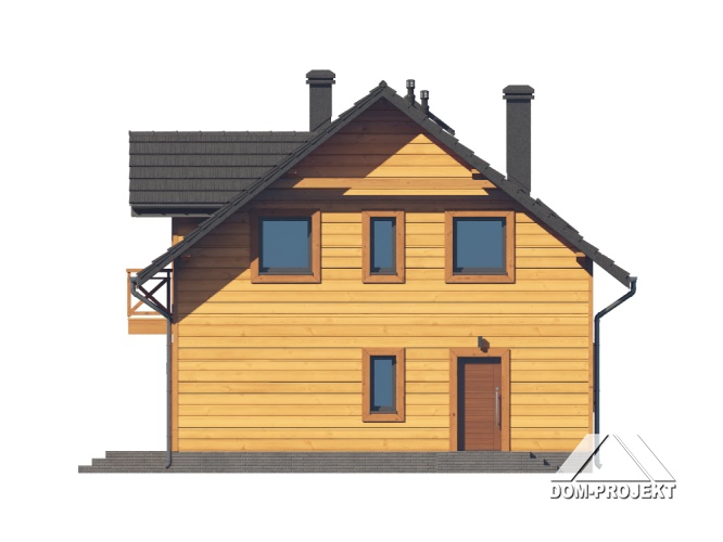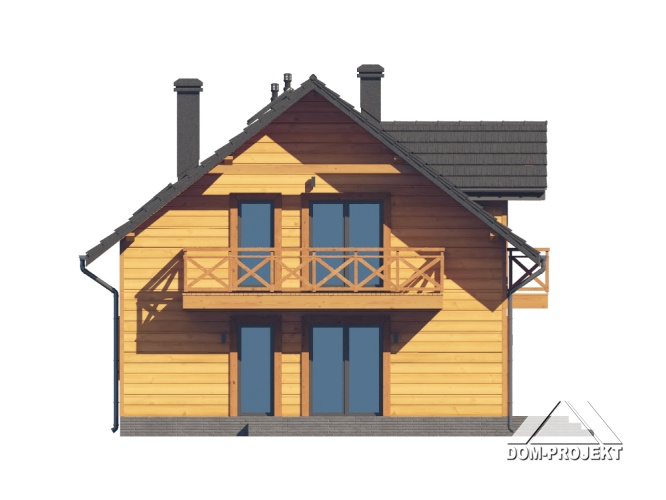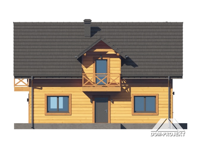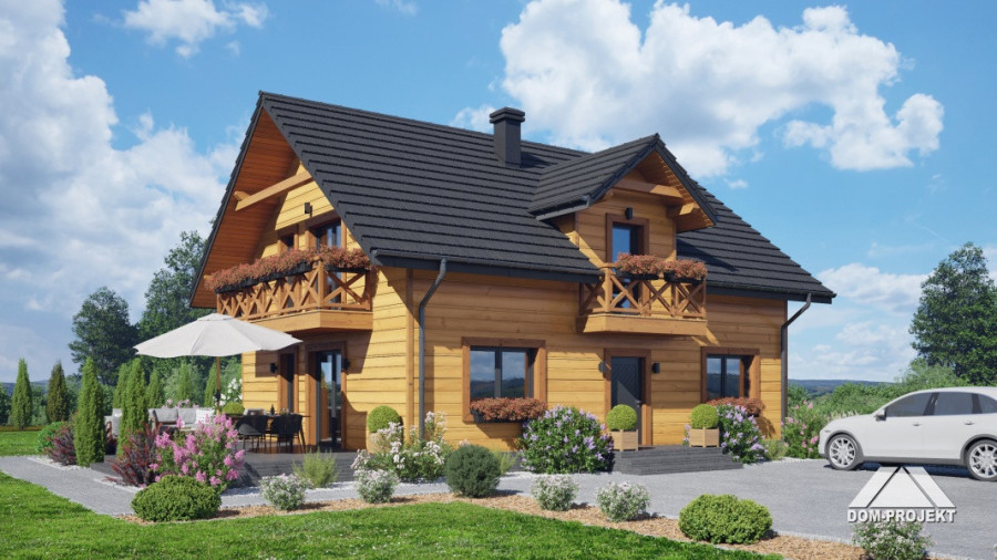 Dom w konstrukcji szkieletu drewnianego. Na parterze salon z aneksem kuchennym, kominkiem oraz wyjściem na taras. Pokój do pracy, wiatrołap, komunikacja, kotłownia, łazienka. Na poddaszu cztery pokoje, garderoba, łazienka, komunikacja oraz balkon dostępny z dwóch pokoi. Zwarta bryła budynku oraz dach dwuspadowy sprzyjają szybkiej i taniej budowie oraz niskim kosztom eksploatacji.