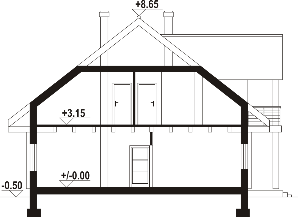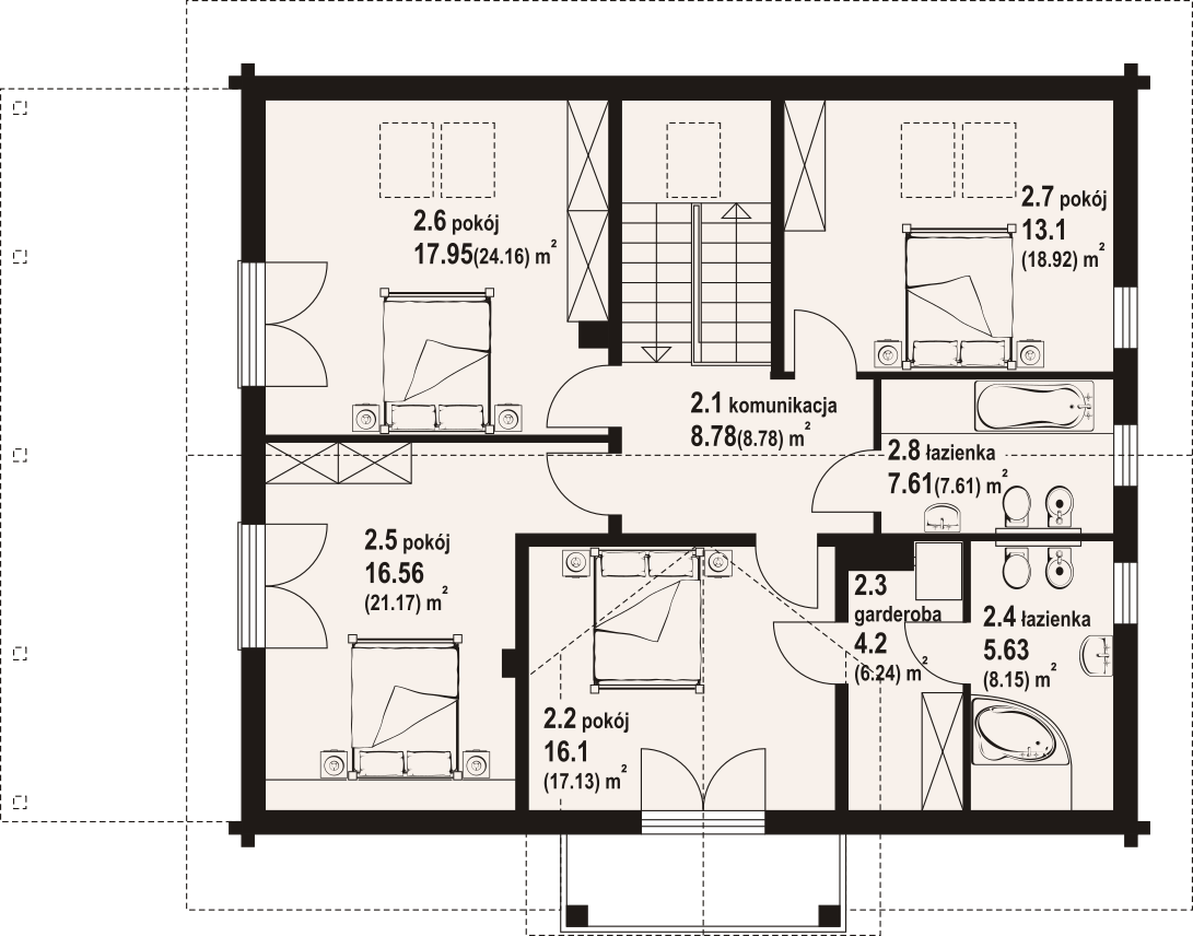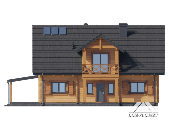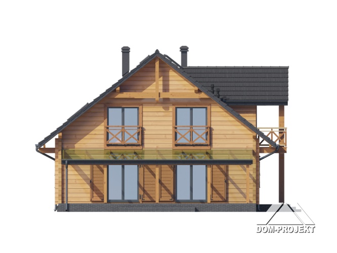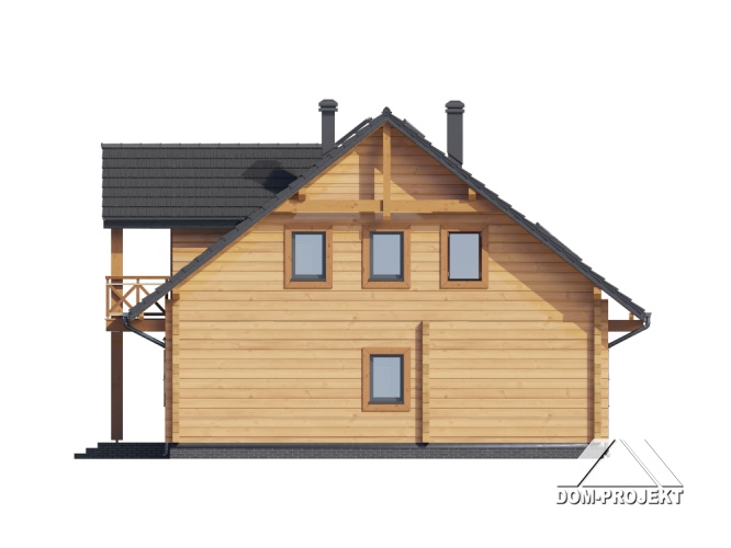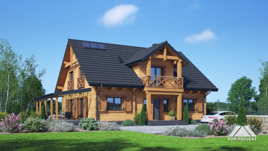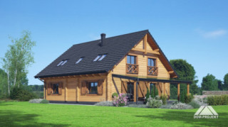 Dom z bali. Na parterze salon z aneksem kuchennym, kominkiem, wyjściem na taras. Pokój, komunikacja, łazienka, kotłownia, wiatrołap, spiżarka. Na poddaszu cztery pokoje, dwie łazienki, garderoba, komunikacja, dwa balkony. Zwarta bryła budynku oraz dach dwuspadowy sprzyjają szybkiej i taniej budowie oraz niskim kosztom eksploatacji.