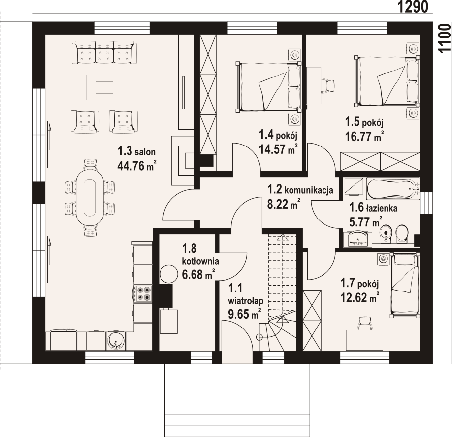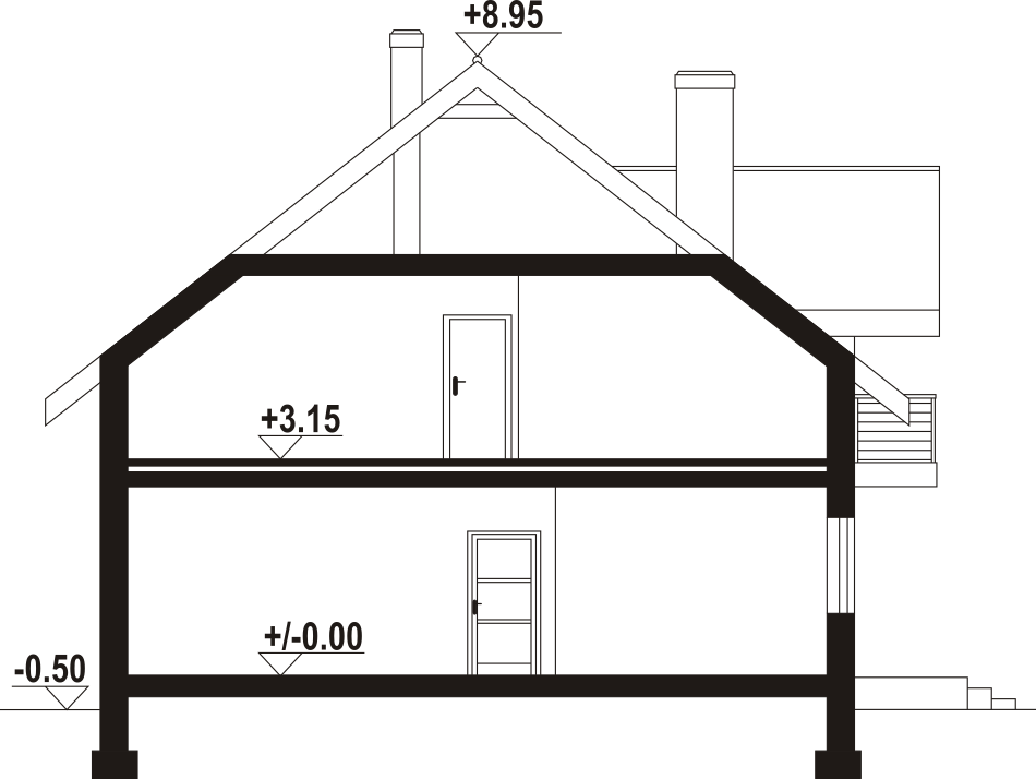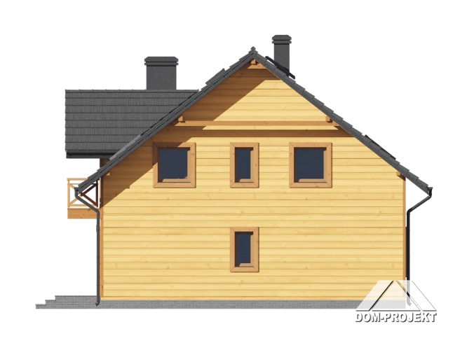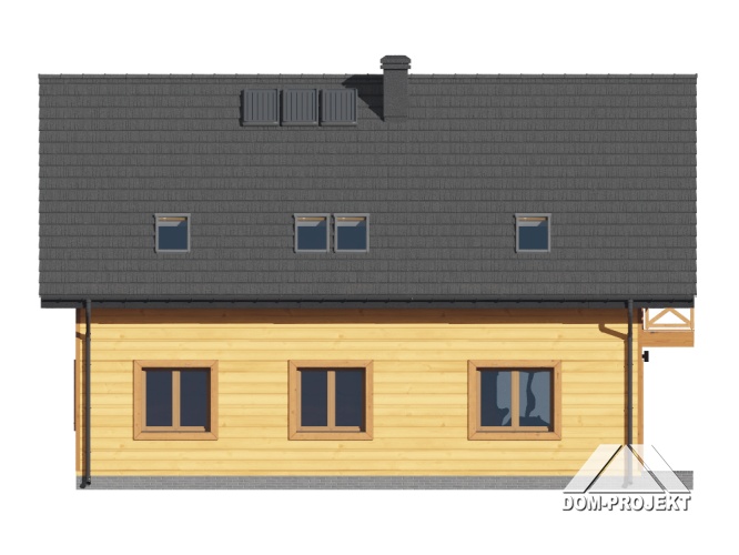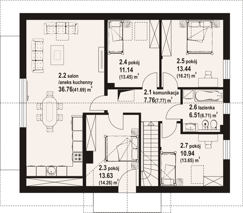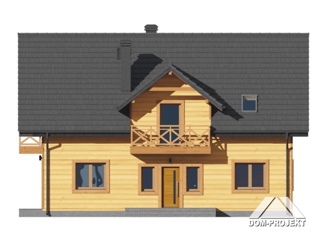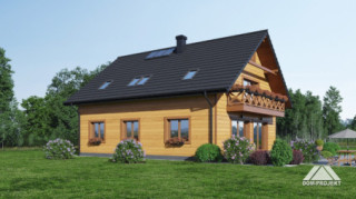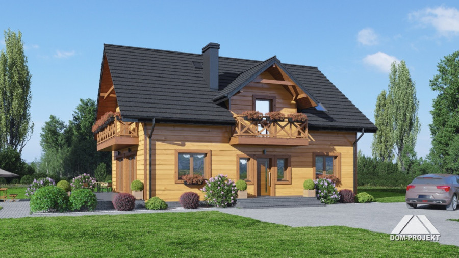 Dom w konstrukcji szkieletu drewnianego. Na parterze salon z aneksem kuchennym, kominkiem oraz wyjściem na taras. Trzy pokoje, łazienka, komunikacja, kotłownia, wiatrołap. Na poddaszu salon z aneksem kuchennym, cztery pokoje, łazienka, komunikacja oraz balkon dostępny z salonu. Poddasze jest samodzielnym mieszkaniem.