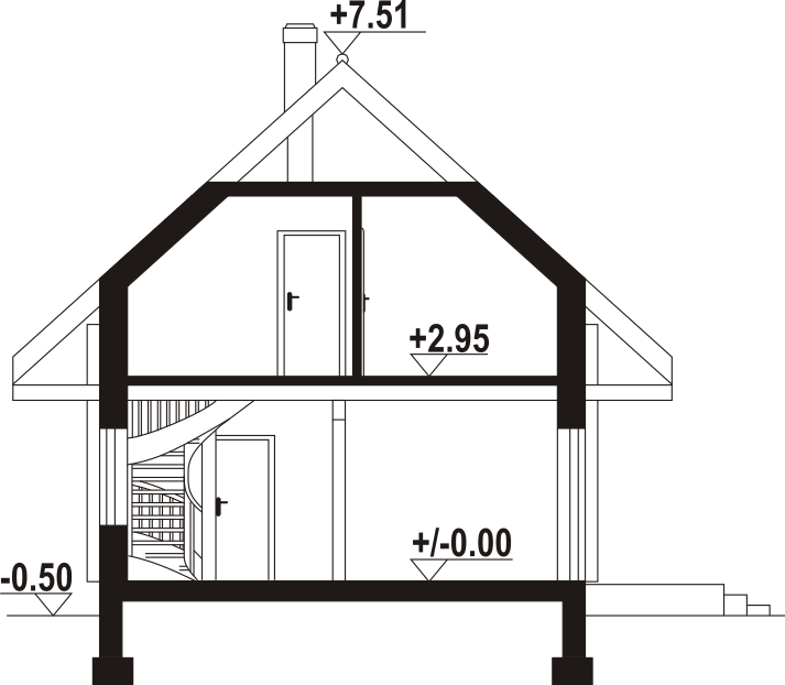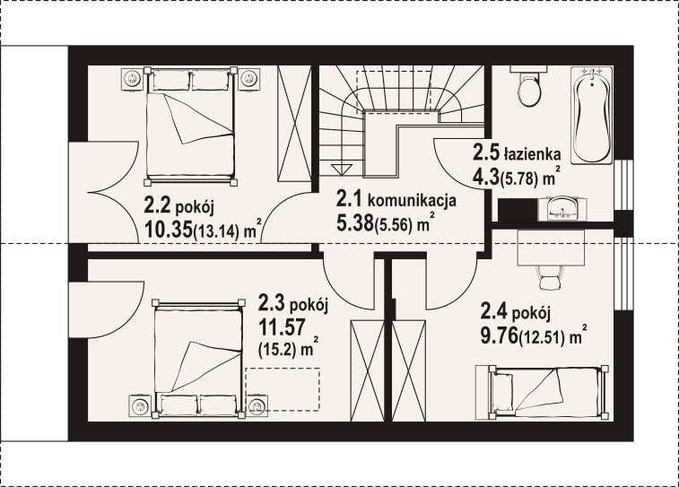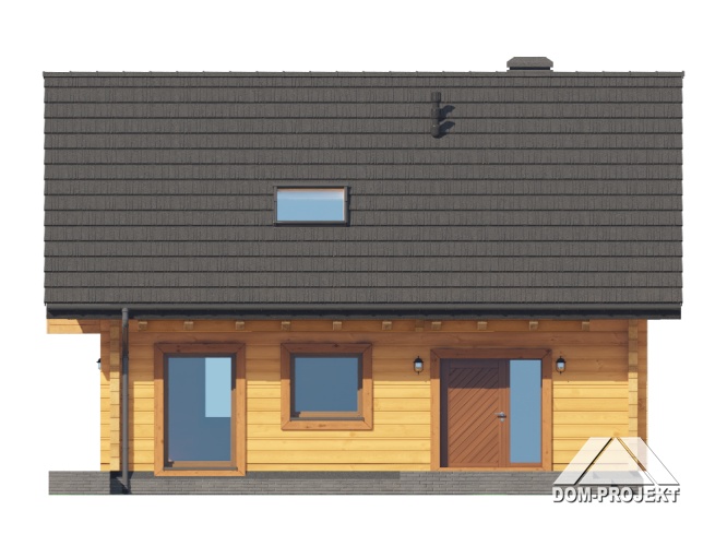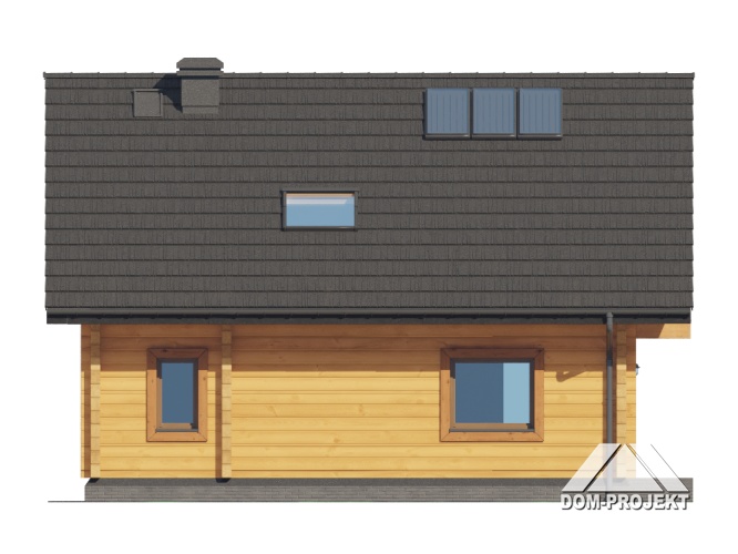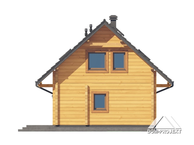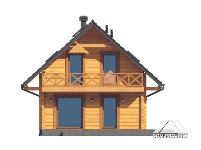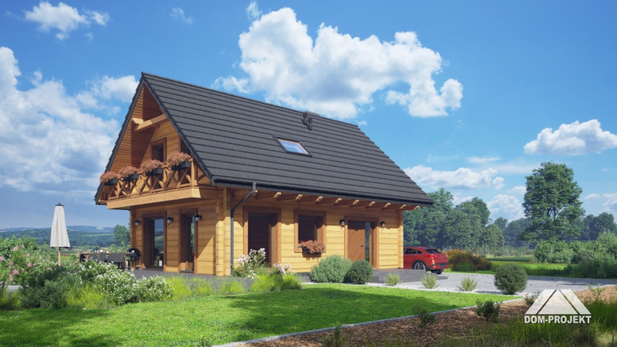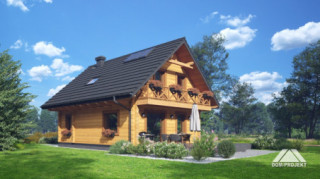 Dom z bali. Na parterze salon z aneksem kuchennym, wyjściem na taras i schodami na poddasze. Komunikacja, wiatrołap, pomieszczenie gospodarcze, łazienka. Na poddaszu trzy pokoje, łazienka, komunikacja oraz balkon dostępny z dwóch pokoi. Zwarta bryła budynku oraz dach dwuspadowy sprzyjają szybkiej i taniej budowie oraz niskim kosztom eksploatacji.