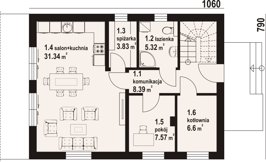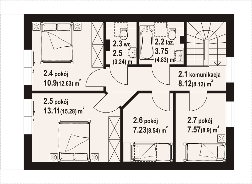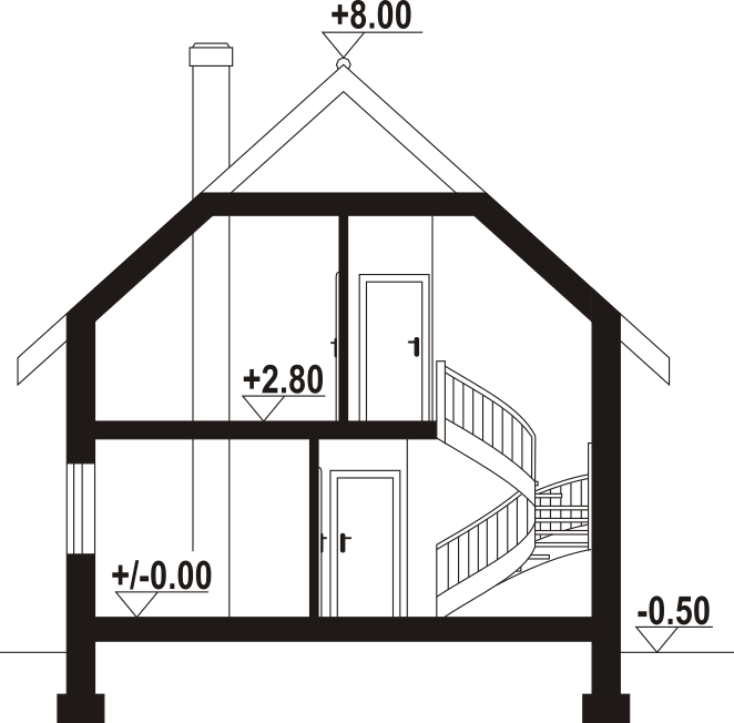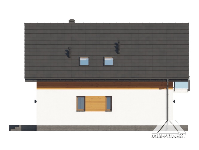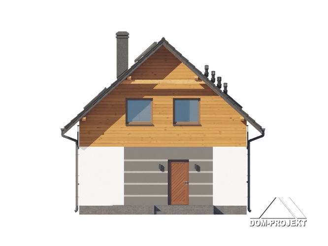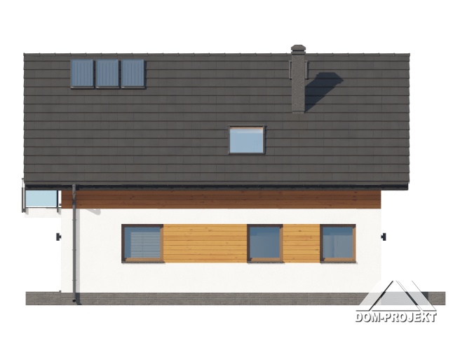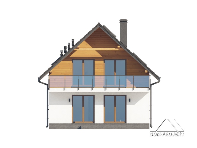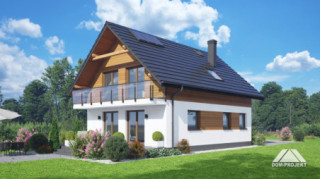 Dom z poddaszem użytkowym. Na parterze salon z aneksem kuchennym oraz wyjściami na taras. Pokój, kotłownia, komunikacja, łazienka, spiżarka. Na poddaszu cztery pokoje, wc, łazienka, komunikacja oraz balkon dostępny z dwóch pokoi. Zwarta bryła budynku oraz dach dwuspadowy sprzyjają szybkiej i taniej budowie oraz niskim kosztom eksploatacji.
