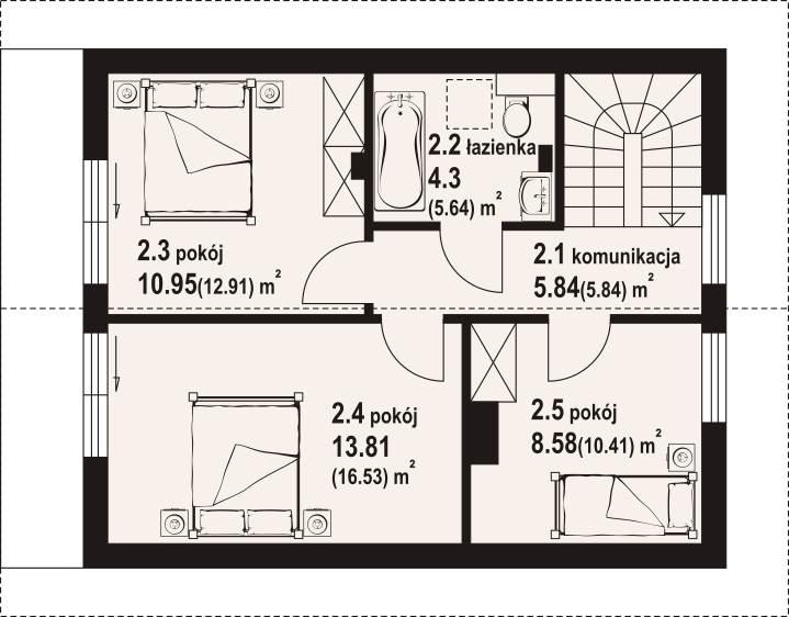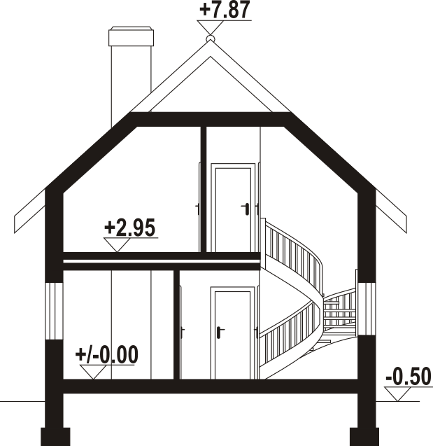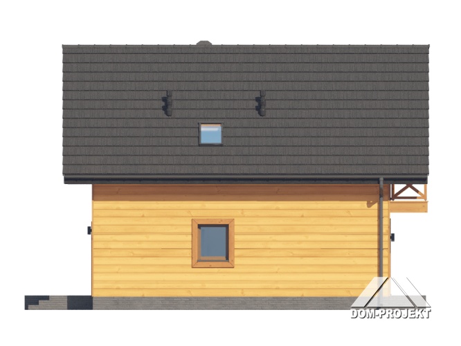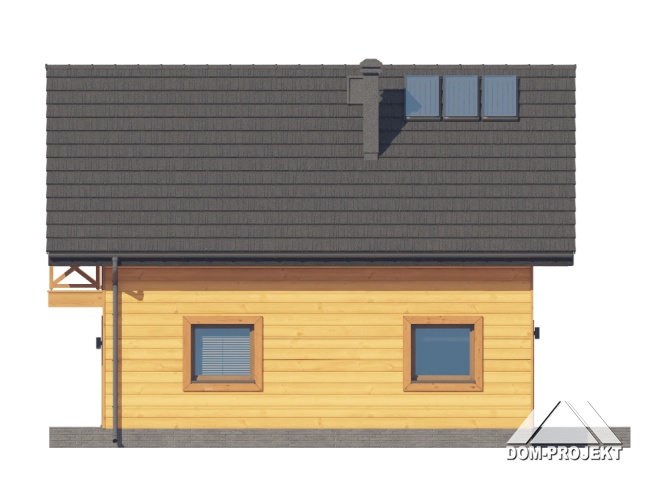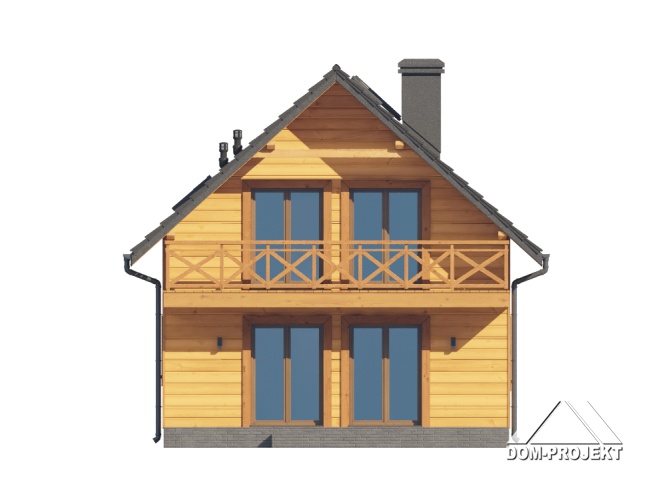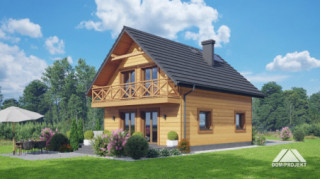 Dom w konstrukcji szkieletu drewnianego. Na parterze salon z aneksem kuchennym, kominkiem oraz wyjściem na taras. Łazienka, kotłownia, wiatrołap. Na poddaszu trzy pokoje, łazienka, komunikacja, balkon dostępny z dwóch pokoi. Zwarta bryła budynku oraz dach dwuspadowy sprzyjają szybkiej i taniej budowie oraz niskim kosztom eksploatacji.