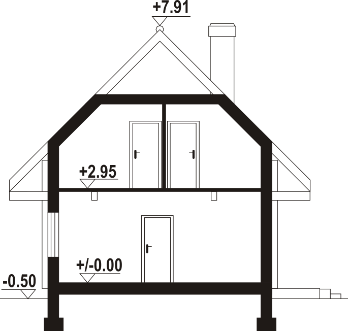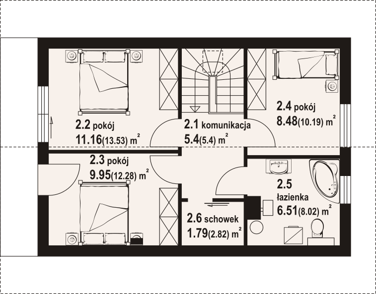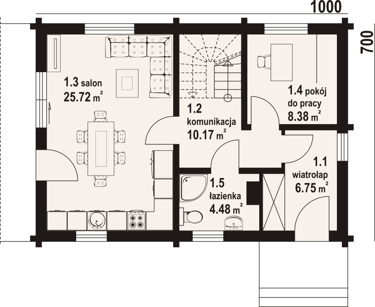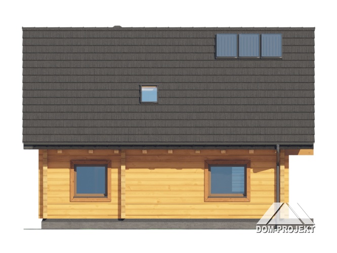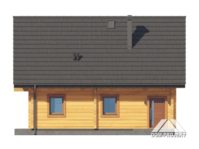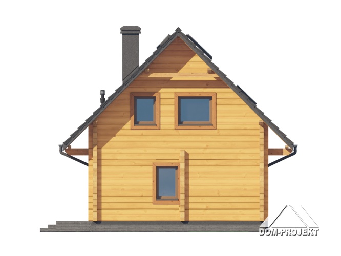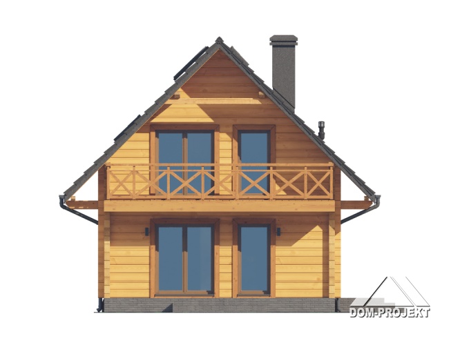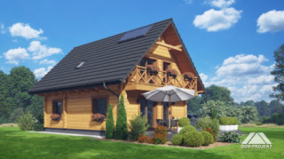Dom z bali drewnianych. Na parterze salon z aneksem kuchennym oraz wyjściem na taras. Komunikacja, pokój, wiatrołap, łazienka. Na poddaszu trzy pokoje, komunikacja, schowek, łazienka oraz balkon dostępny z dwóch pokoi. Zwarta bryła budynku oraz dach dwuspadowy sprzyjają szybkiej i taniej budowie oraz niskim kosztom eksploatacji.