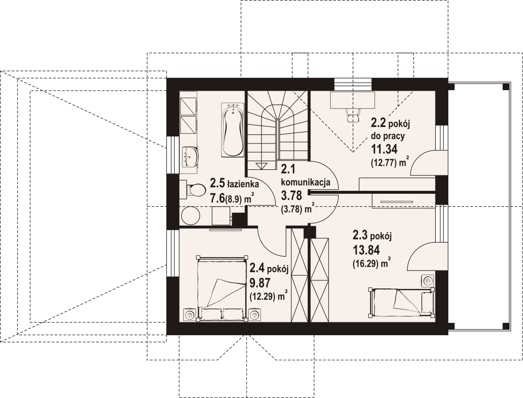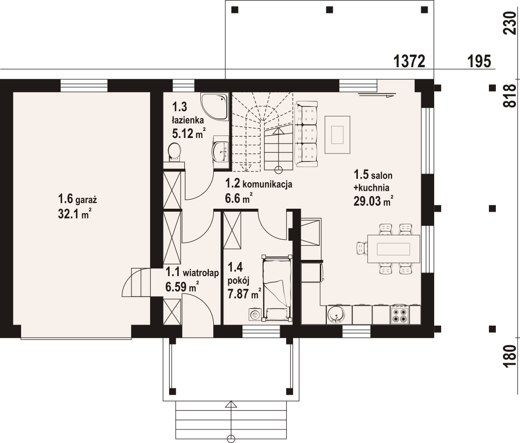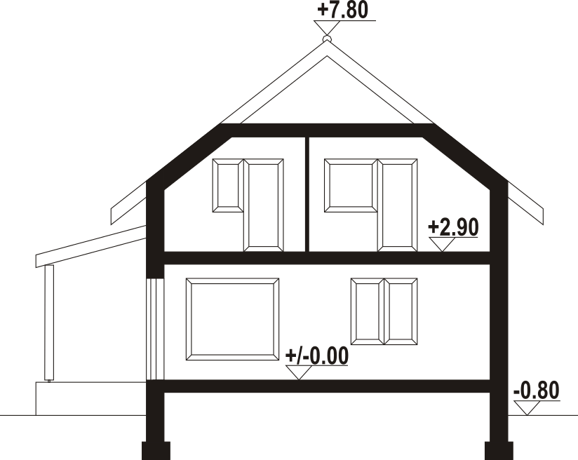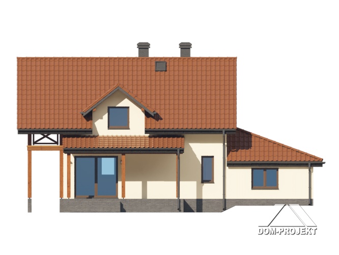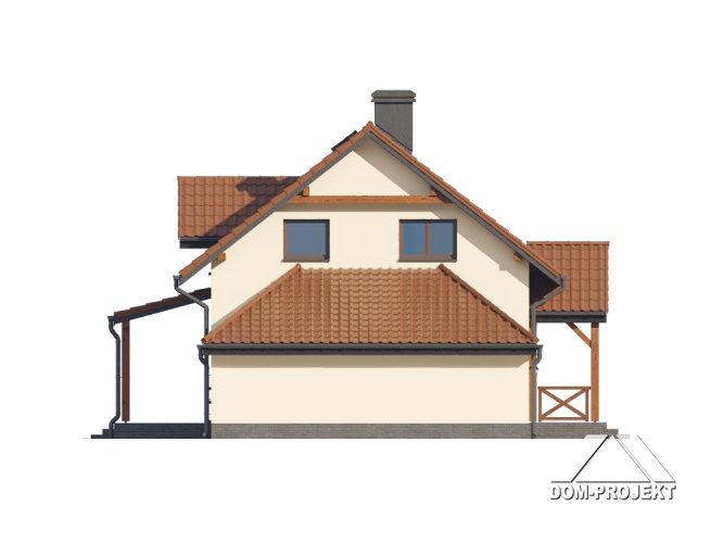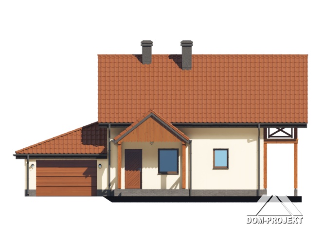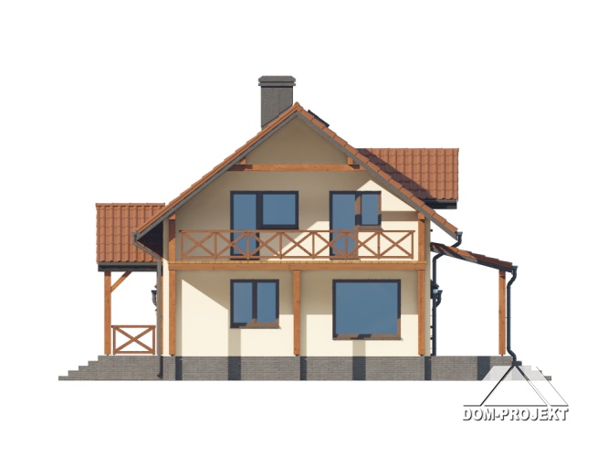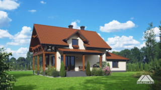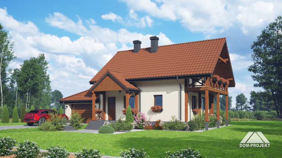 Dom z poddaszem użytkowym. Na parterze salon z aneksem kuchennym, kominkiem oraz wyjściem na zadaszony taras. Pokój, łazienka, komunikacja, wiatrołap oraz garaż. Na poddaszu trzy pokoje, łazienka, komunikacja oraz balkon. Zwarta bryła budynku oraz dach dwuspadowy sprzyjają szybkiej i taniej budowie oraz niskim kosztom eksploatacji.