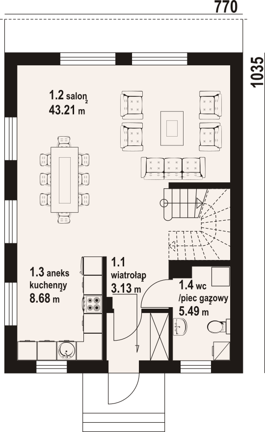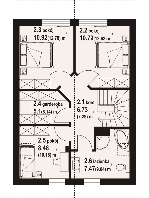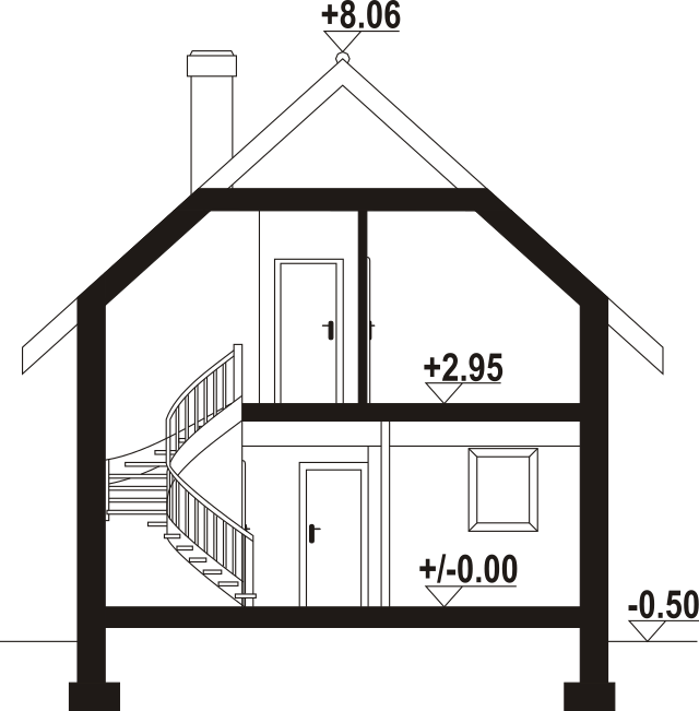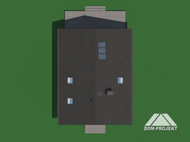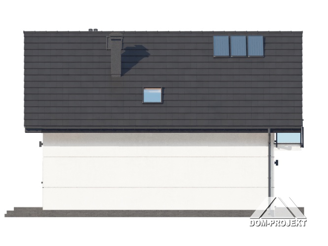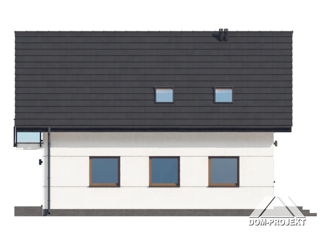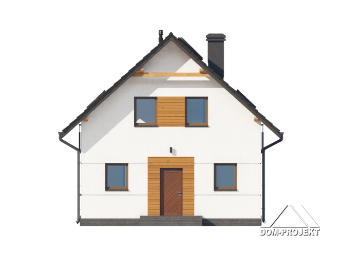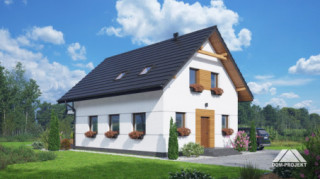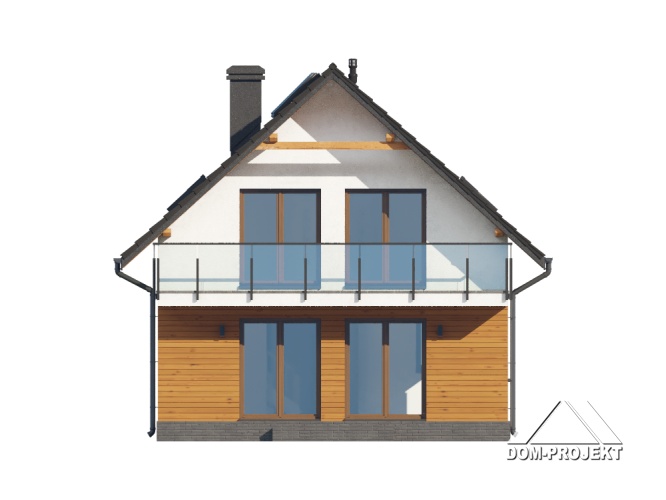 Dom z poddaszem użytkowym. Na parterze salon z aneksem kuchennym oraz wyjściem na taras. Wiatrołap, wc z piecem gazowym. Na poddaszu trzy pokoje, łazienka, garderoba, komunikacja oraz balkon dostępny z dwóch pokoi. Zwarta bryła budynku oraz dach dwuspadowy sprzyjają szybkiej i taniej budowie oraz niskim kosztom eksploatacji.