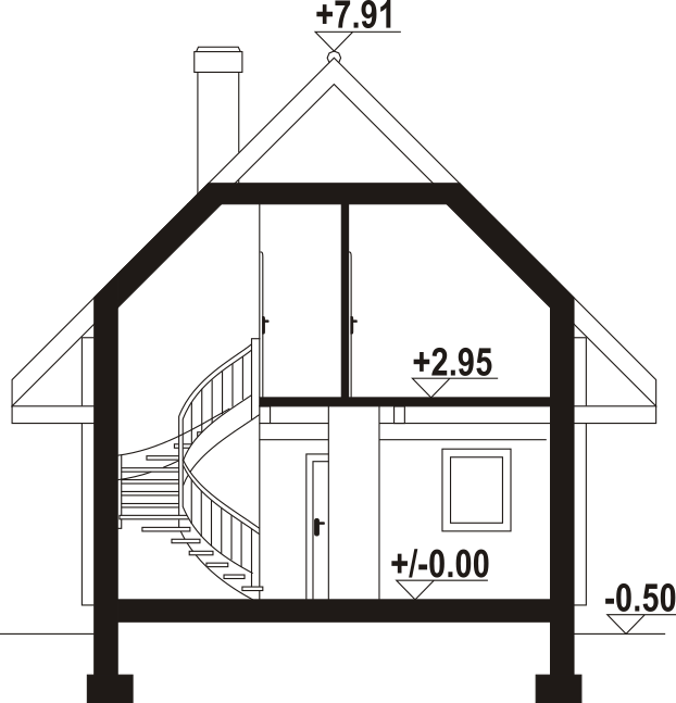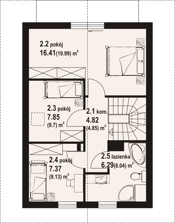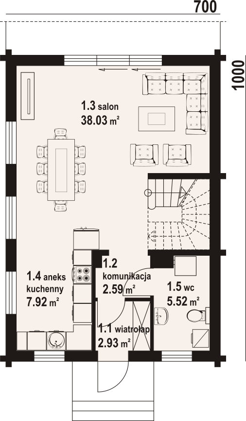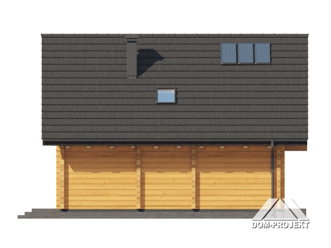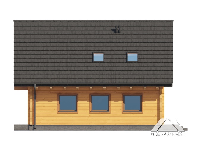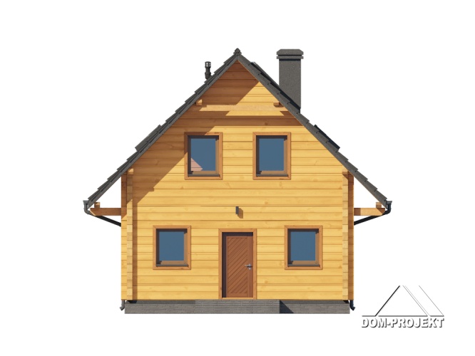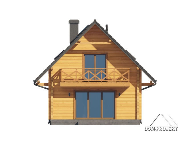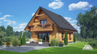 Dom z bali. Na parterze salon z aneksem kuchennym oraz wyjściem na taras. Komunikacja, wc, wiatrołap. Na poddaszu trzy pokoje, łazienka, komunikacja oraz balkon. Zwarta bryła budynku oraz dach dwuspadowy sprzyjają szybkiej i taniej budowie oraz niskim kosztom eksploatacji.