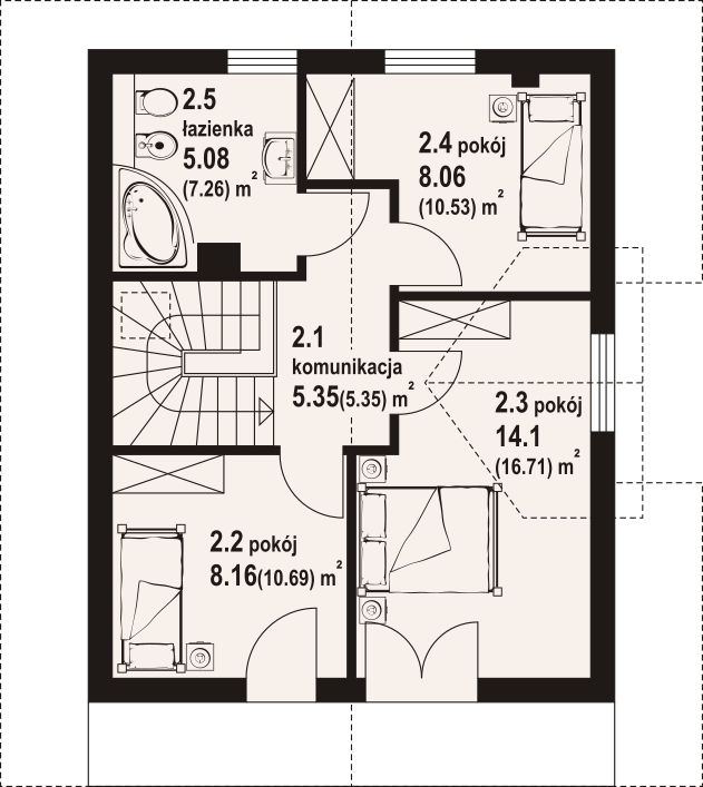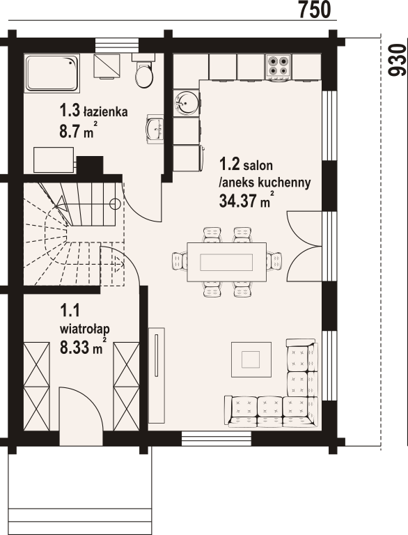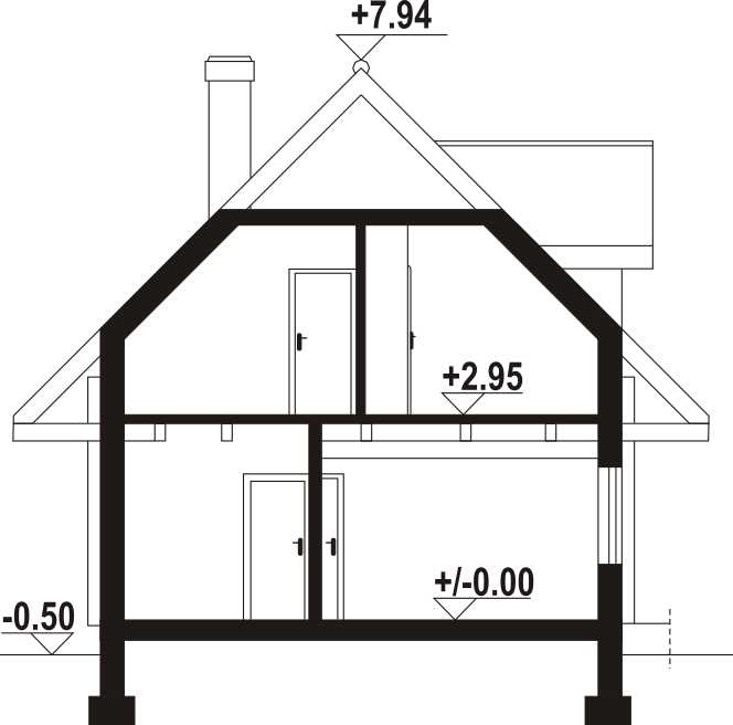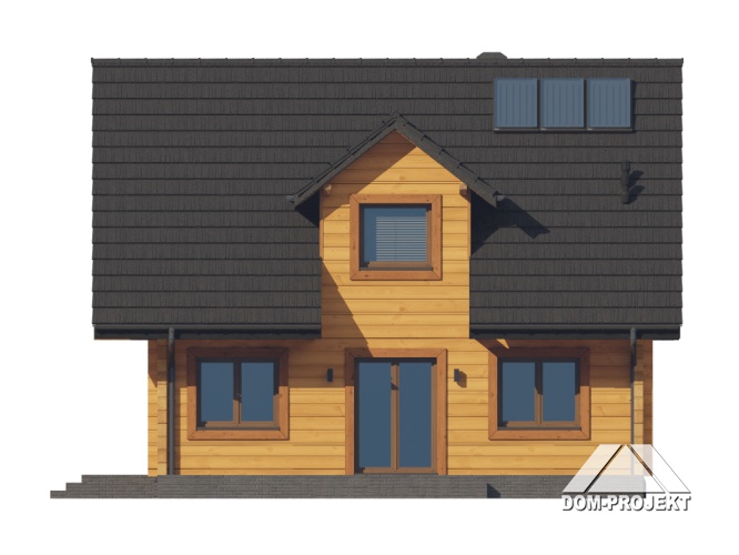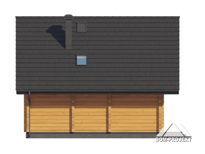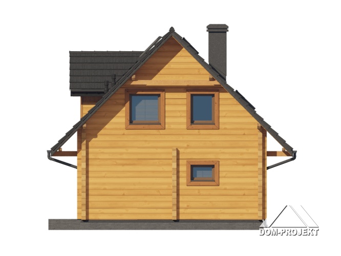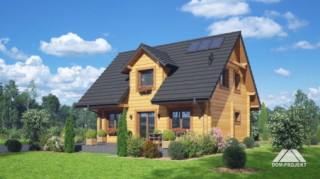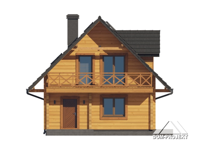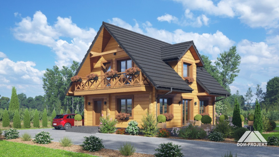 Dom z bali. Na parterze salon z aneksem kuchennym, wyjściem na taras i schodami na poddasze. Wiatrołap, łazienka. Na poddaszu trzy pokoje, łazienka, komunikacja. Balkon dostępny z dwóch pokoi. Zwarta bryła budynku oraz dach dwuspadowy sprzyjają szybkiej i taniej budowie oraz niskim kosztom eksploatacji.