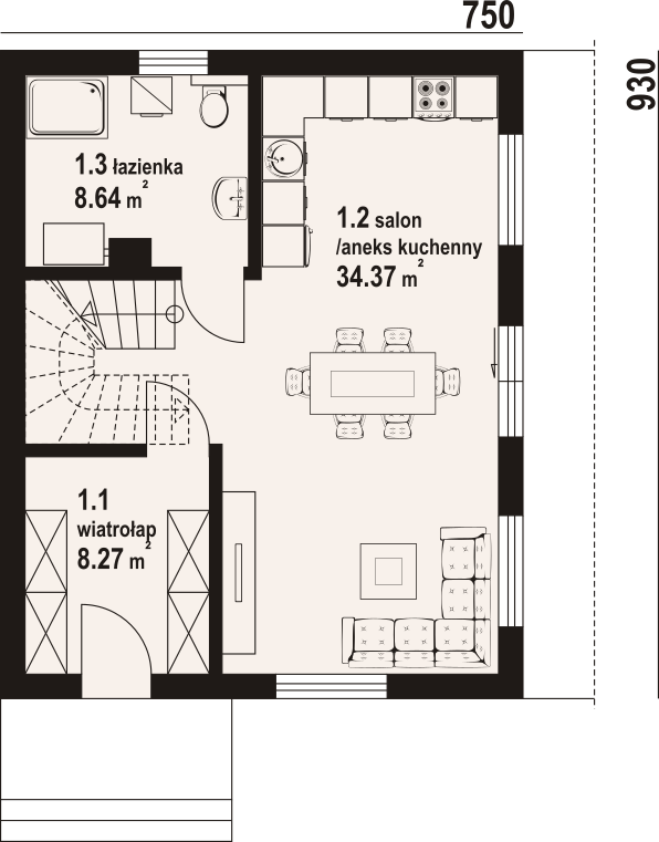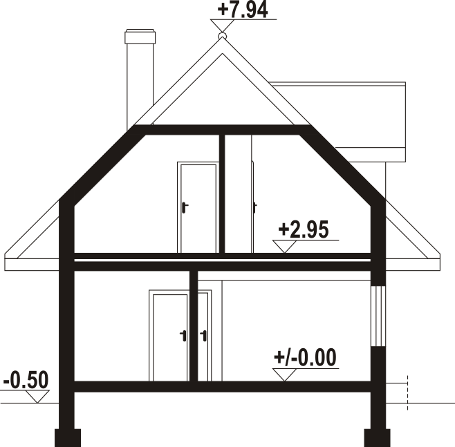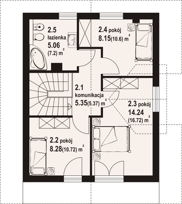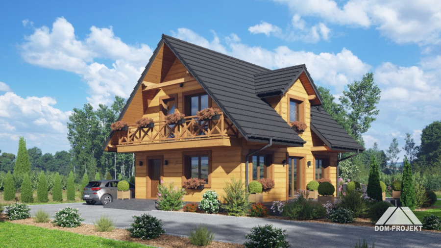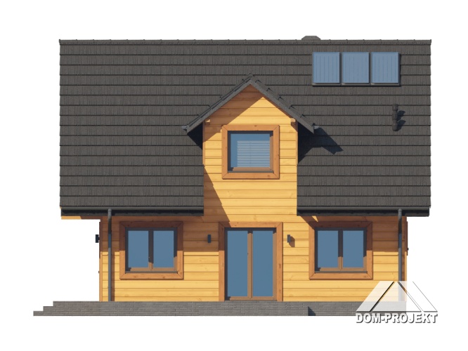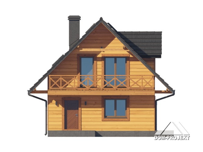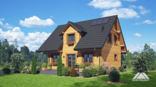 Dom w konstrukcji szkieletu drewnianego. Na parterze salon z aneksem kuchennym oraz wyjściami na taras. Łazienka, wiatrołap. Na poddaszu trzy pokoje, łazienka, komunikacja, balkon dostępny z dwóch pokoi. Zwarta bryła budynku oraz dach dwuspadowy sprzyjają szybkiej i taniej budowie oraz niskim kosztom eksploatacji.