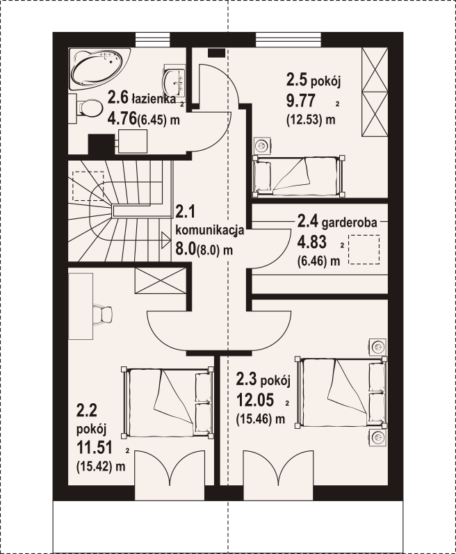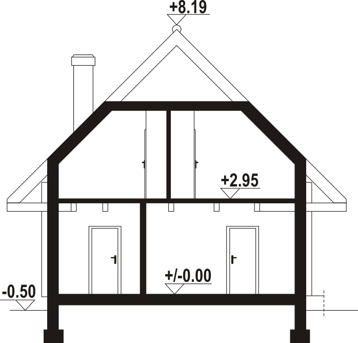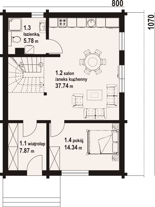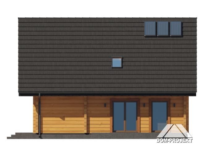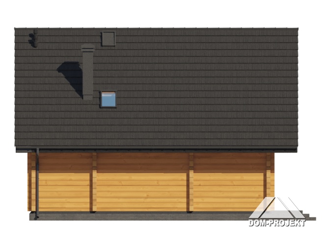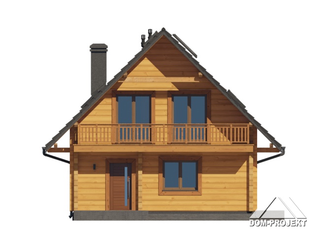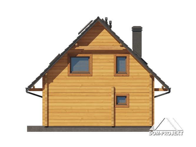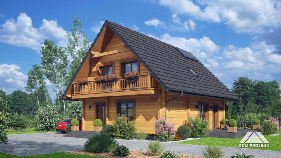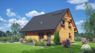 Dom z bali. Na parterze duży salon z aneksem kuchennym, wyjściem na taras i schodami na poddasze. Pokój, łazienka, wiatrołap. Na poddaszu trzy pokoje, komunikacja, łazienka, garderoba. Zwarta bryła budynku oraz dach dwuspadowy sprzyjają szybkiej i taniej budowie oraz niskim kosztom eksploatacji.