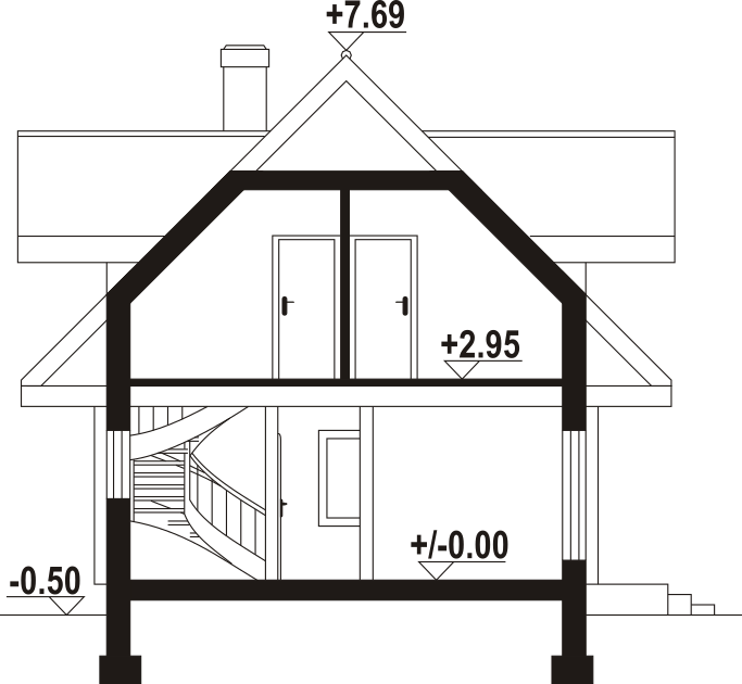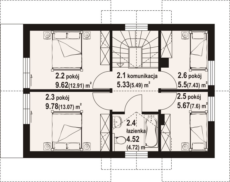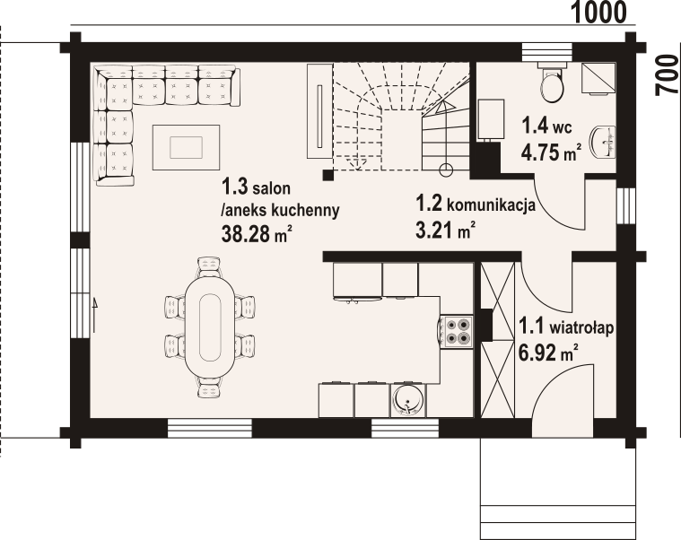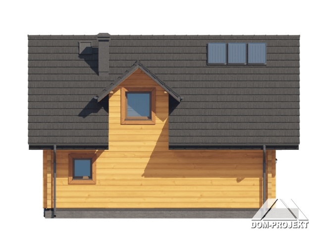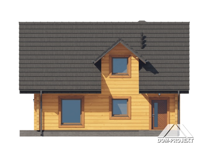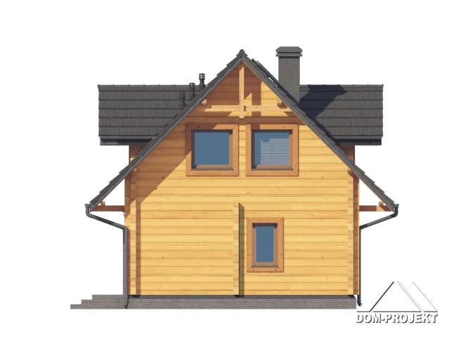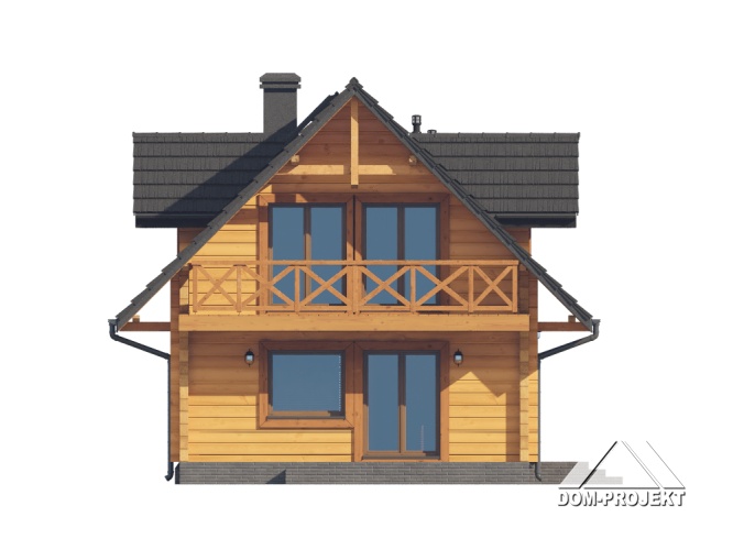 Dom z bali. Na parterze salon z aneksem kuchennym, wyjściem na taras i schodami na poddasze. Komunikacja, wc, wiatrołap. Na poddaszu cztery pokoje, łazienka, komunikacja oraz balkon dostępny z dwóch pokoi. Zwarta bryła budynku oraz dach dwuspadowy sprzyjają szybkiej i taniej budowie oraz niskim kosztom eksploatacji.