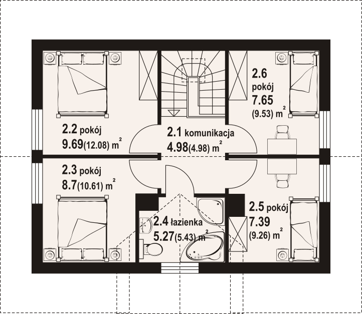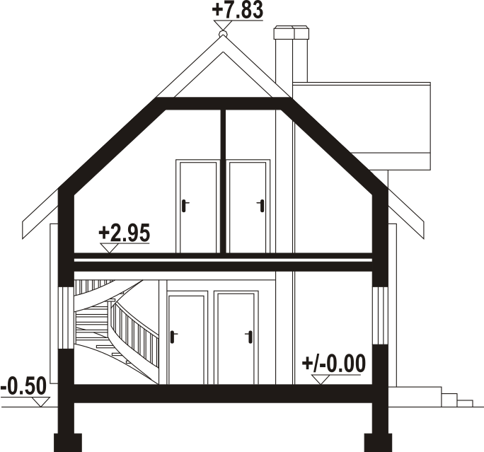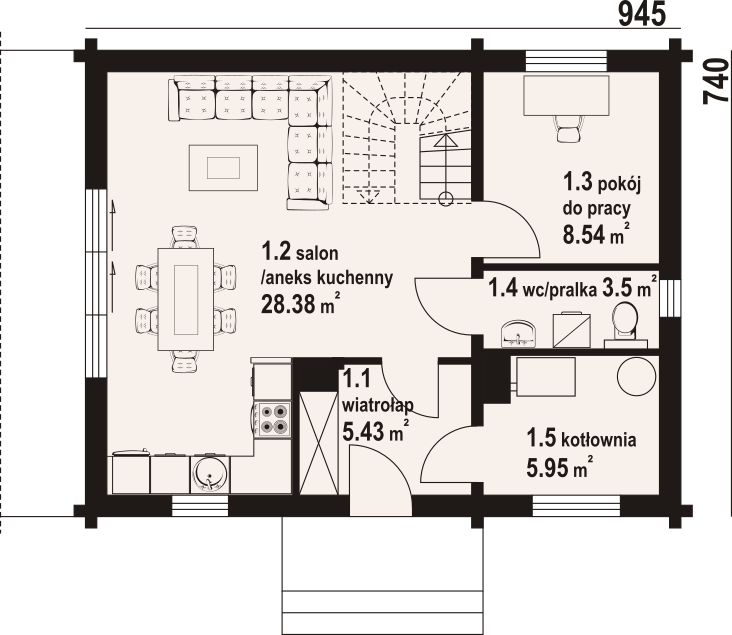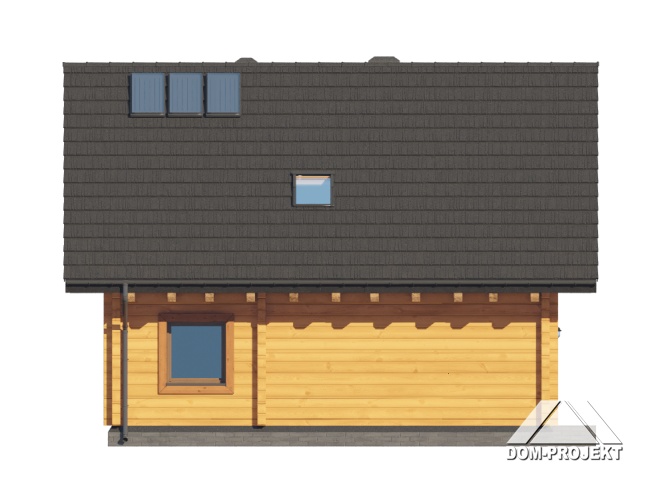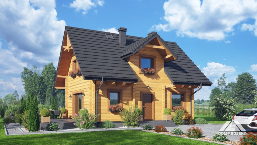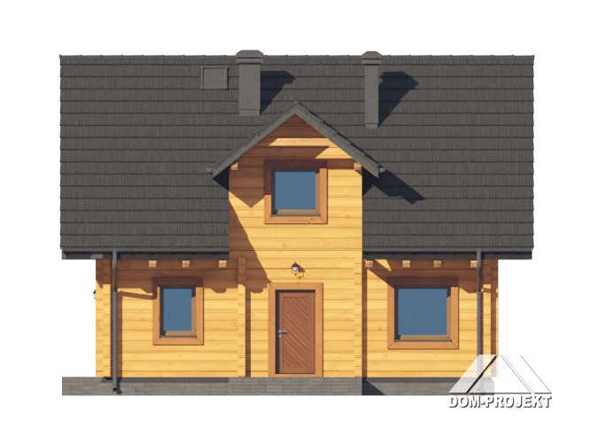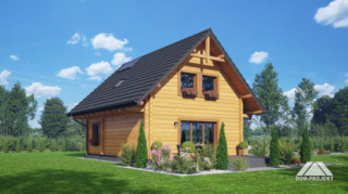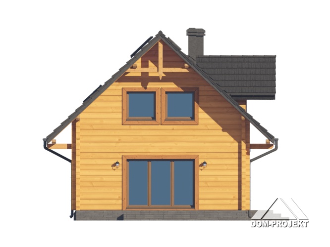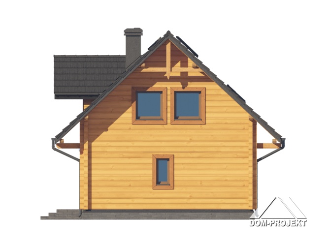 Dom z bali. Na parterze salon z aneksem kuchennym, wyjściem na taras i schodami na poddasze. Pokój do pracy, wc z pralką, kotłownia, wiatrołap. Na poddaszu cztery pokoje, łazienka, komunikacja. Zwarta bryła budynku oraz dach dwuspadowy sprzyjają szybkiej i taniej budowie oraz niskim kosztom eksploatacji.