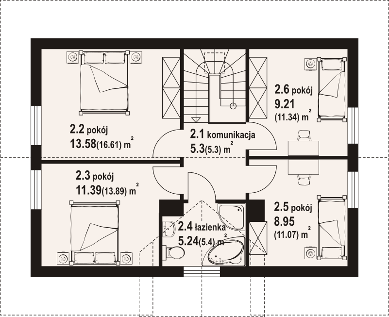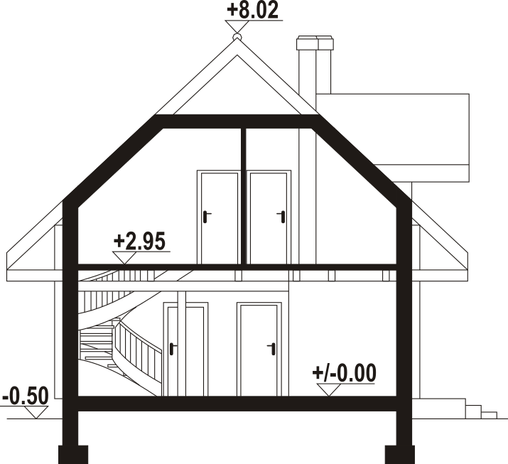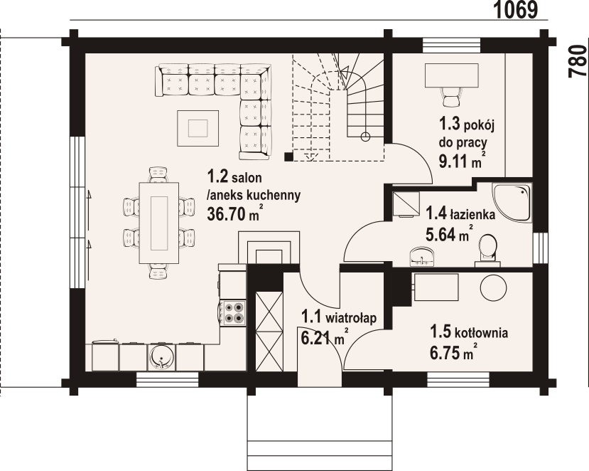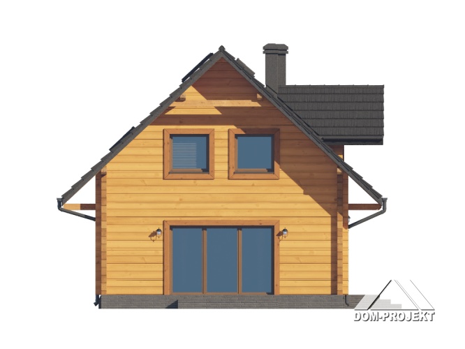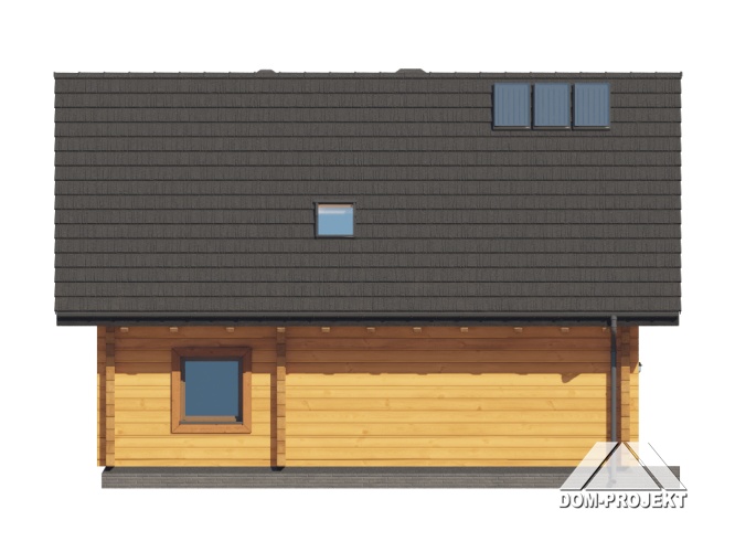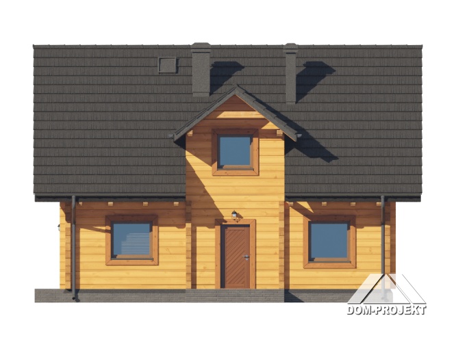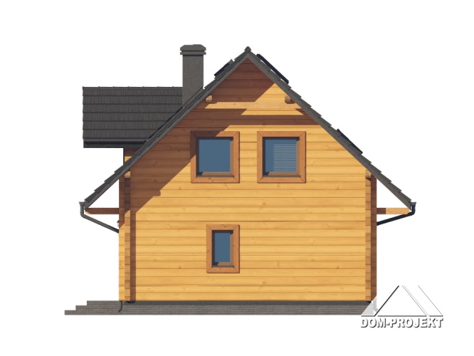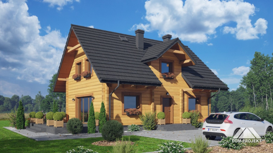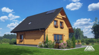 Dom z bali. Na parterze salon z aneksem kuchennym, komikiem, wyjściem na taras i schodami na poddasze. Pokój do pracy, łazienka, kotłownia, wiatrołap. Na poddaszu cztery pokoje, łazienka, komunikacja. Zwarta bryła budynku oraz dach dwuspadowy sprzyjają szybkiej i taniej budowie oraz niskim kosztom eksploatacji.