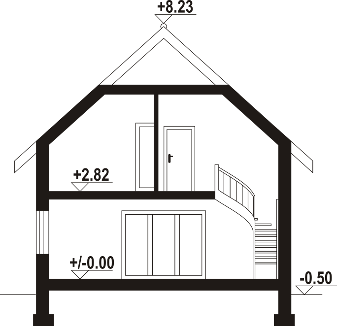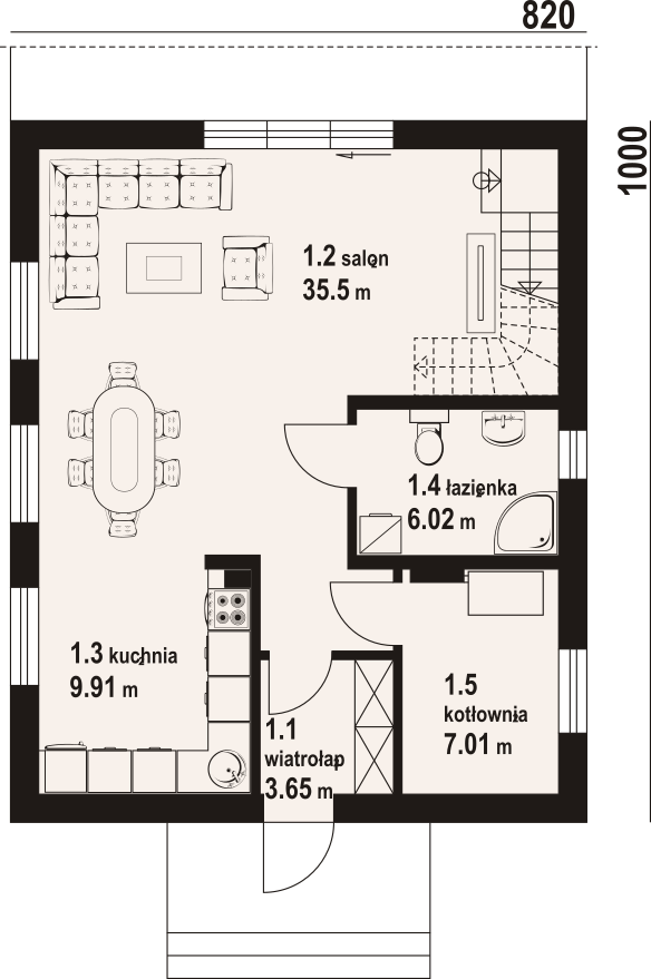 Dom z poddaszem użytkowym. Na parterze duży salon z kuchnią, wyjściem na taras i schodami na poddasze. Łazienka, kotłownia, wiatrołap. Na poddaszu cztery pokoje, komunikacja, łazienka oraz balkon. Zwarta bryła budynku oraz dach dwuspadowy sprzyjają szybkiej i taniej budowie oraz niskim kosztom eksploatacji.