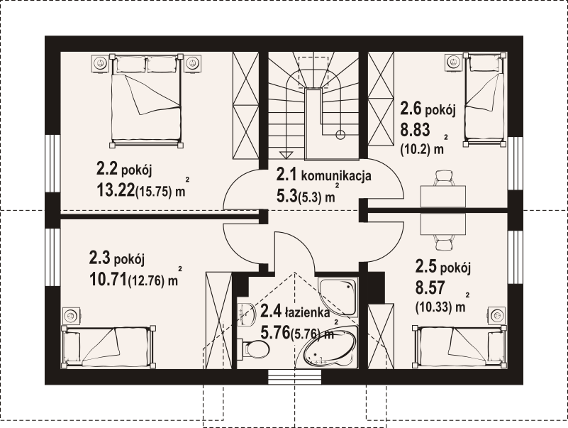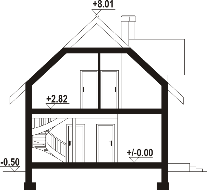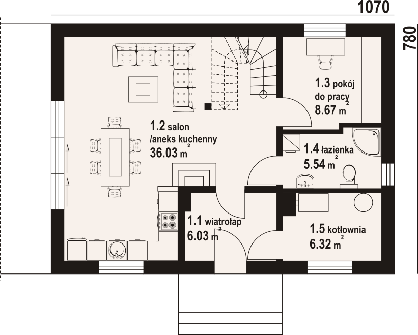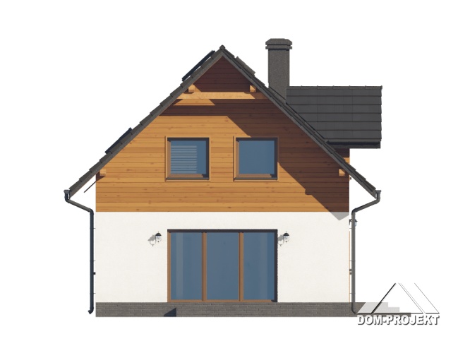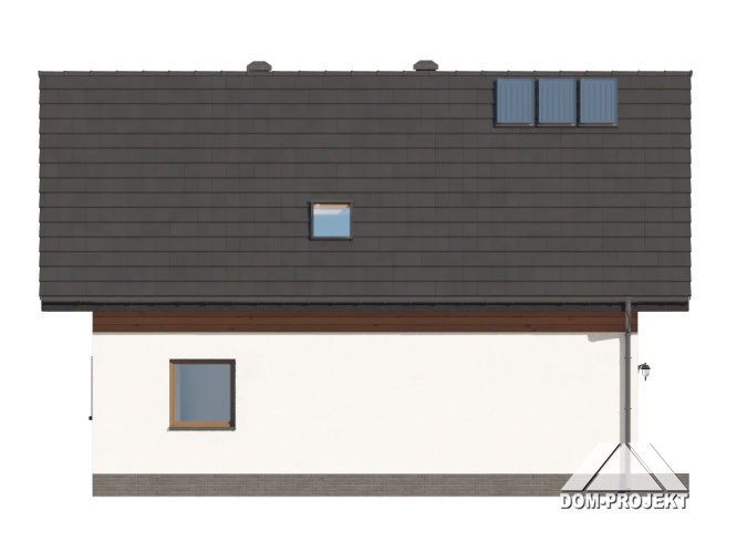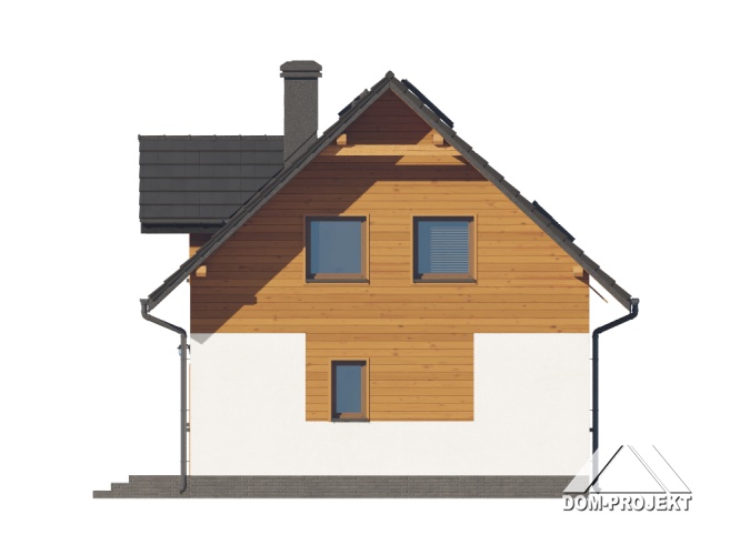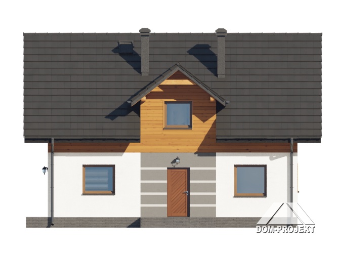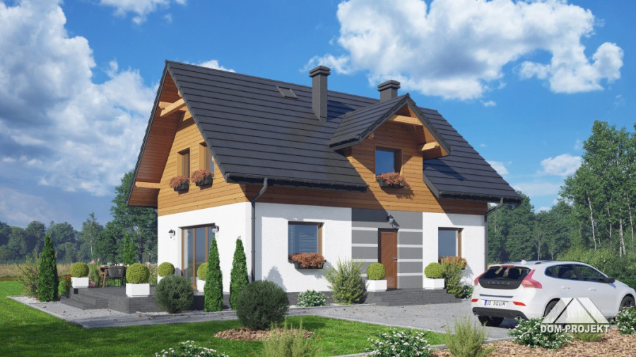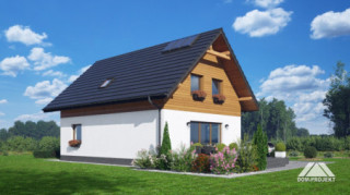 Dom z poddaszem użytkowym. Na parterze salon z aneksem kuchennym, kominkiem, wyjściem na taras i schodami na poddasze. Pokój do pracy, łazienka, kotłownia, wiatrołap. Na poddaszu cztery pokoje, komunikacja, łazienka. Zwarta bryła budynku oraz dach dwuspadowy sprzyjają szybkiej i taniej budowie oraz niskim kosztom eksploatacji.