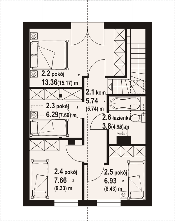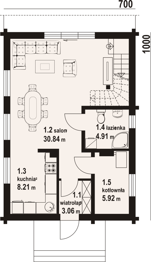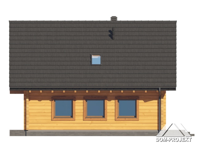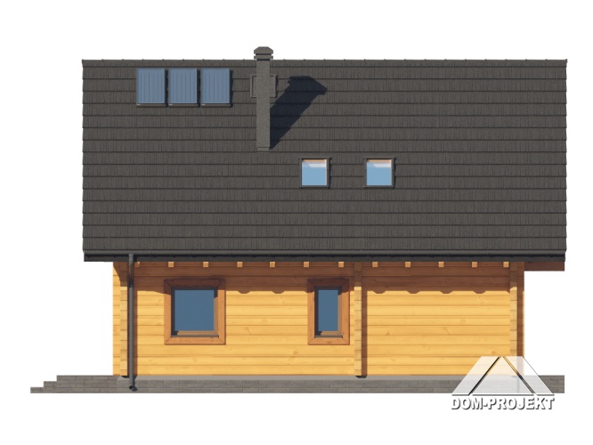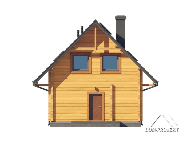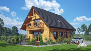 Dom z bali. Na parterze salon wyjściem na taras i schodami na poddasze. Częściowo otwarta kuchnia, łazienka, kotłownia, wiatrołap. Na poddaszu cztery pokoje, komunikacja, łazienka oraz balkon. Zwarta bryła budynku oraz dach dwuspadowy sprzyjają szybkiej i taniej budowie oraz niskim kosztom eksploatacji.