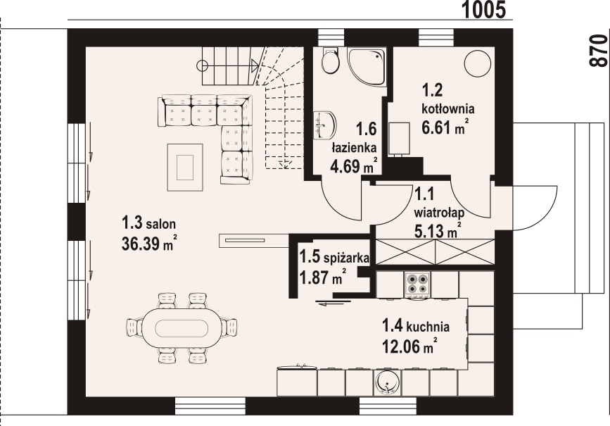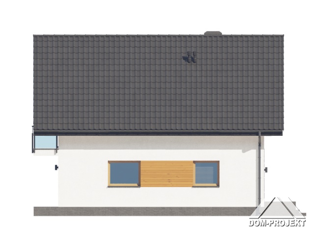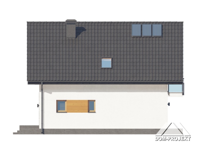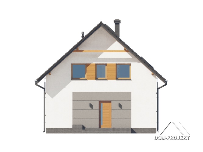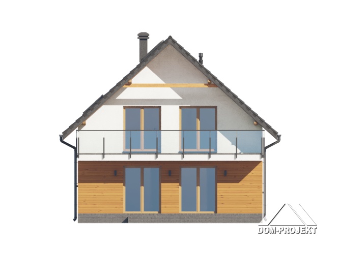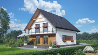 Dom z poddaszem użytkowym. Na parterze salon z kuchnią, wyjściem na taras oraz schodami na poddasze. Spiżarka, łazienka, kotłownia, wiatrołap. Na poddaszu cztery pokoje, łazienka, komunikacja oraz balkon dostępny z dwóch pokoi. Zwarta bryła budynku oraz dach dwuspadowy sprzyjają szybkiej i taniej budowie oraz niskim kosztom eksploatacji.