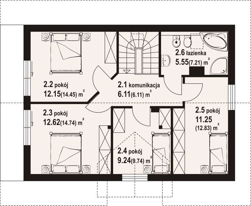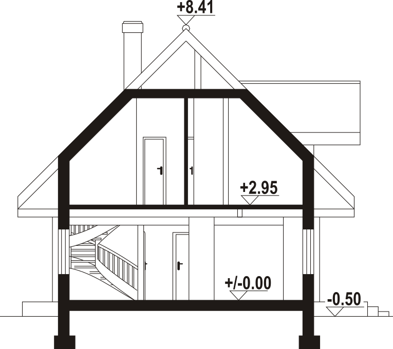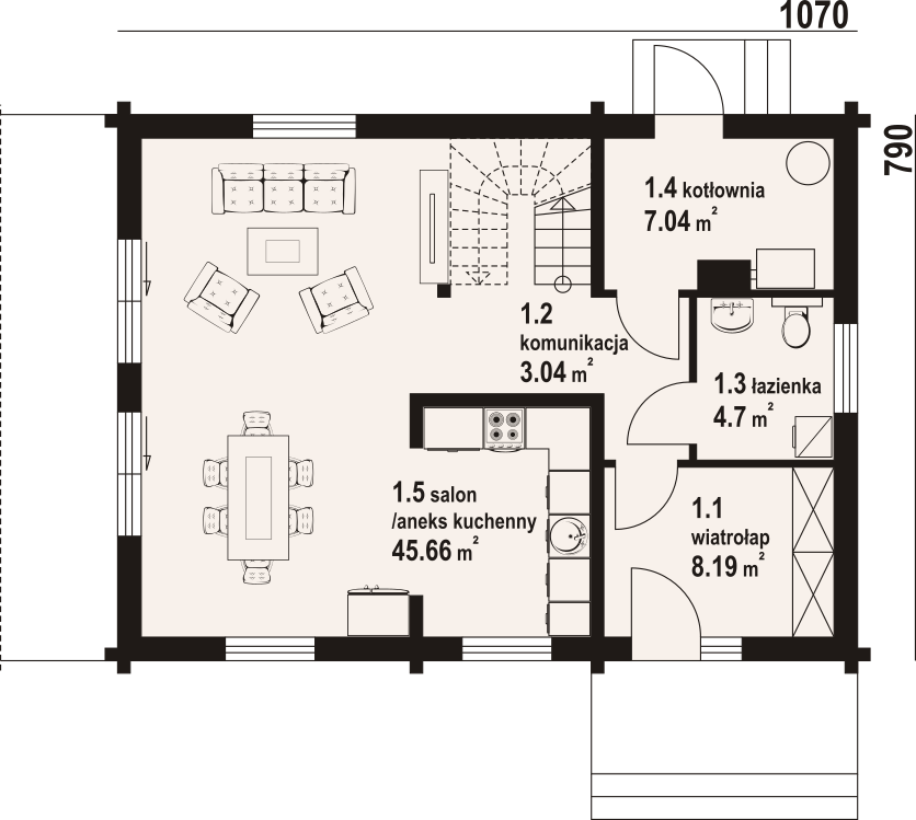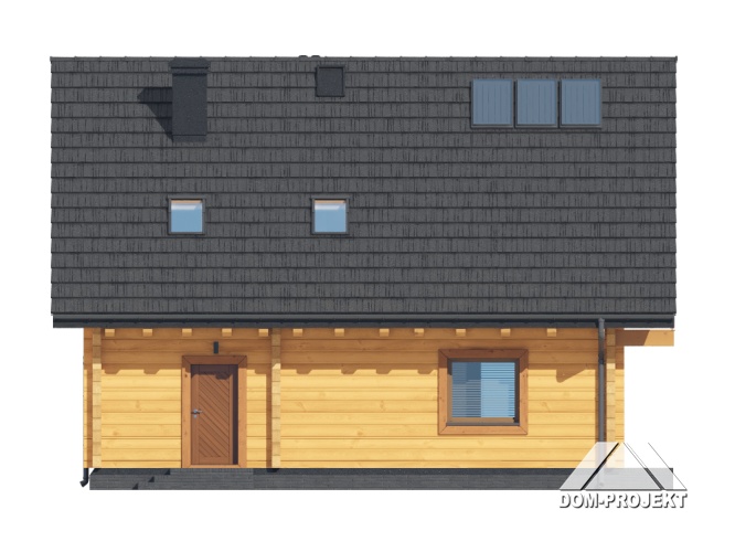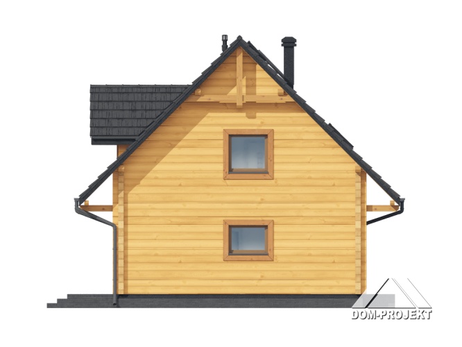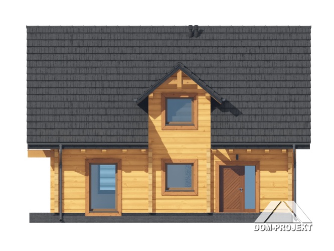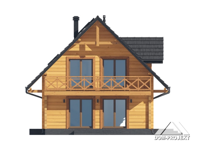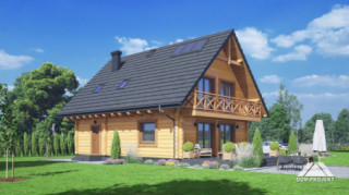 Dom z bali. Na parterze salon z aneksem kuchennym, wyjściem na taras i schodami na poddasze. Kotłownia, łazienka, wiatrołap, komunikacja. Na poddaszu cztery pokoje, łazienka, komunikacja oraz balkon dostępny z dwóch pokoi. Zwarta bryła budynku oraz dach dwuspadowy sprzyjają szybkiej i taniej budowie oraz niskim kosztom eksploatacji.