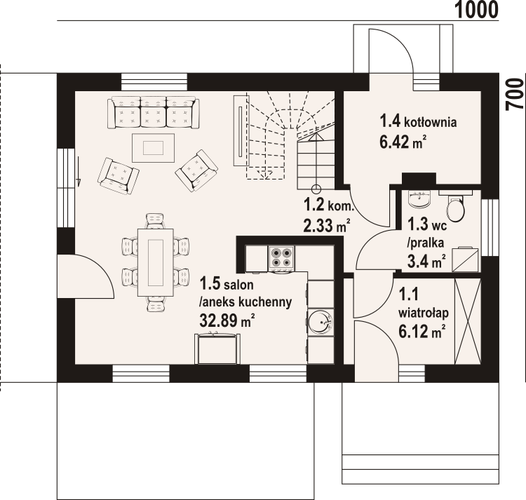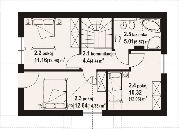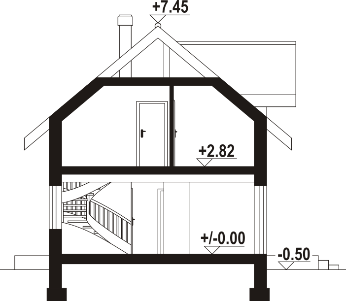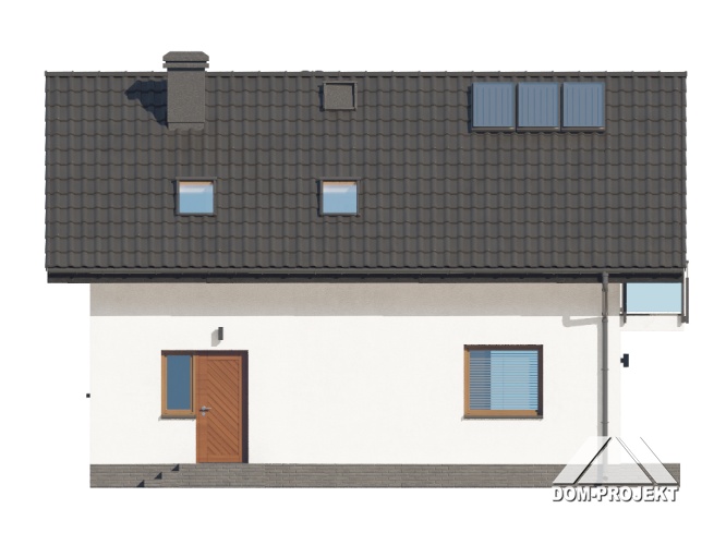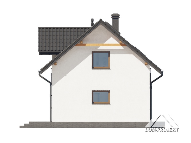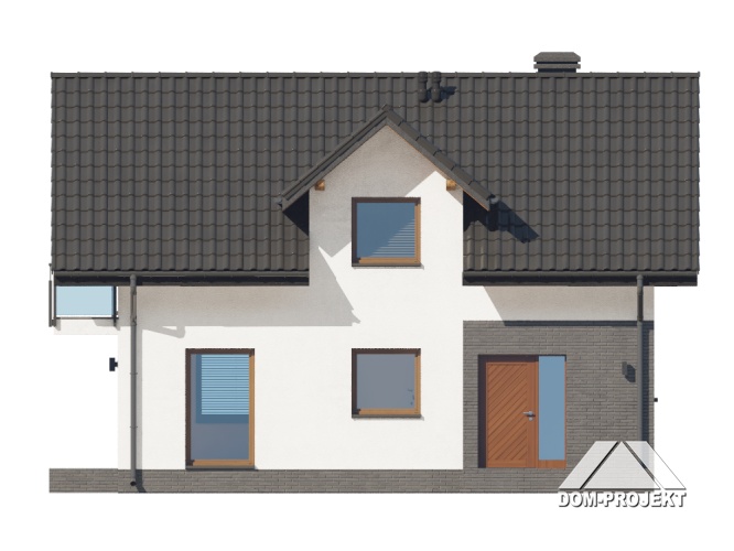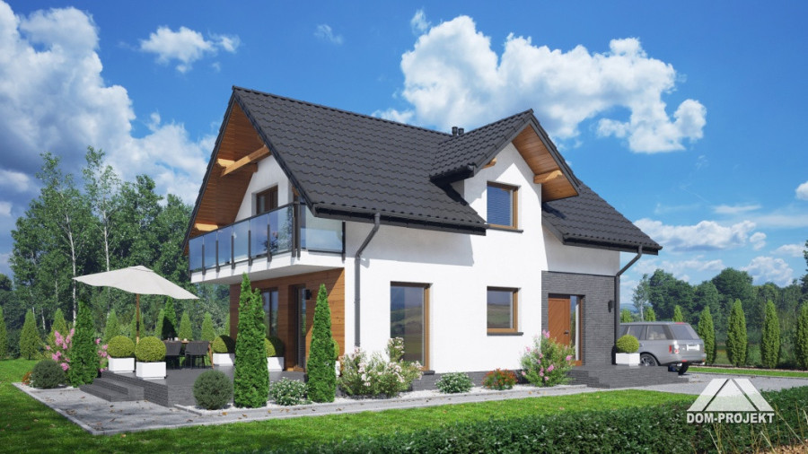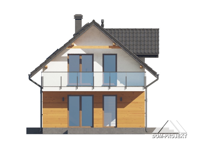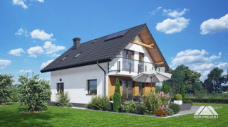 Dom z poddaszem użytkowym. Na parterze salon z aneksem kuchennym, wyjściem na taras i schodami na poddasze. Wiatrołap, komunikacja, wc z pralką, kotłownia. Na poddaszu trzy pokoje, łazienka, komunikacja oraz balkon dostępny z dwu pokoi. Zwarta bryła budynku oraz dach dwuspadowy sprzyjają szybkiej i taniej budowie oraz niskim kosztom eksploatacji.