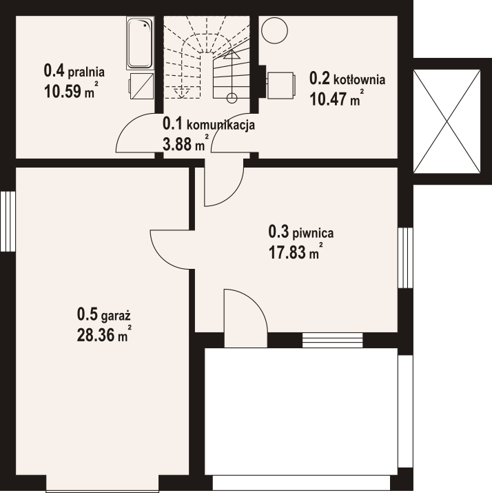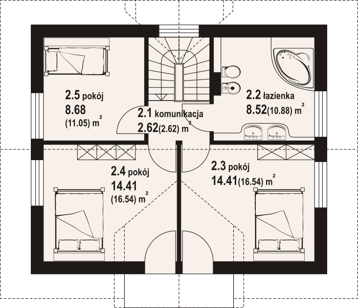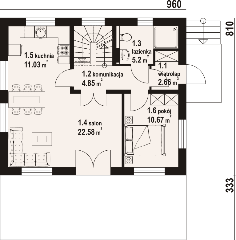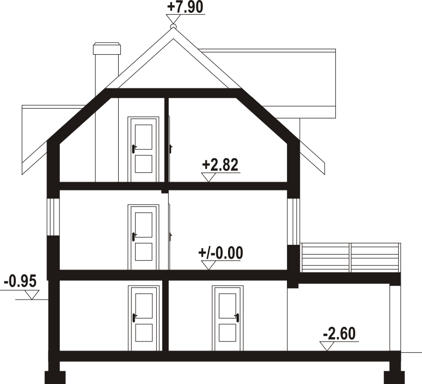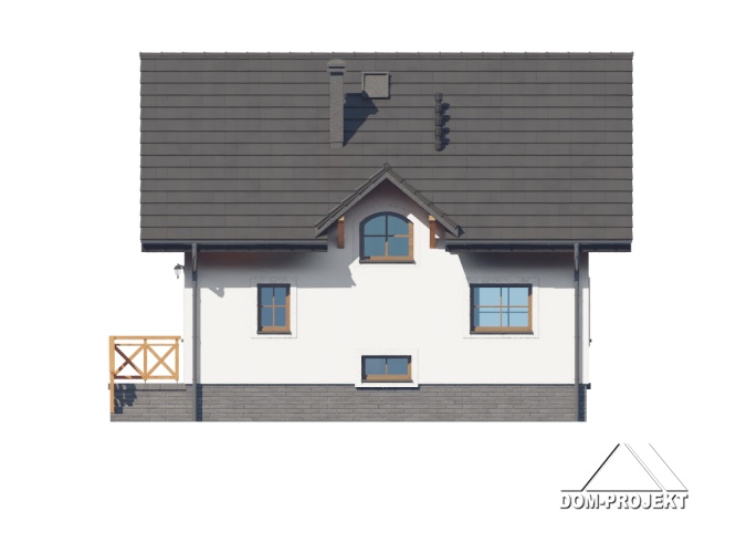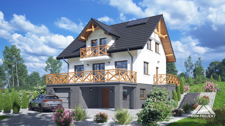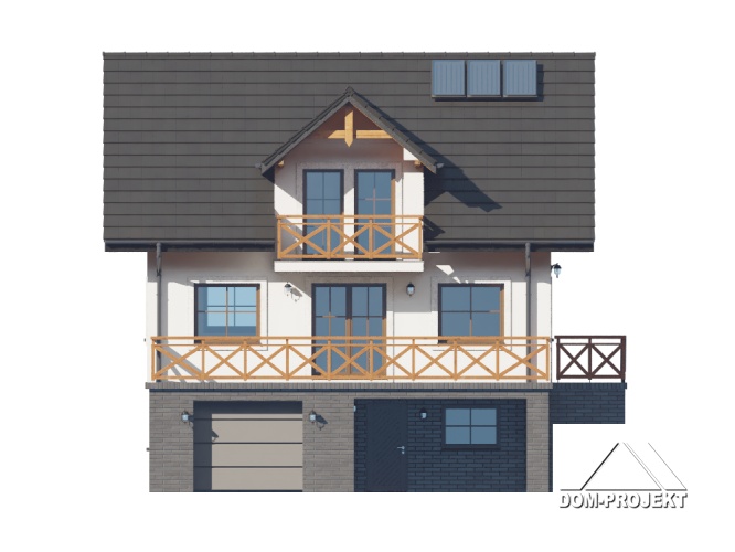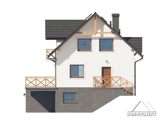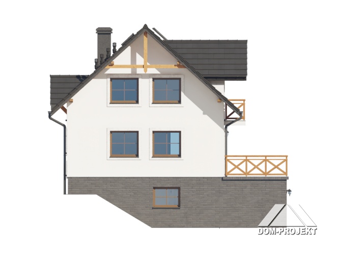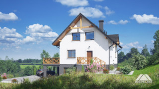 Dom z poddaszem użytkowym. Podpiwniczony. Na parterze salon z kuchnią oraz wyjściem na duży taras. Pokój, łazienka, komunikacja, wiatrołap. Na poddaszu trzy pokoje, łazienka, komunikacja oraz balkon dostępny z dwóch pokoi. W podpiwniczeniu garaż, piwnica, kotłownia, pralnia, komunikacja. Zwarta bryła budynku oraz dach dwuspadowy sprzyjają szybkiej i taniej budowie oraz niskim kosztom eksploatacji.