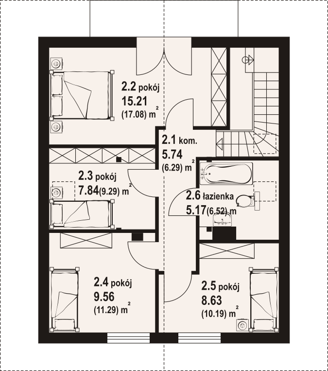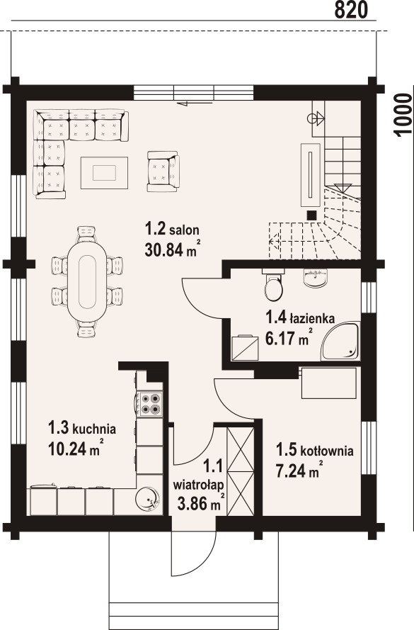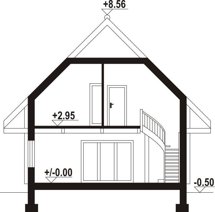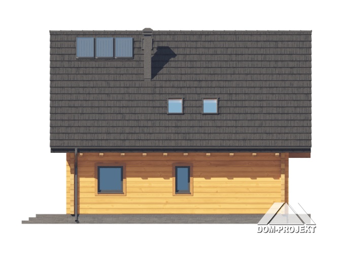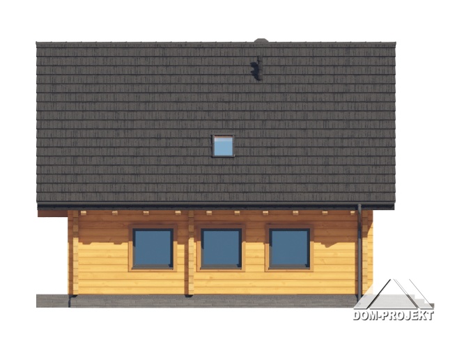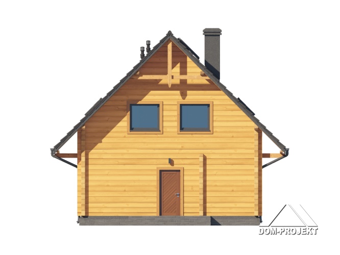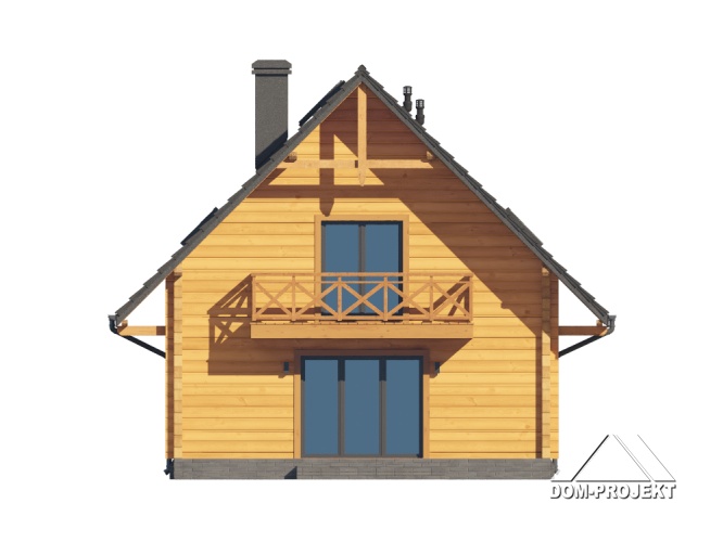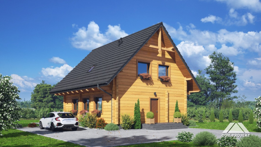 Dom z bali. Na parterze salon z kuchnią, wyjściem na taras i schodami na poddasze. Łazienka, kotłownia, wiatrołap. Na poddaszu cztery pokoje, łazienka, komunikacja oraz balkon. Zwarta bryła budynku oraz dach dwuspadowy sprzyjają szybkiej i taniej budowie oraz niskim kosztom eksploatacji.