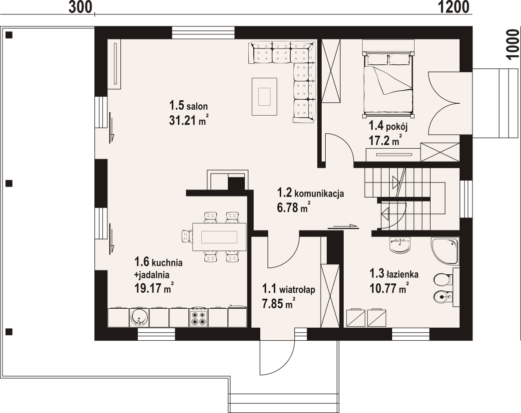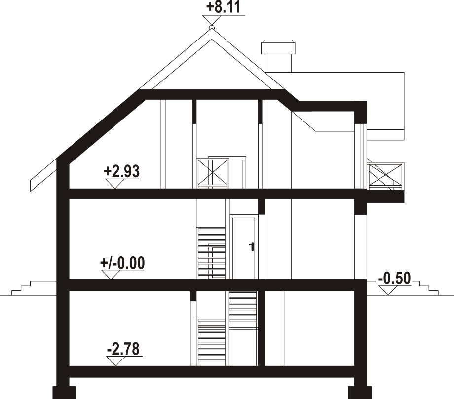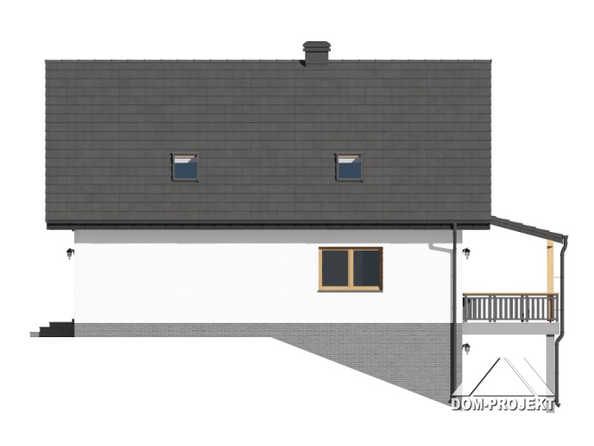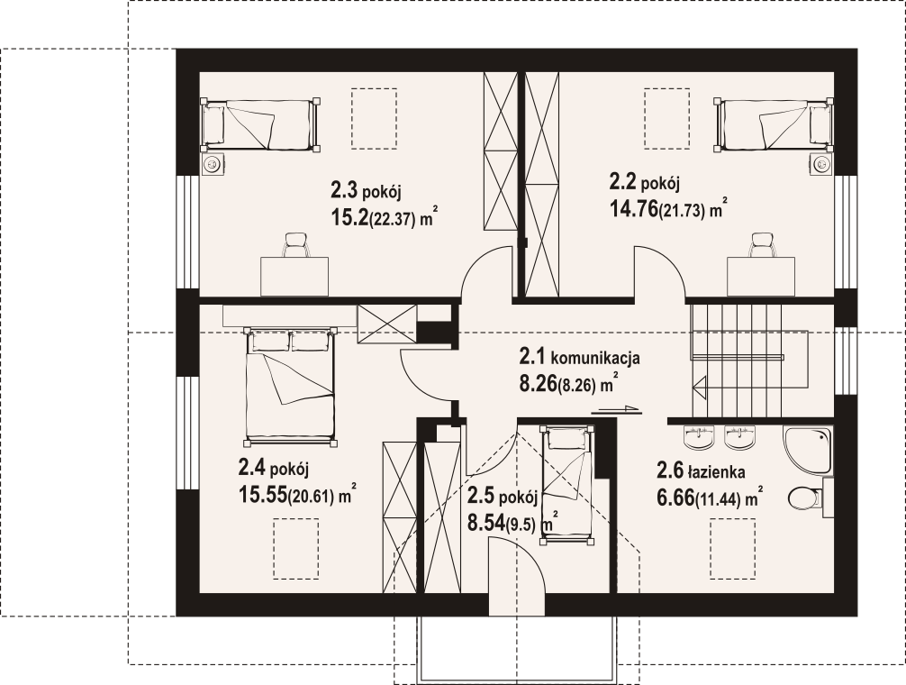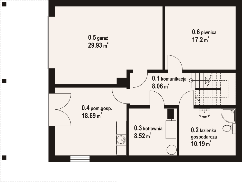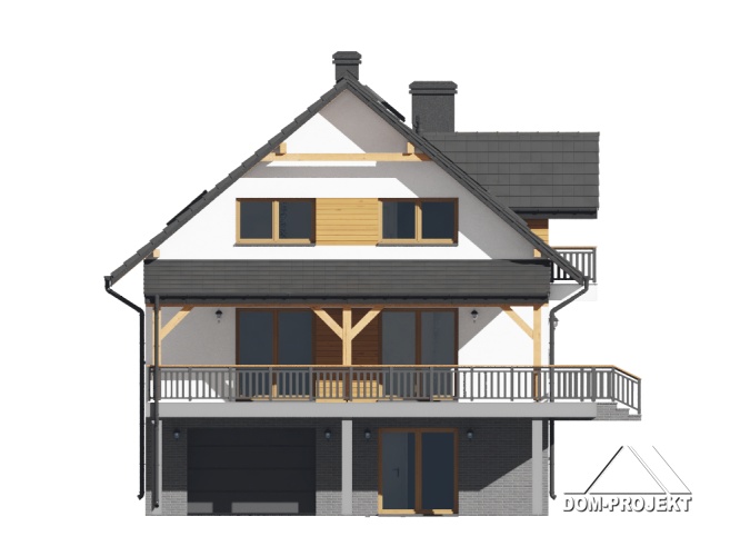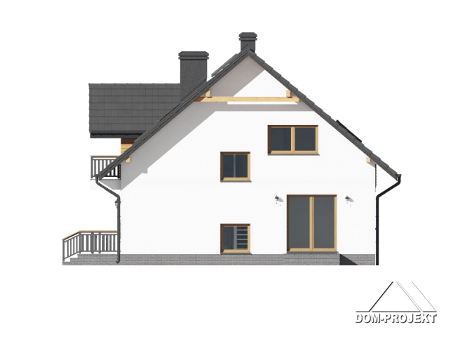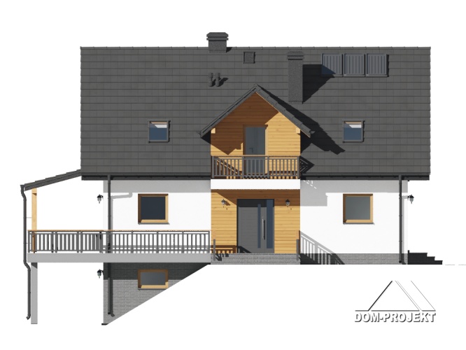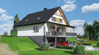 Dom z poddaszem użytkowym. Podpiwniczony. Na parterze salon z kominkiem, wyjściem na zadaszony taras oraz przejściem do kuchni. Kuchnia z jadalnią, pokój, komunikacja, łazienka, wiatrołap. Na poddaszu cztery pokoje, łazienka, komunikacja oraz balkon. W podpiwniczeniu garaż, piwnica, komunikacja, pomieszczenie gospodarcze, kotłownia, łazienka gospodarcza.