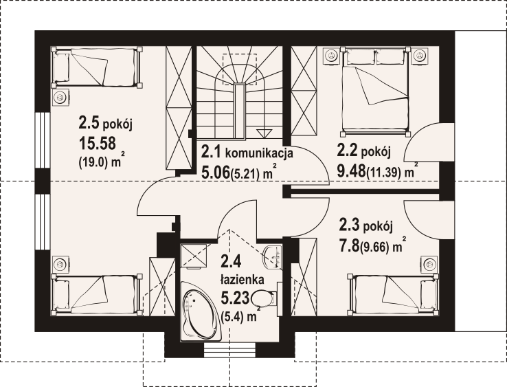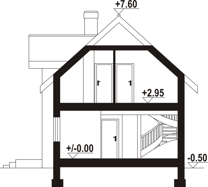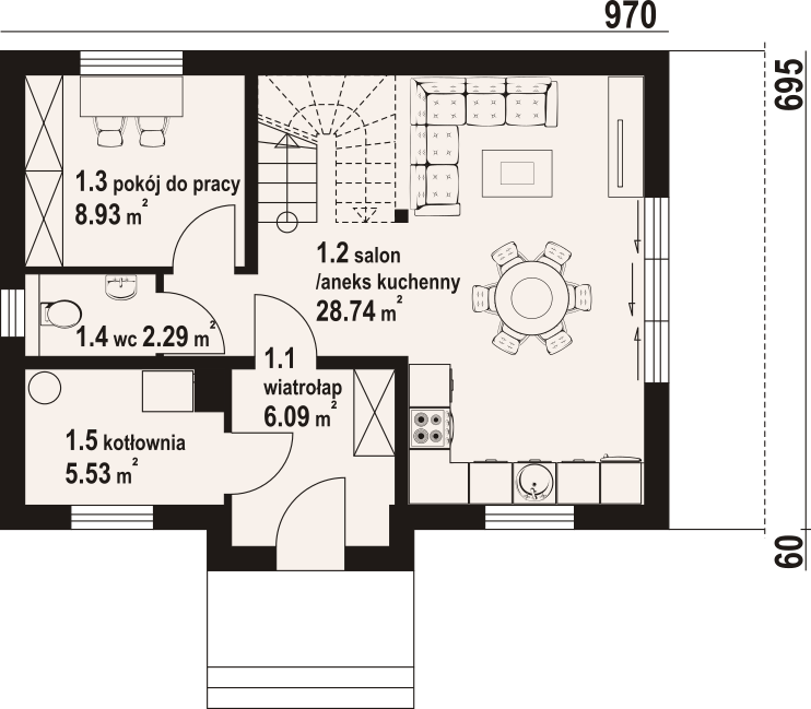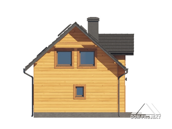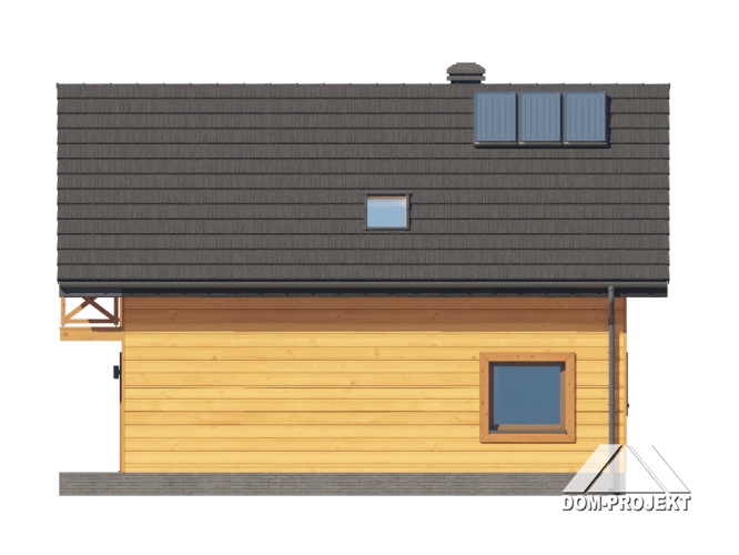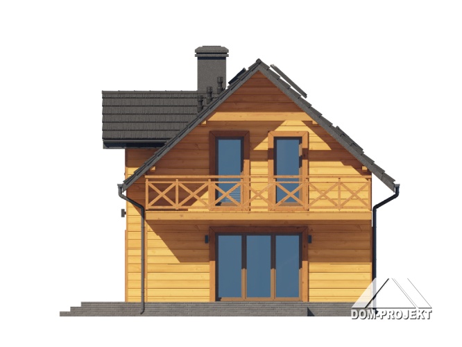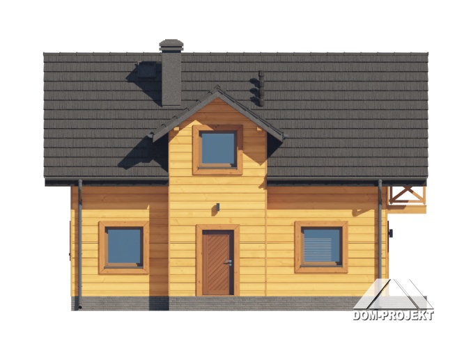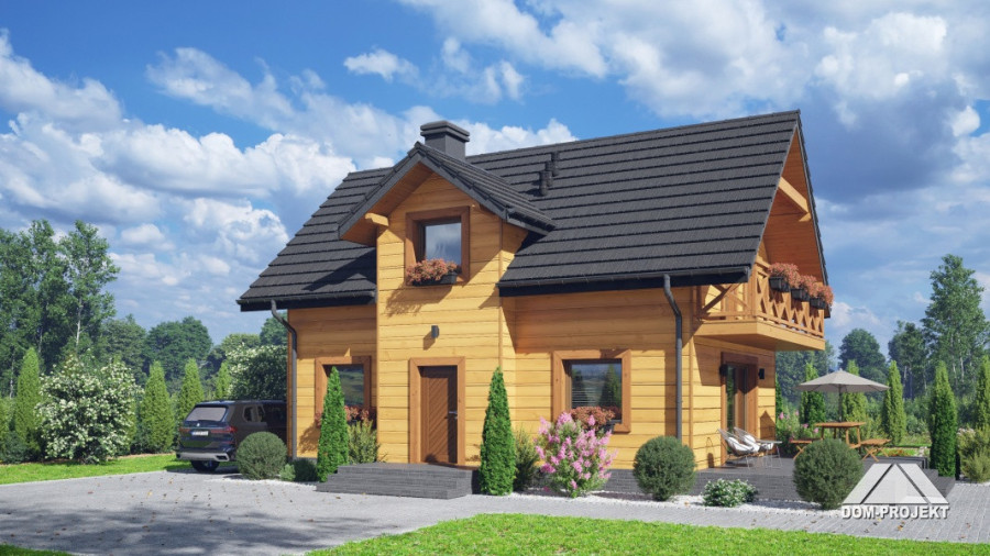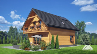 Dom w konstrukcji szkieletu drewnianego. Na parterze salon z aneksem kuchennym, wyjściem na taras i schodami na poddasze. Pokój do pracy, wc, kotłownia, wiatrołap. Na poddaszu trzy pokoje, łazienka, komunikacja oraz balkon. Zwarta bryła budynku oraz dach dwuspadowy sprzyjają szybkiej i taniej budowie oraz niskim kosztom eksploatacji.